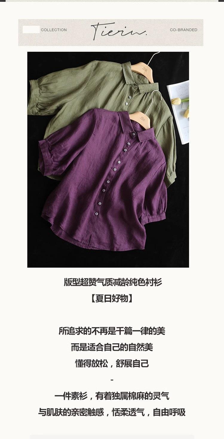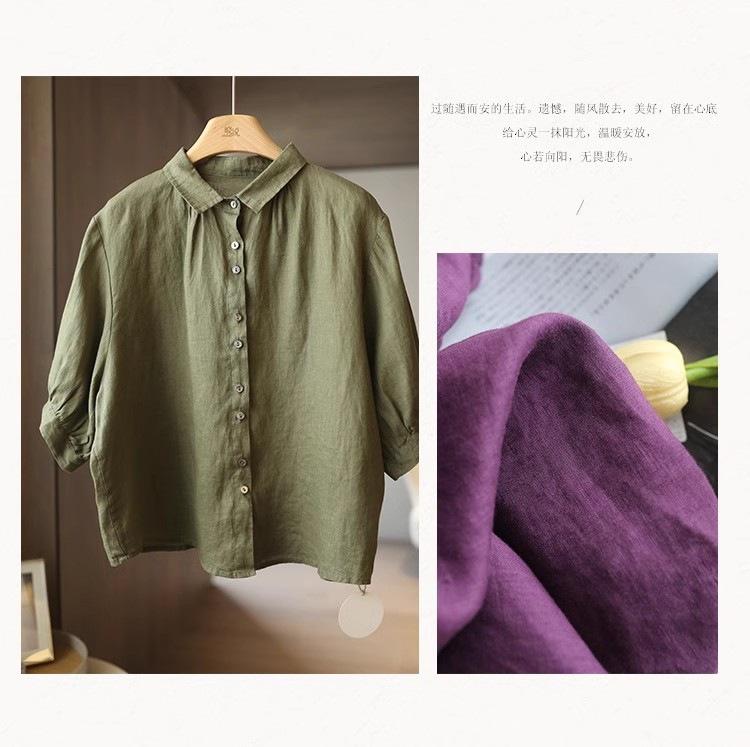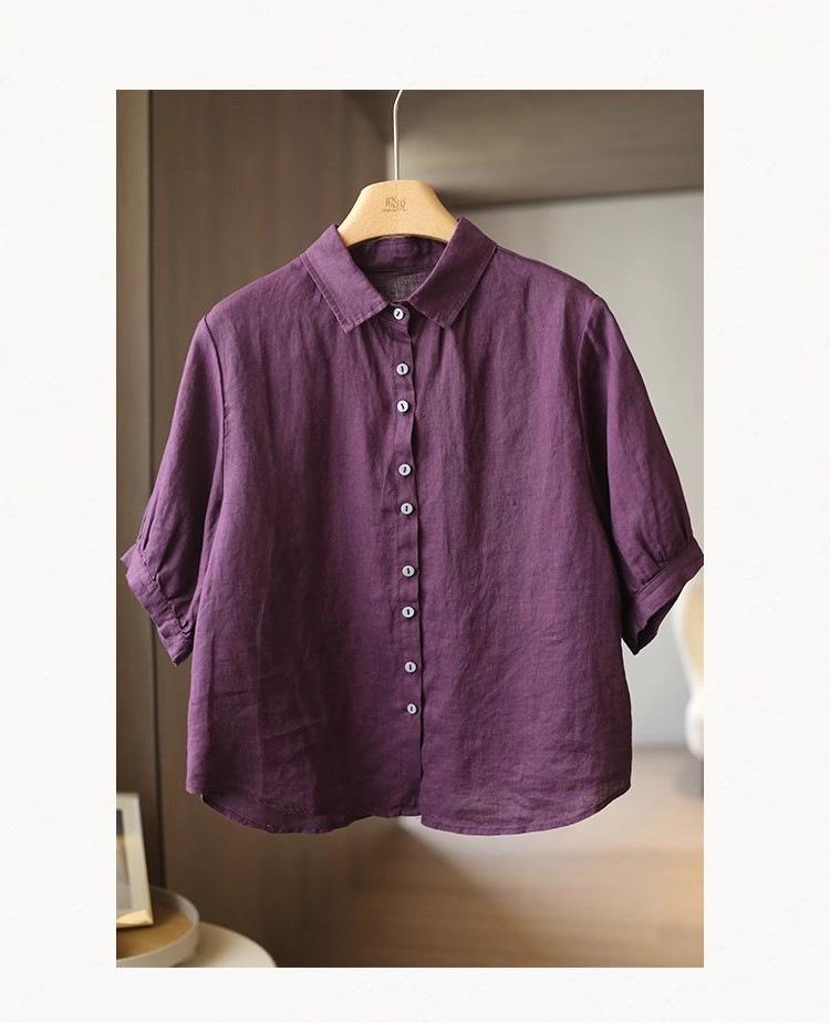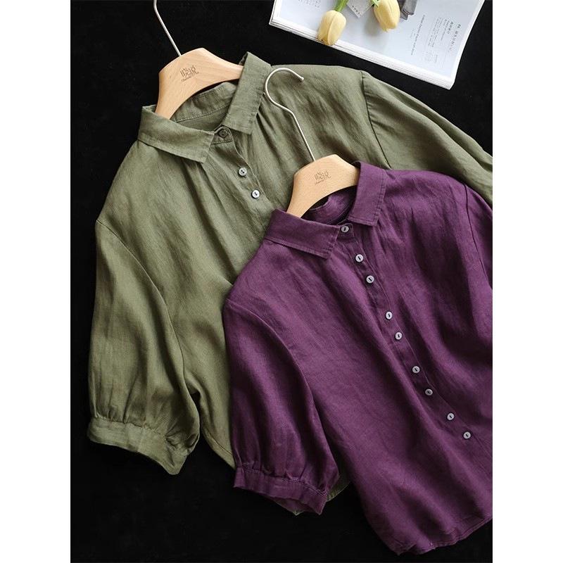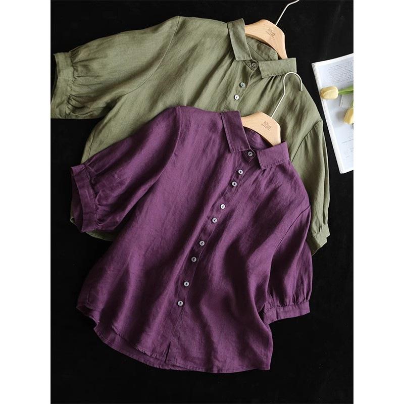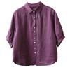 Verano 2025 Ocio Artístico Reductor de Edad Holgado Adelgazante Color Sólido Camisa de Lino Algodón Lino Top Manga Corta para Mujer