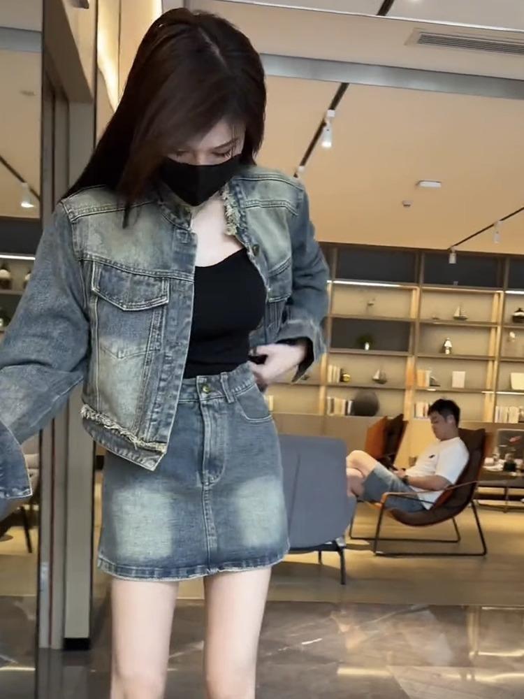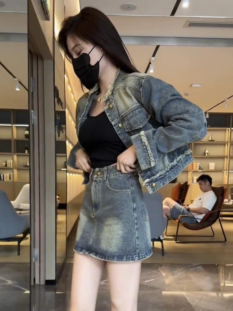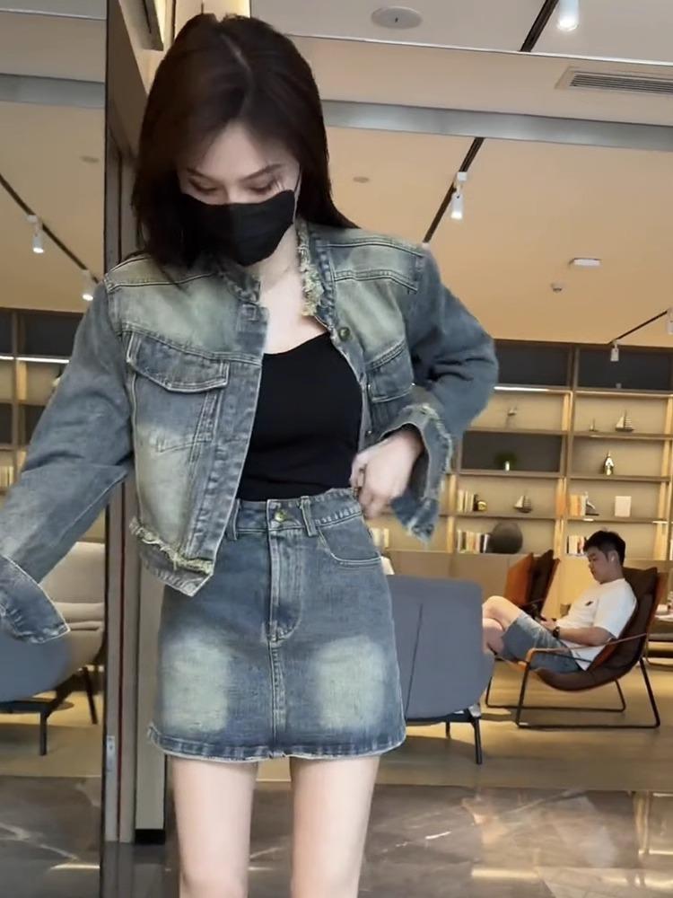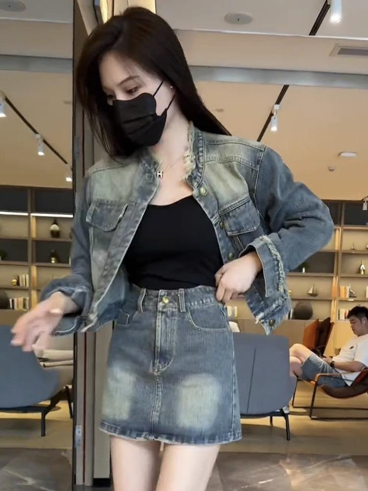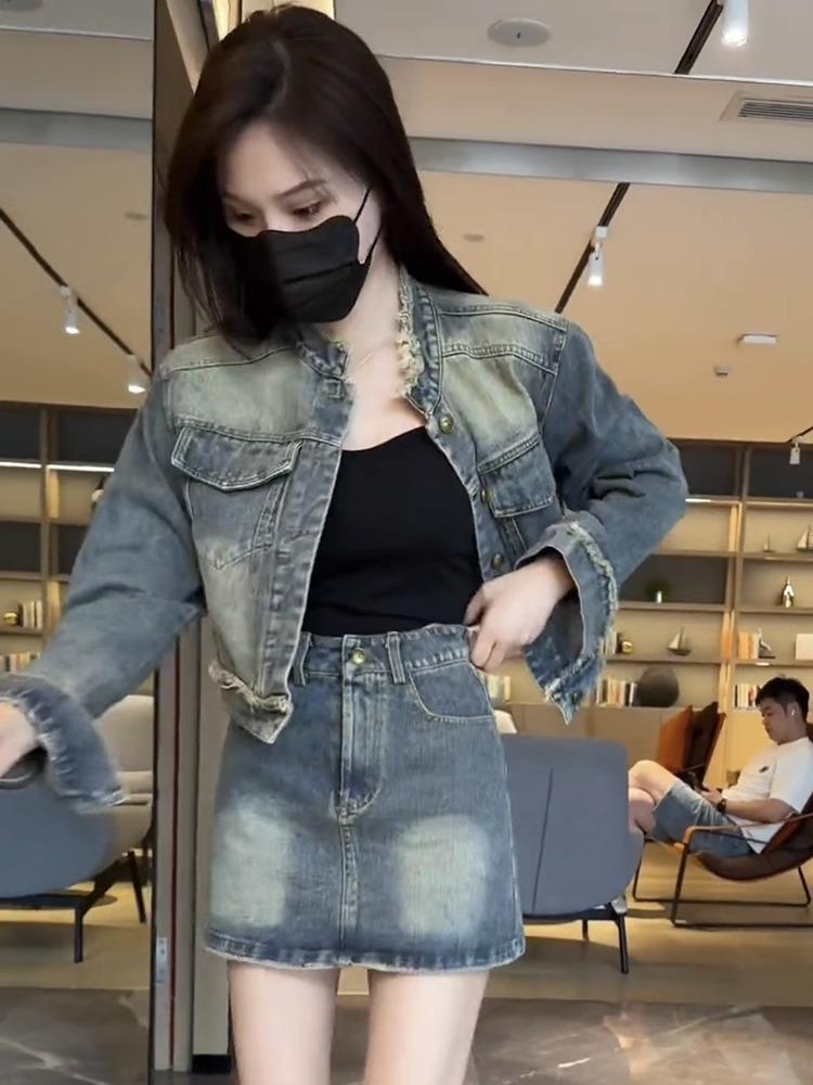 [two-piece set] denim jacket + denim skirt, [single piece] denim jacket, [single piece] denim skirt