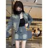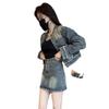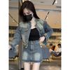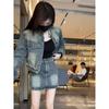 Conjunto de dos piezas de abrigo vaquero corto vintage de otoño con falda adelgazante de cintura alta nueva para mujer