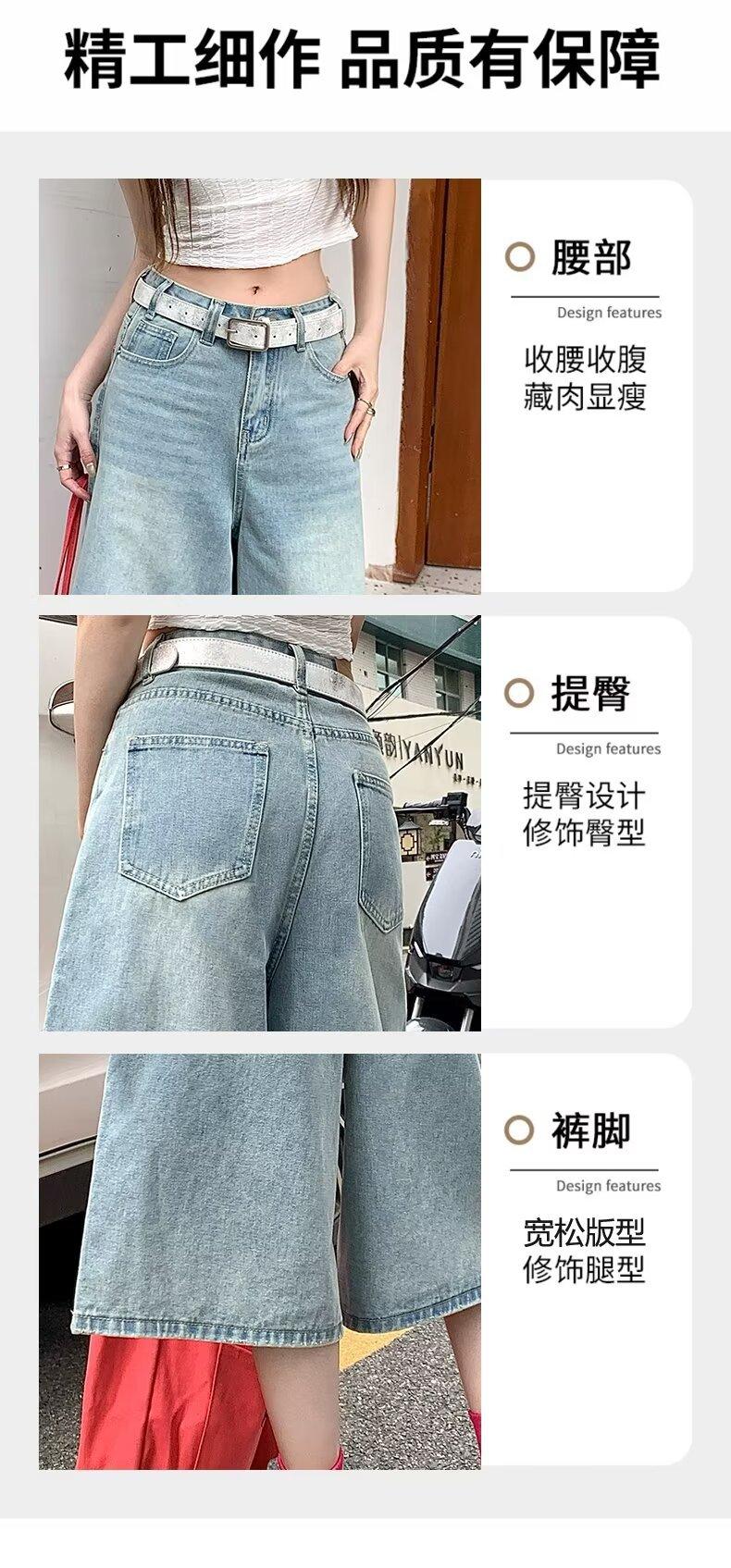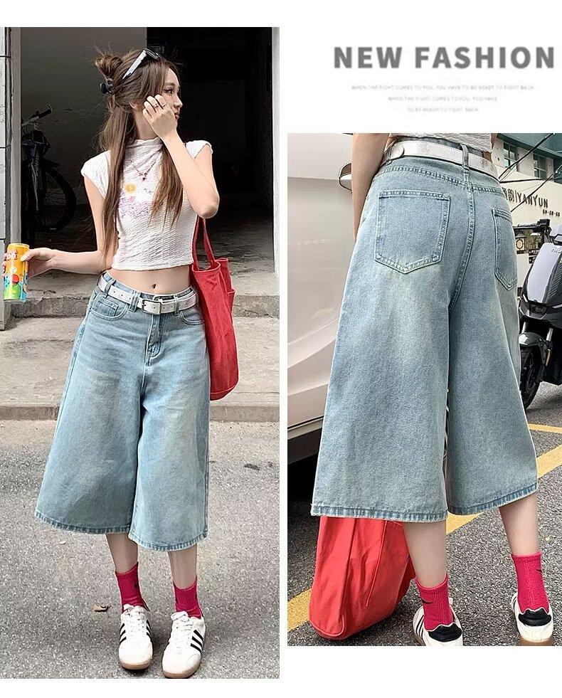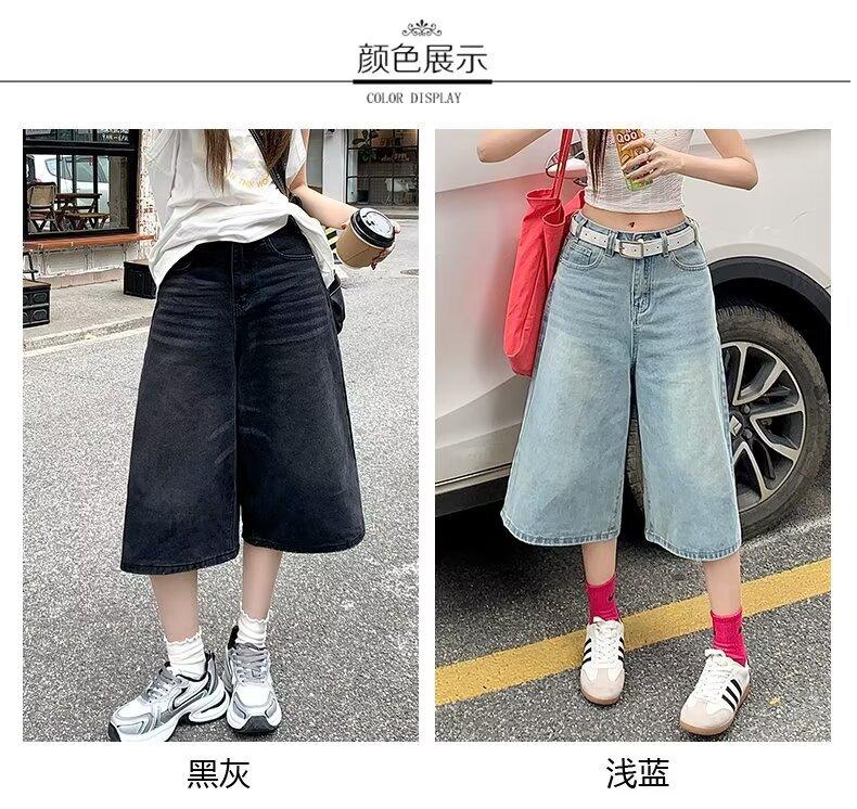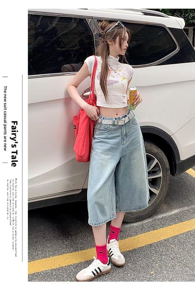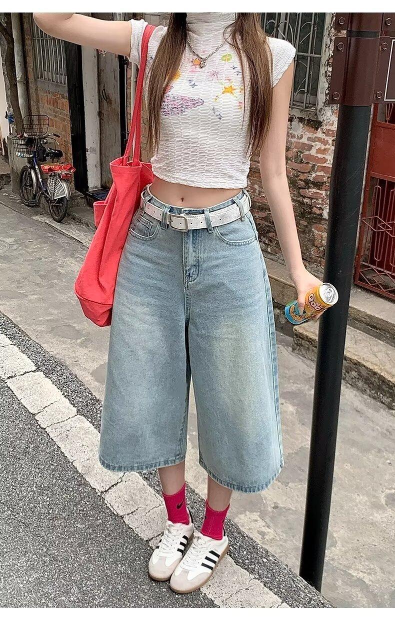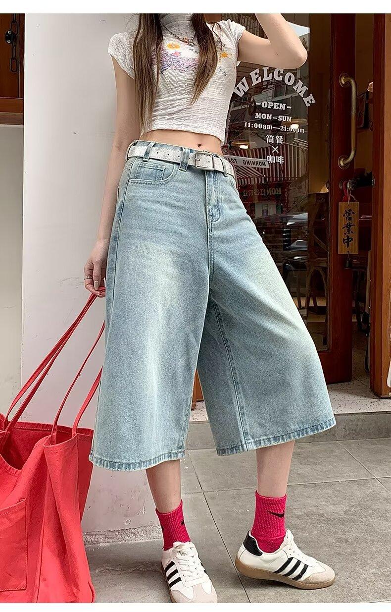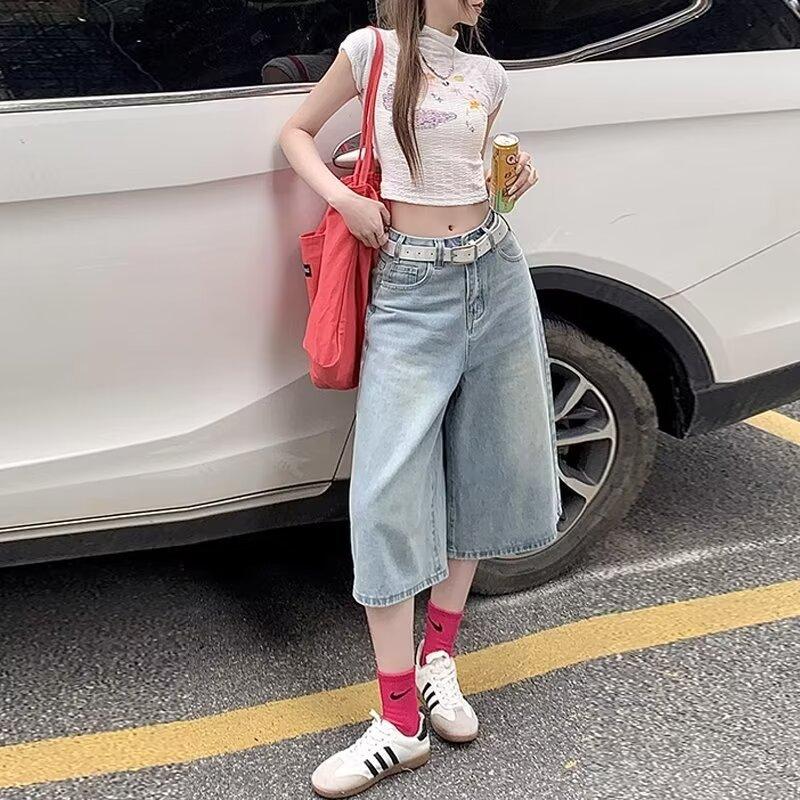 Jeans rectos cropped de color claro para mujer, Verano 2025 Nuevo Cintura alta Suelto Adelgazante Casual Versátil Shorts de pierna ancha