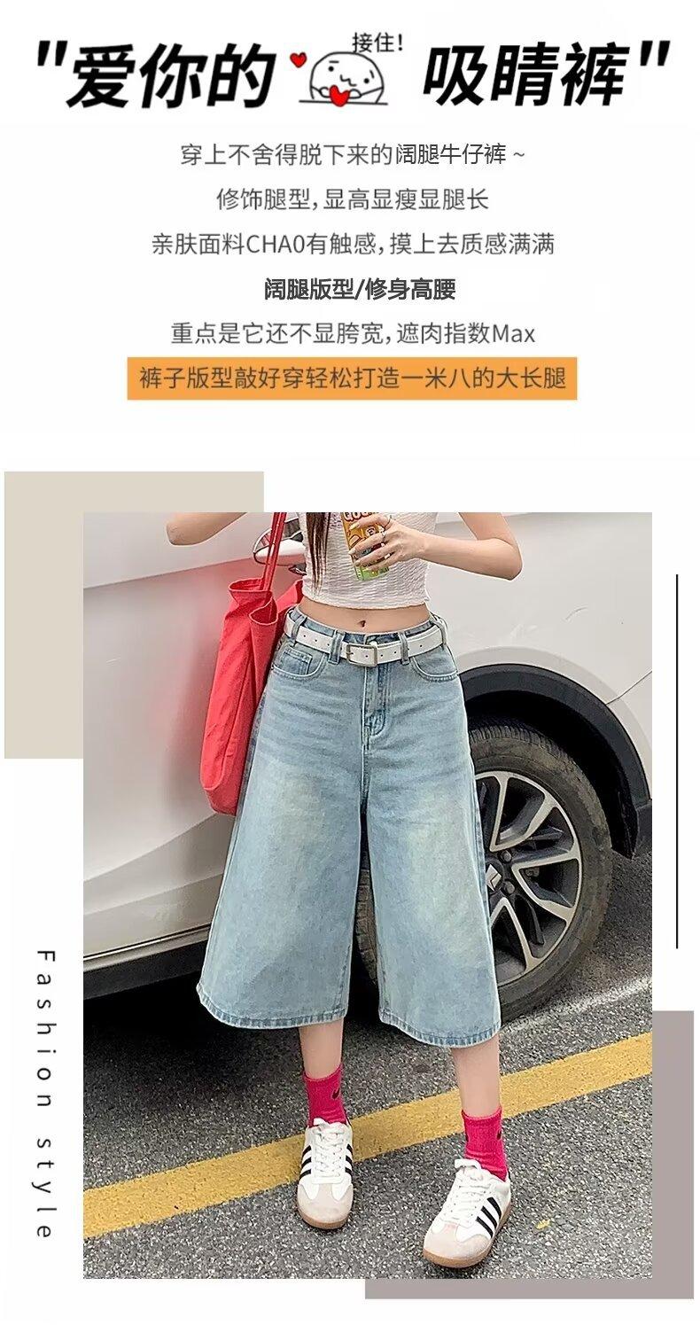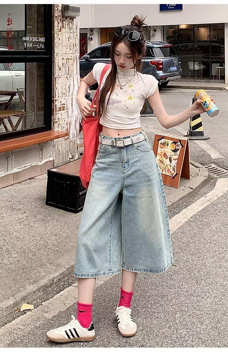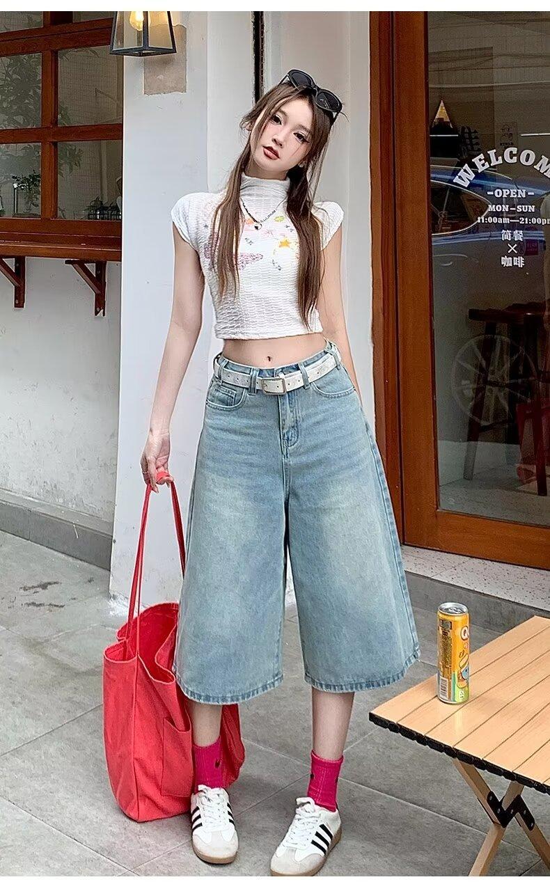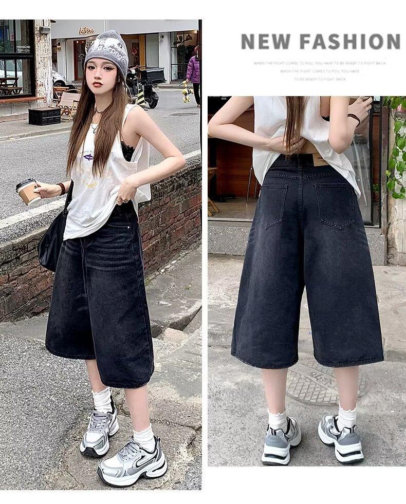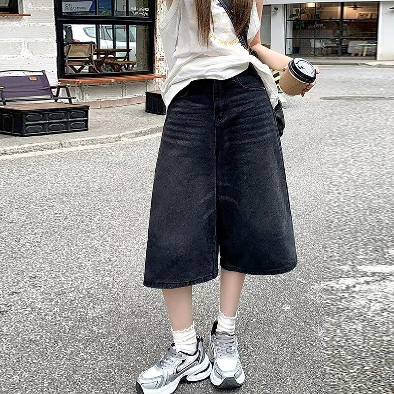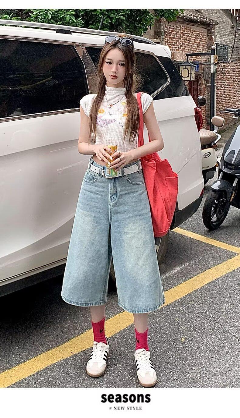 Jeans rectos cropped de color claro para mujer, Verano 2025 Nuevo Cintura alta Suelto Adelgazante Casual Versátil Shorts de pierna ancha