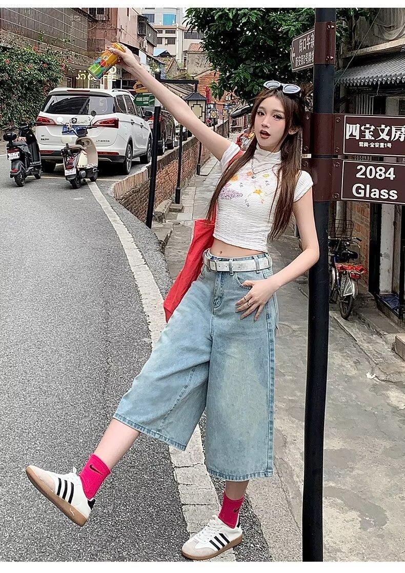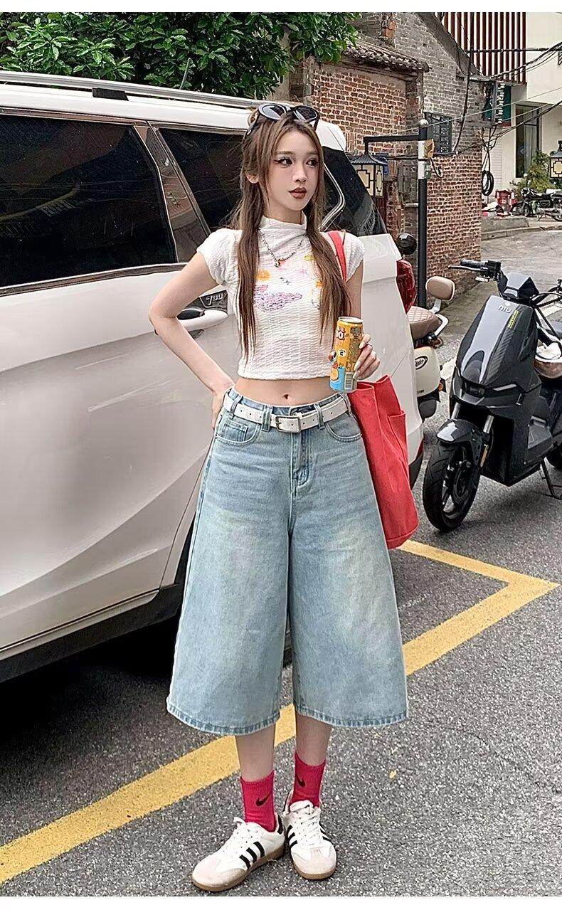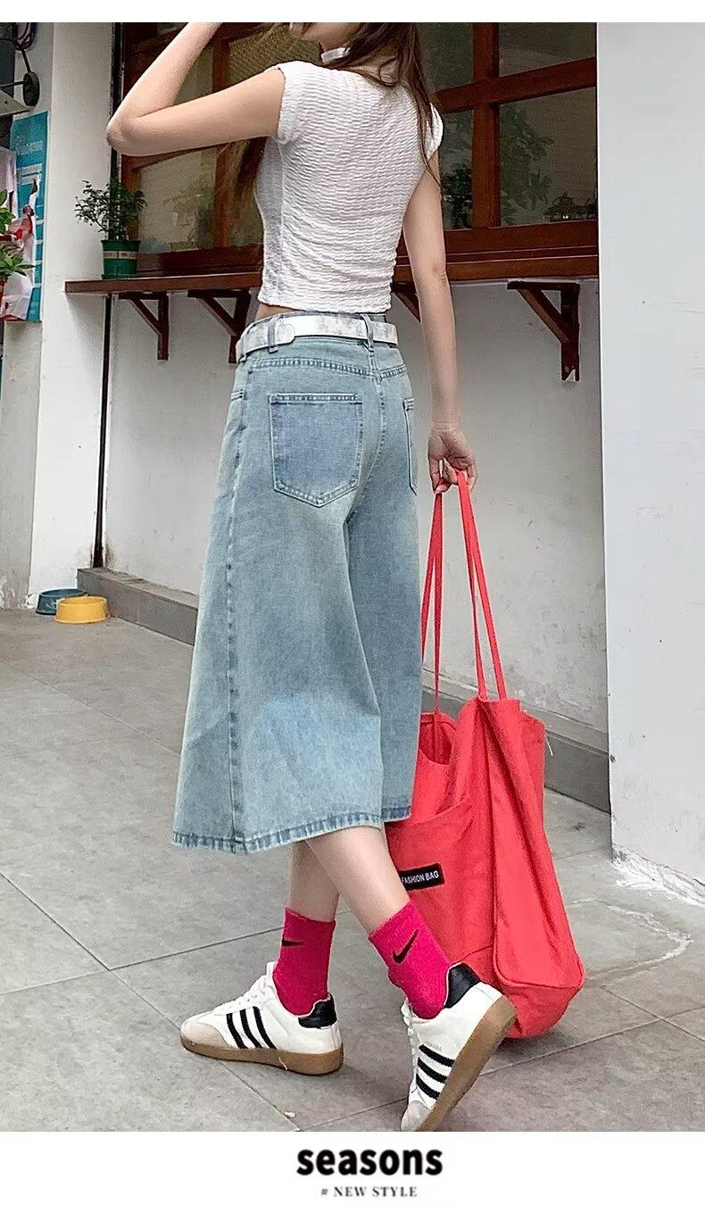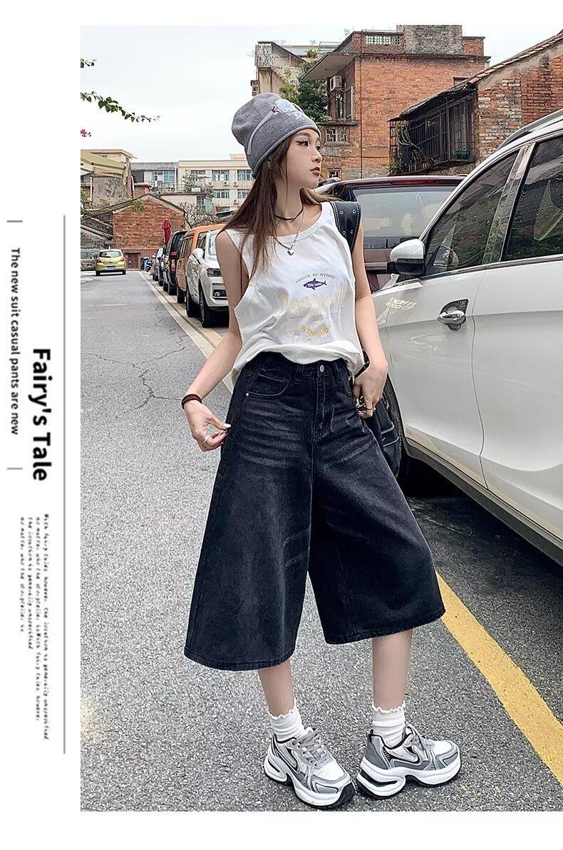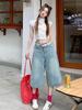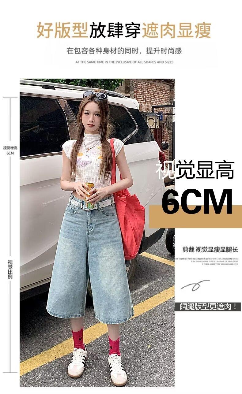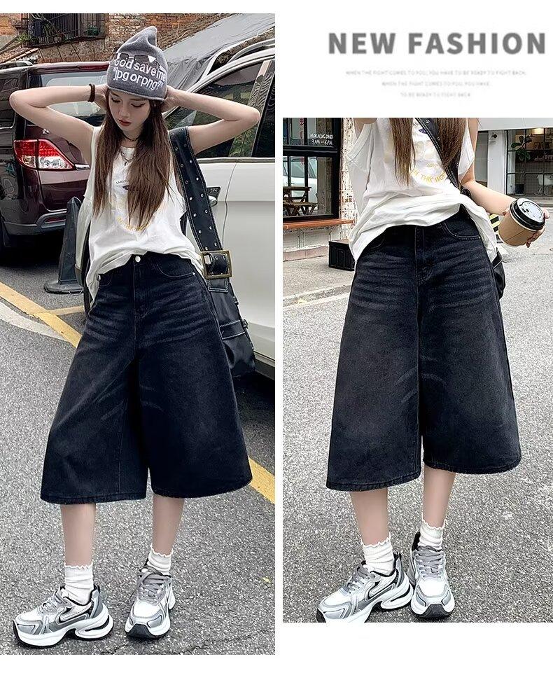 Jeans rectos cropped de color claro para mujer, Verano 2025 Nuevo Cintura alta Suelto Adelgazante Casual Versátil Shorts de pierna ancha