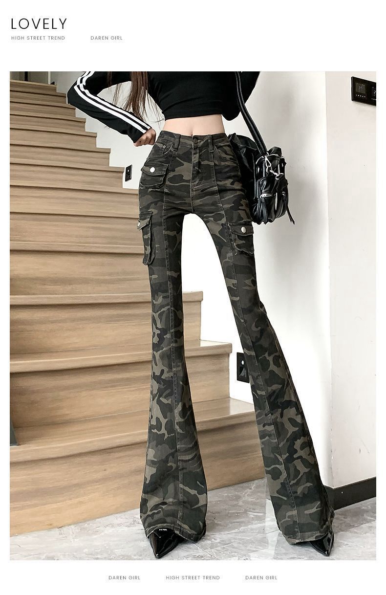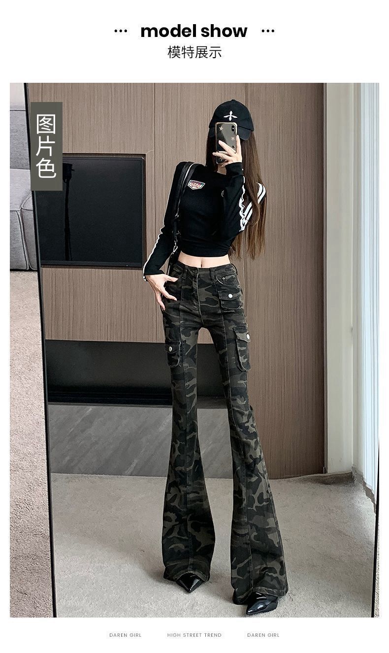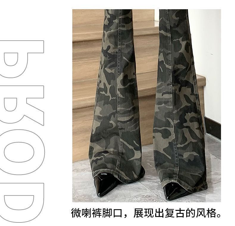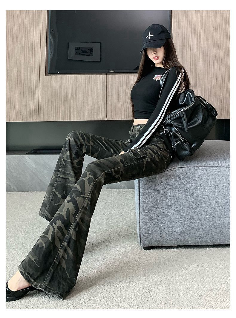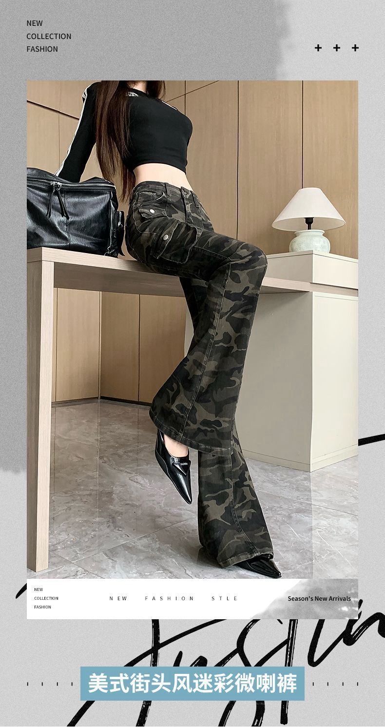 Camuflaje American High Street Jeans Microacampanados de Cintura Baja para Mujer con Pantalones Horseshoe Rectos Adelgazantes de Cintura Alta