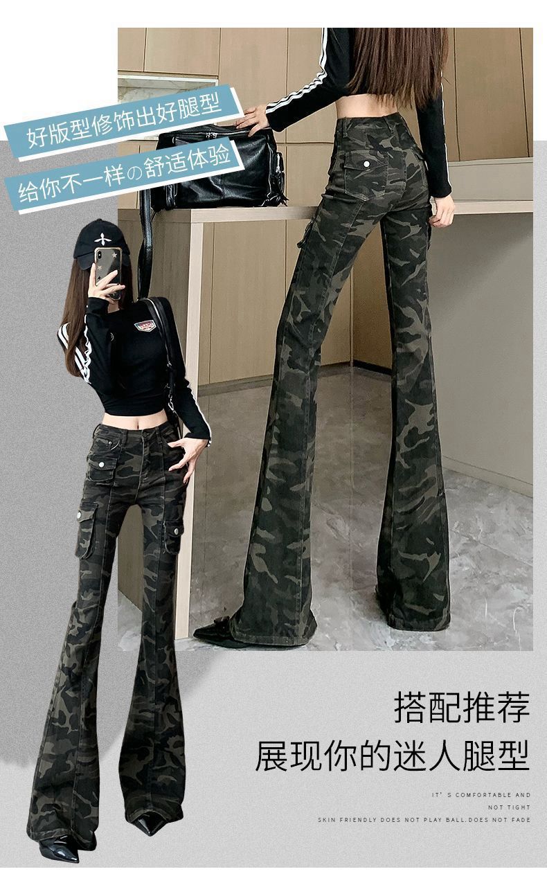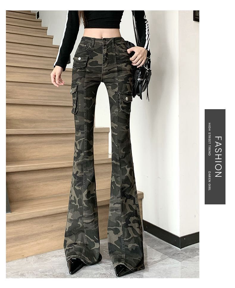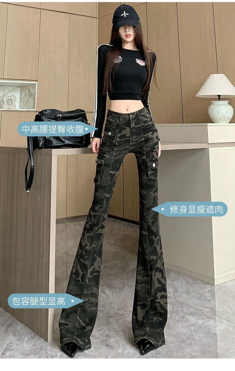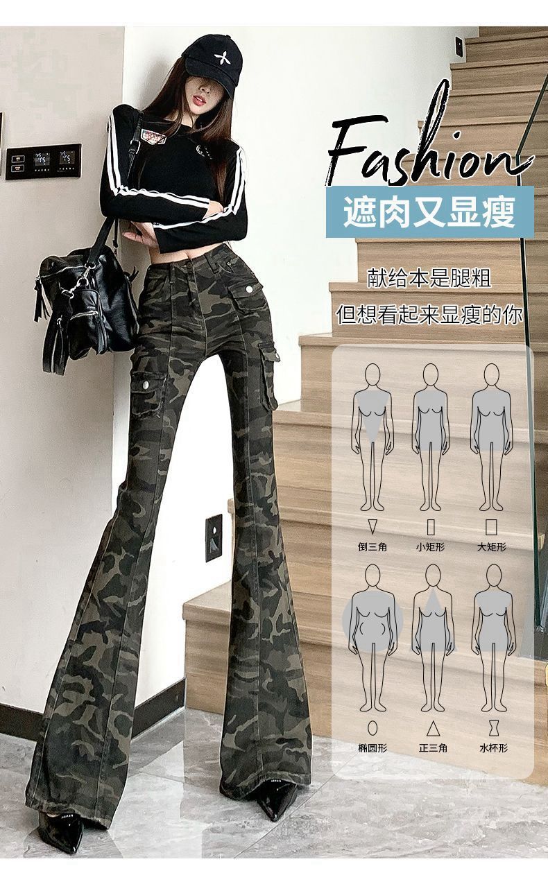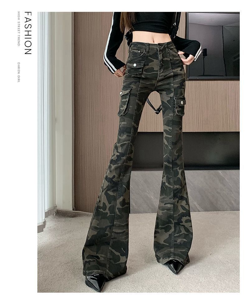 Camuflaje American High Street Jeans Microacampanados de Cintura Baja para Mujer con Pantalones Horseshoe Rectos Adelgazantes de Cintura Alta