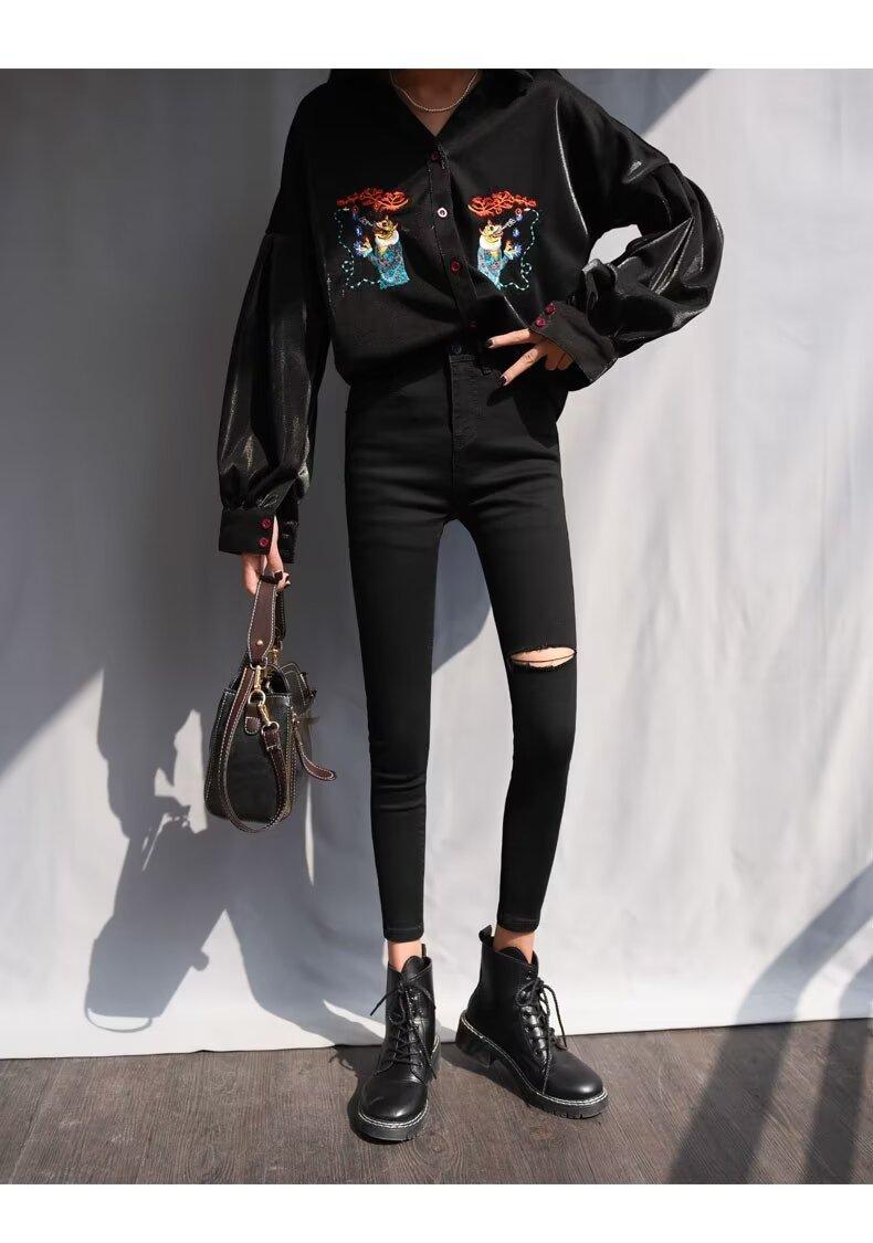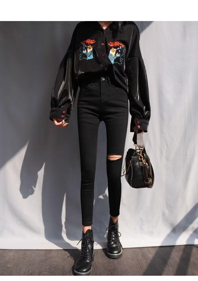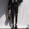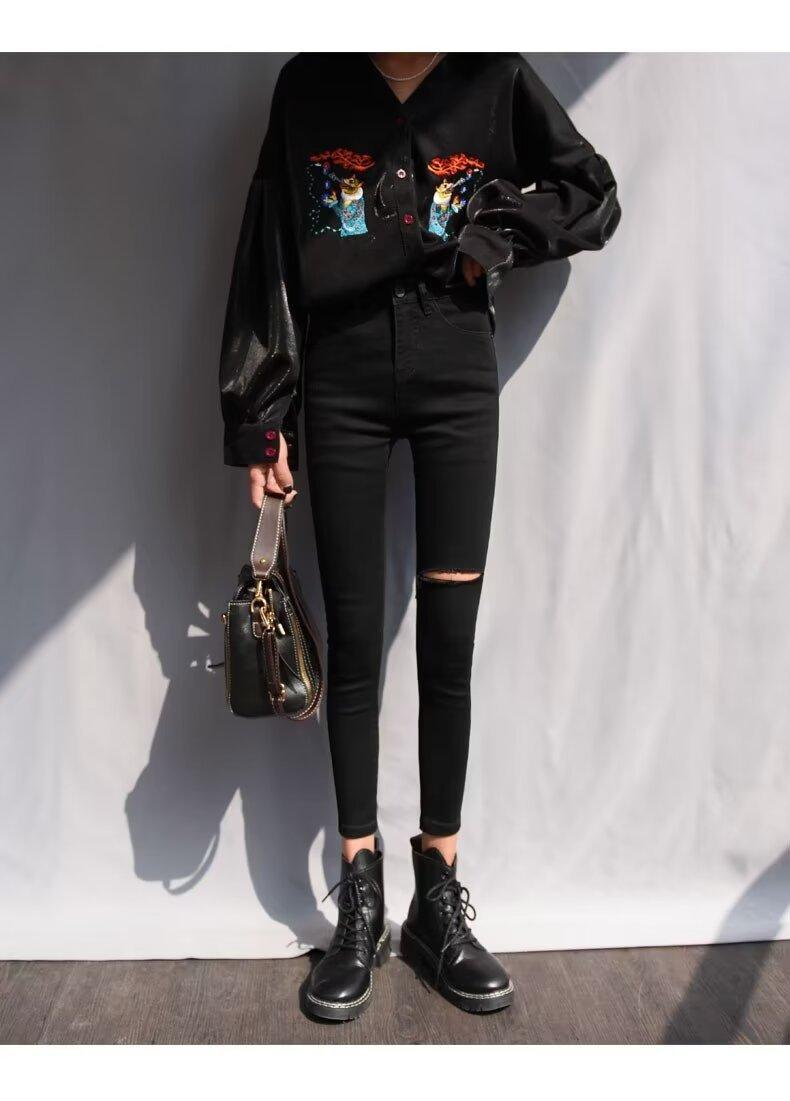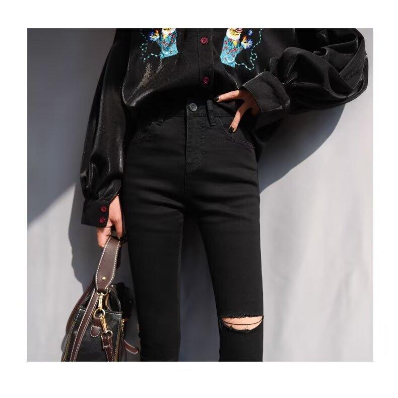 2024 Nuevo Primavera y Verano Delgado Rodilla Rota Jeans Nueve Puntos de Mujer Ajustados Cintura Alta Slim Pantalones de Mendigo de Pantorrilla
