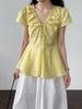 Luxi Retro Francés Cuello en V Plisado con Cordones Camisa de Manga Corta para Mujer Verano Nuevo Camiseta Top de Cintura Ajustada Camisa Pequeña 7103