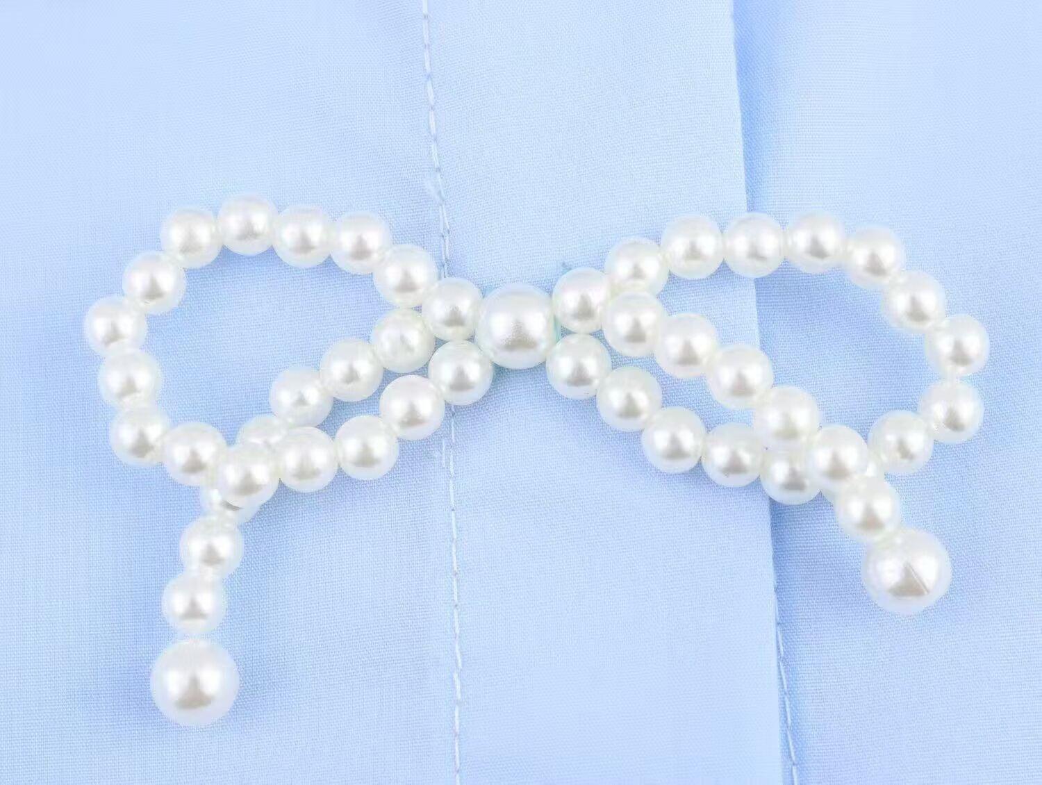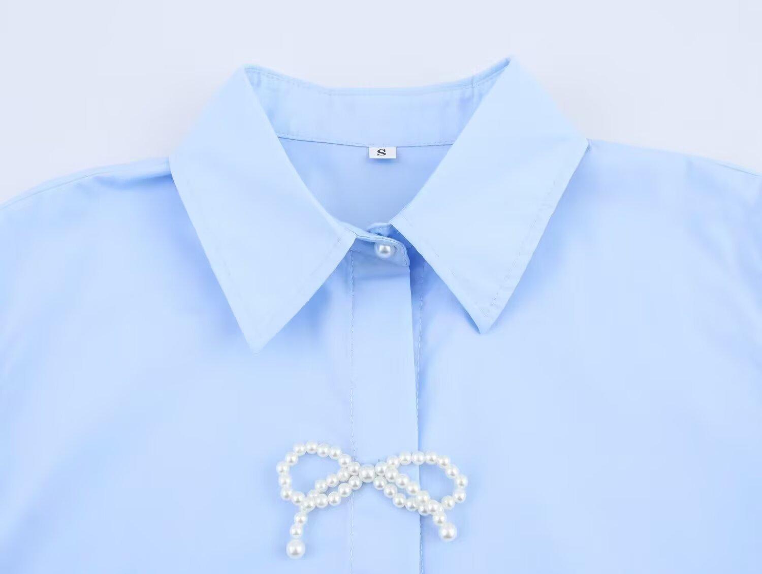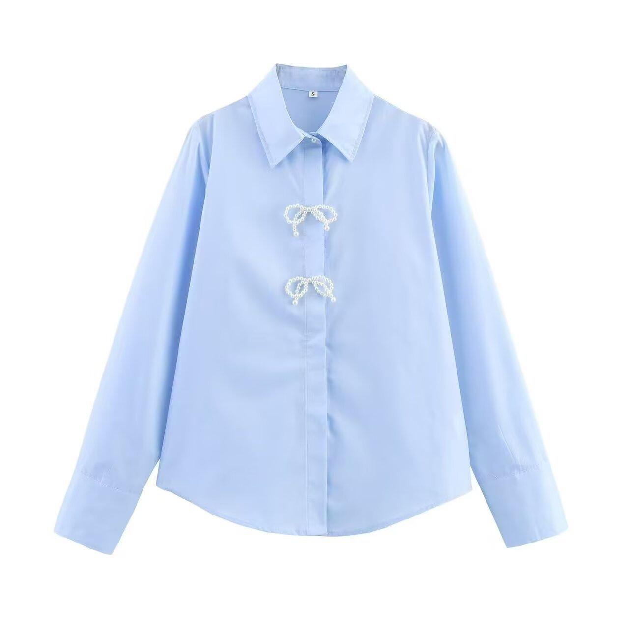 Comercio Exterior Ropa Europea y Americana al por Mayor 2025 Verano Nuevo Estilo Camisa Casual Sencilla y a la Moda Decorada con Lazo de Perla Artificial