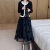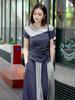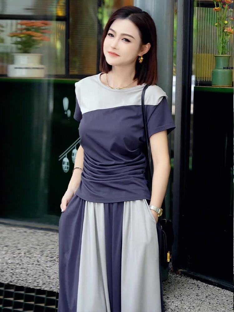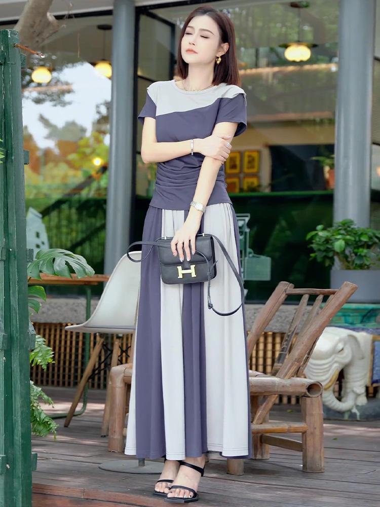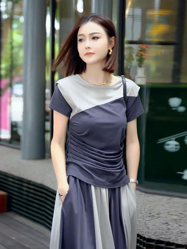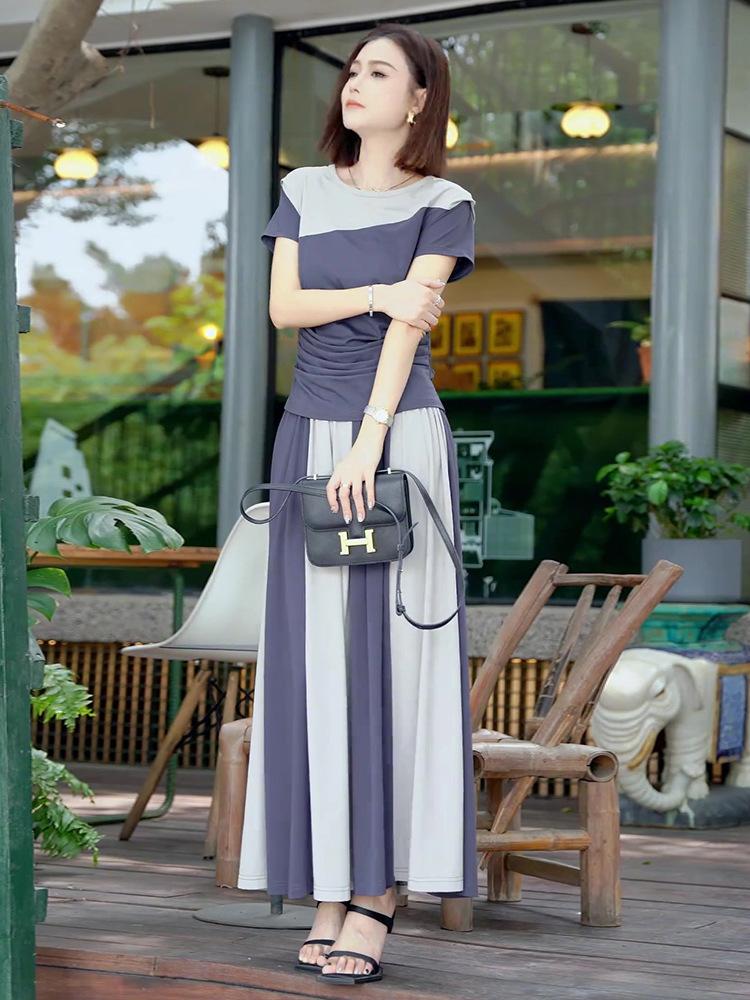 Camiseta de Manga Corta de Empalme de Moda de Gama Alta con Cuello Redondo y Corte Slim Falda Larga 2025 Verano Nuevo Diseño Elegante Conjunto de Dos Piezas para Mujer