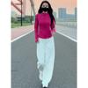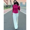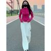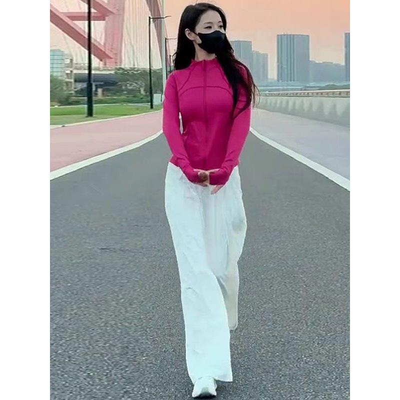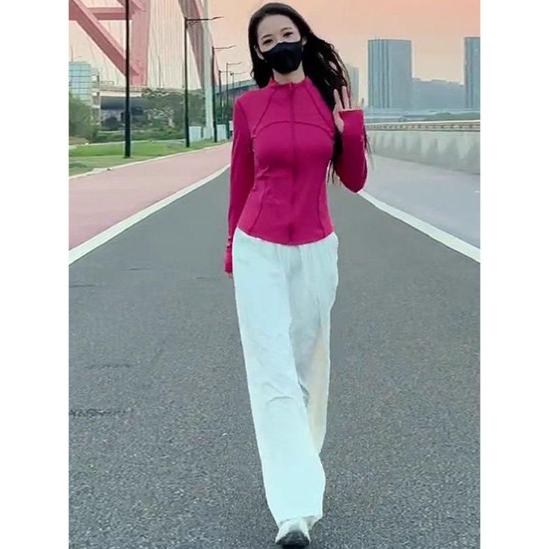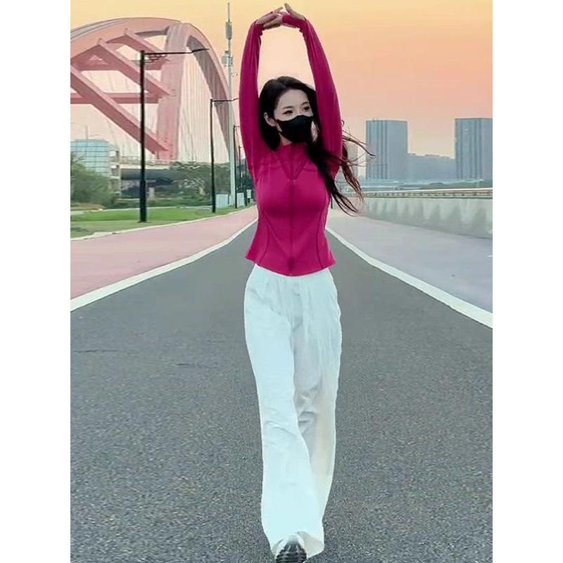 Ropa de Entrenamiento para Correr, Trajes Deportivos Casuales para Mujer, Primavera Ajustado, Tops Elegantes Rojo Rosa, Pantalones Blancos de Pierna Ancha Conjunto de Dos Piezas