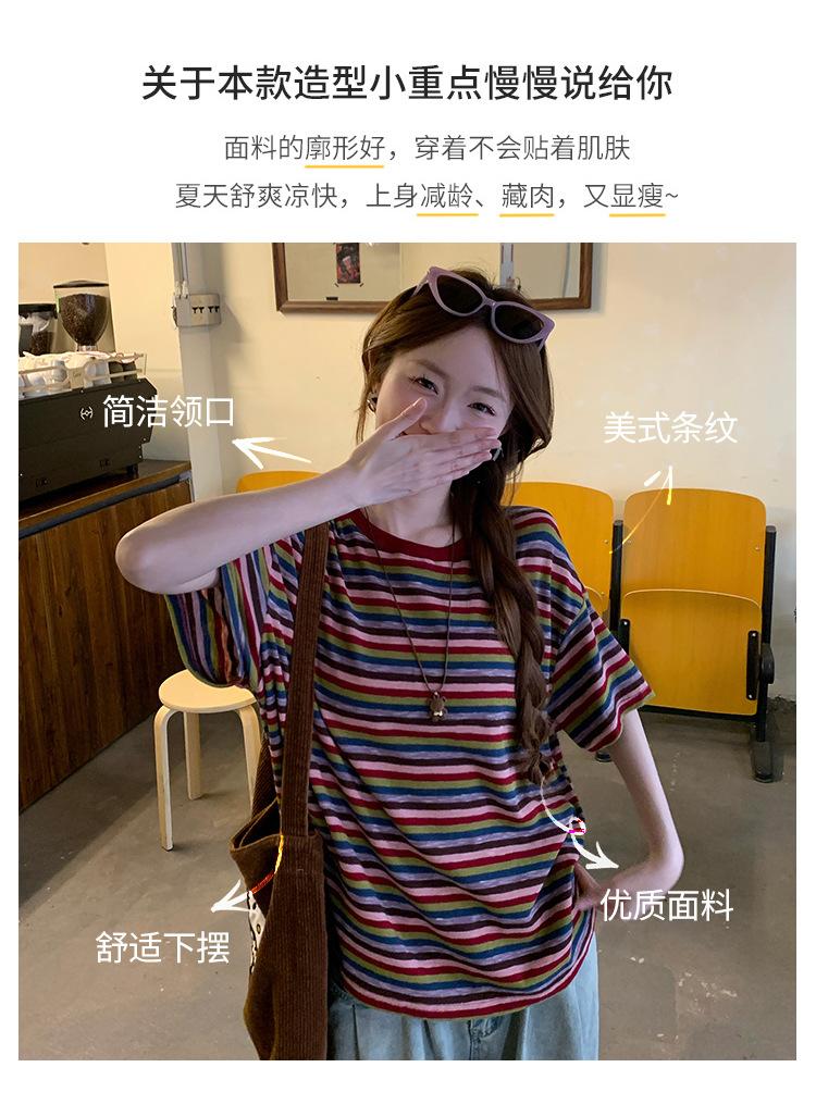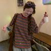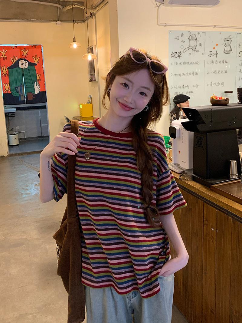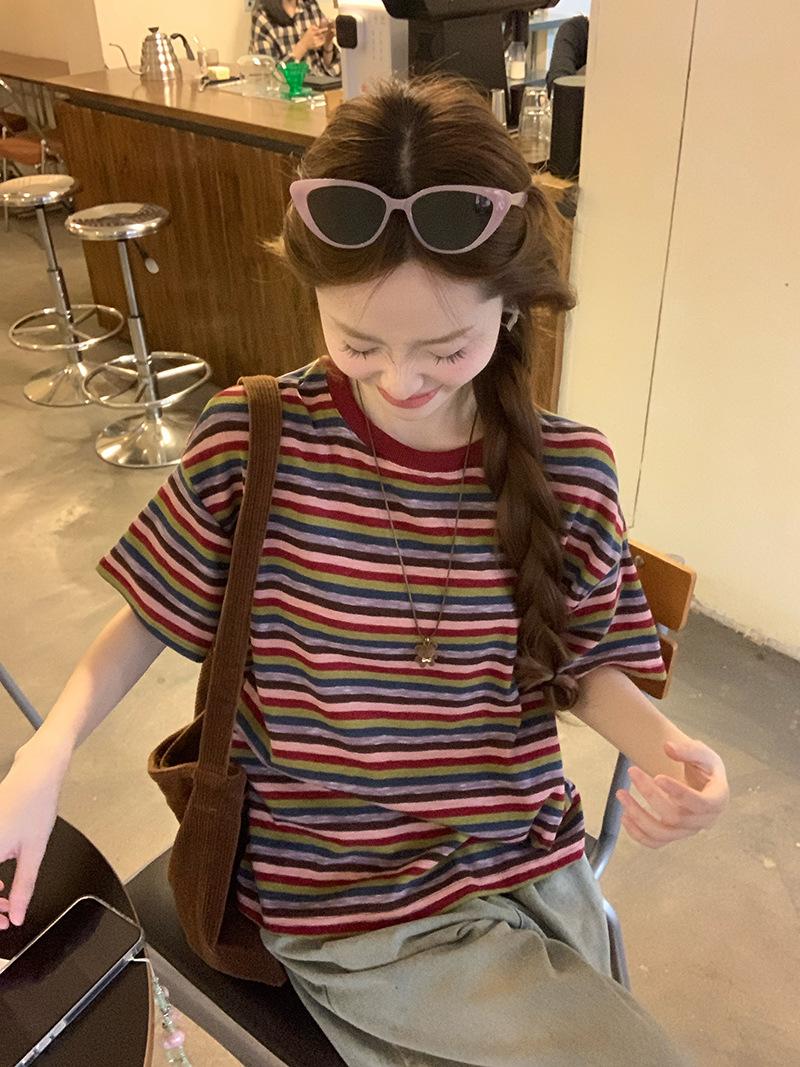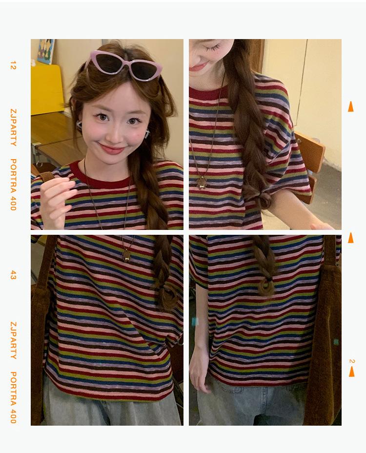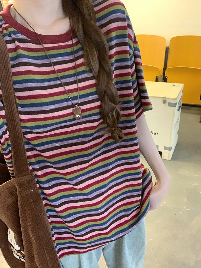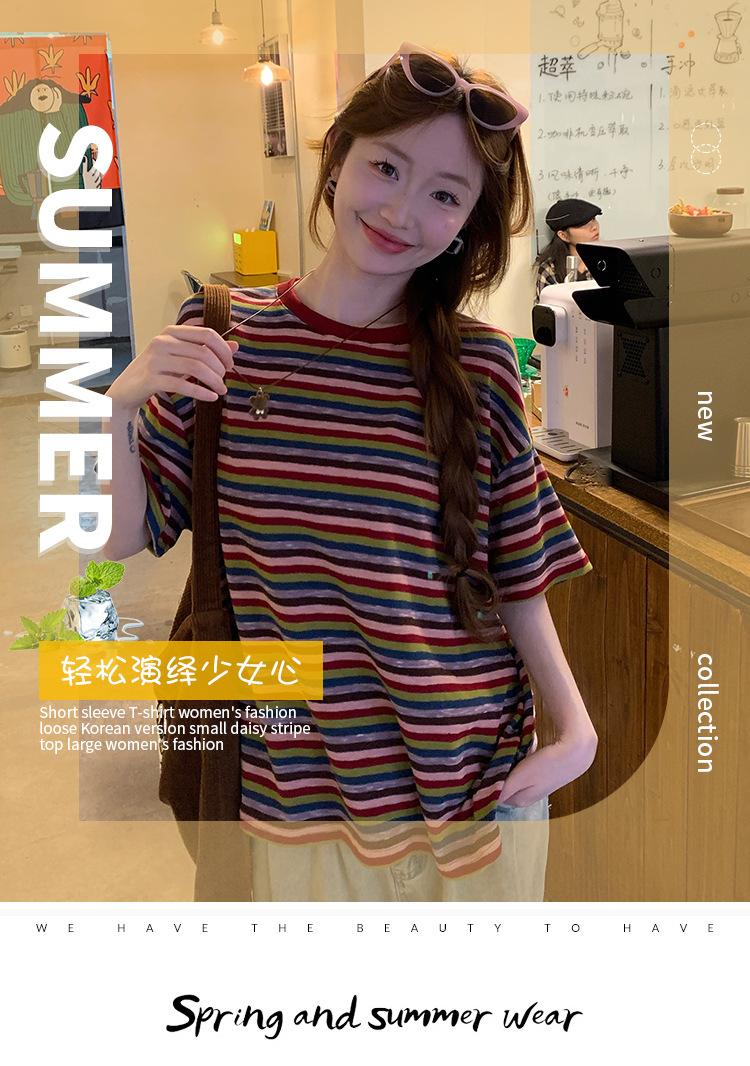 Top de Moda Rayado Colorido de Manga Corta para Mujer 2025 Verano Nuevo Bloque de Color Cuello Redondo Nicho Camiseta Suelta Adelgazante