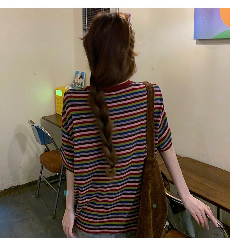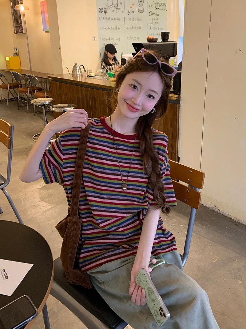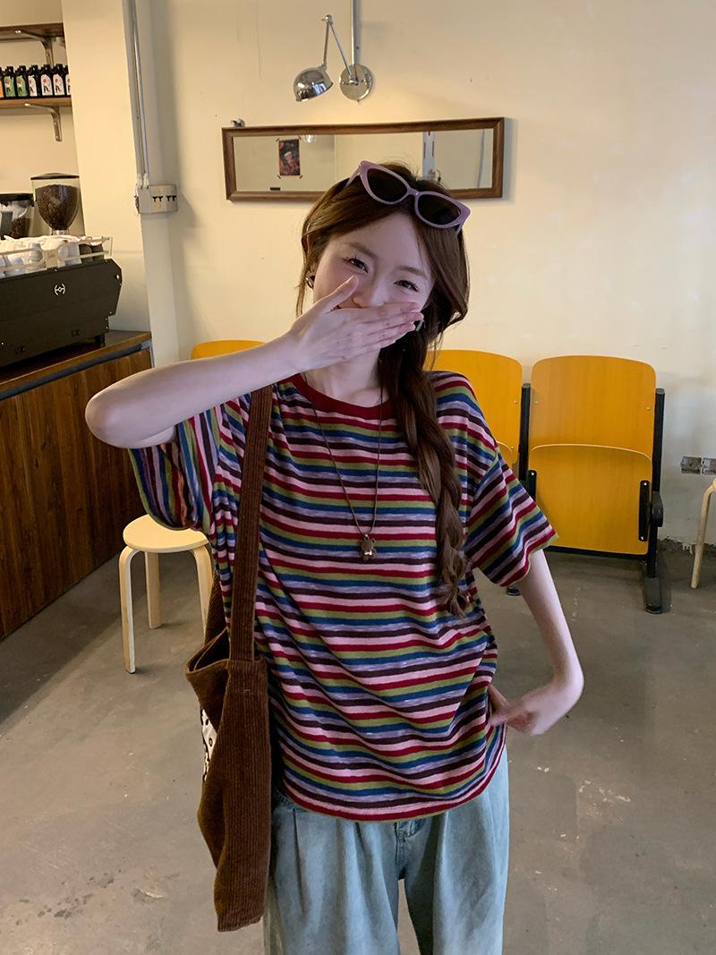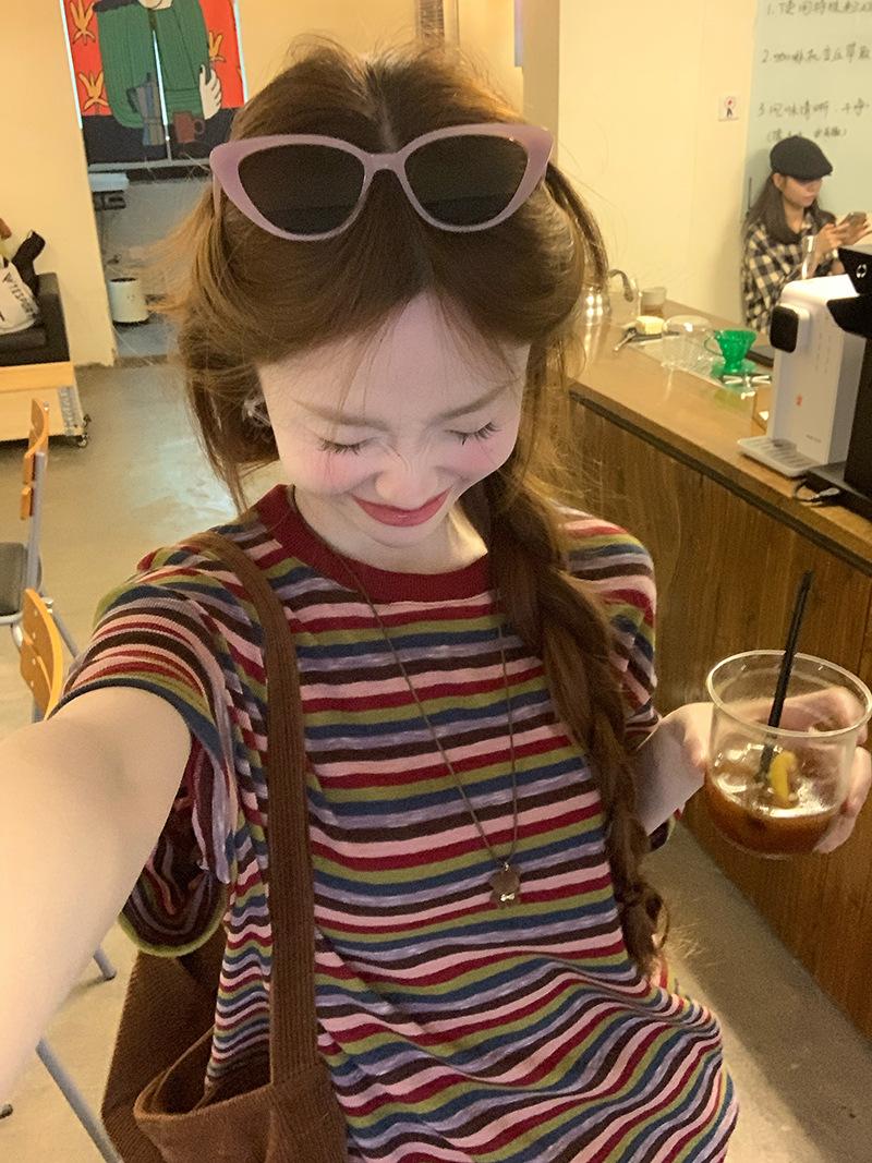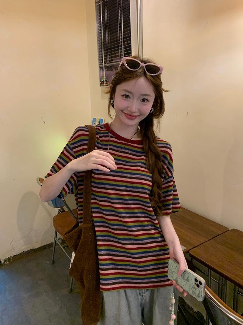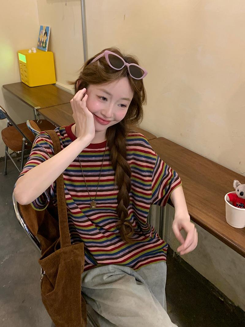 Top de Moda Rayado Colorido de Manga Corta para Mujer 2025 Verano Nuevo Bloque de Color Cuello Redondo Nicho Camiseta Suelta Adelgazante