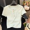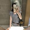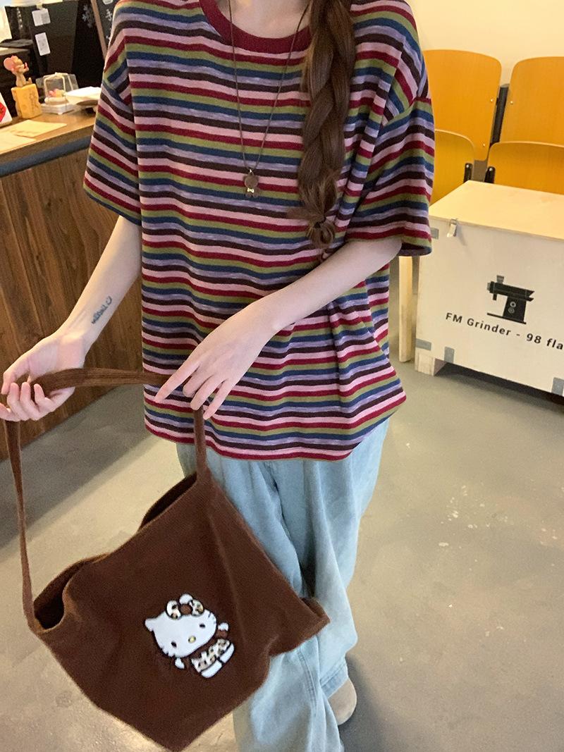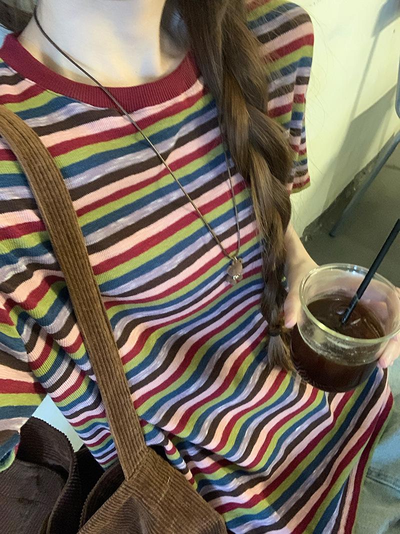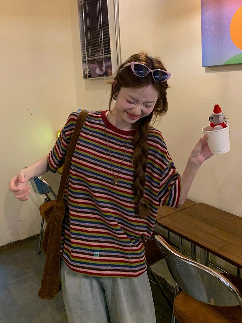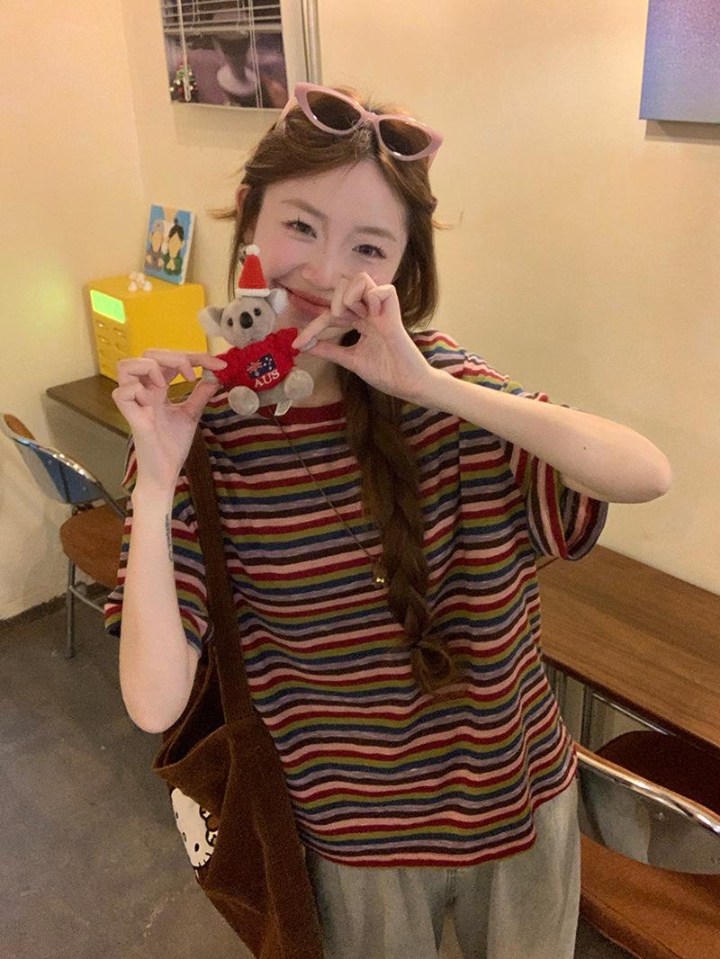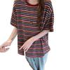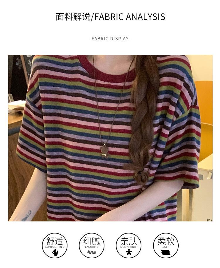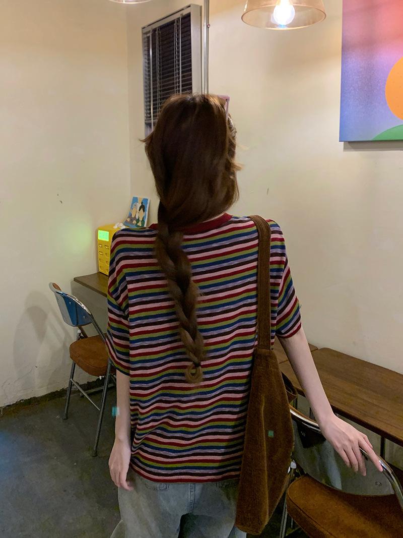 Top de Moda Rayado Colorido de Manga Corta para Mujer 2025 Verano Nuevo Bloque de Color Cuello Redondo Nicho Camiseta Suelta Adelgazante