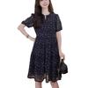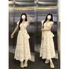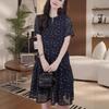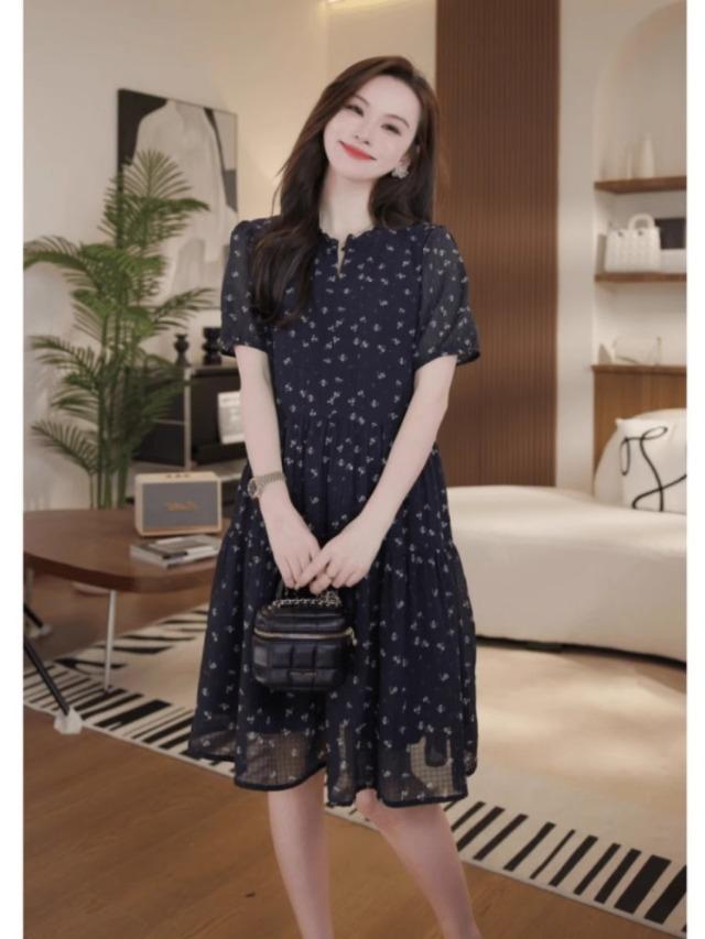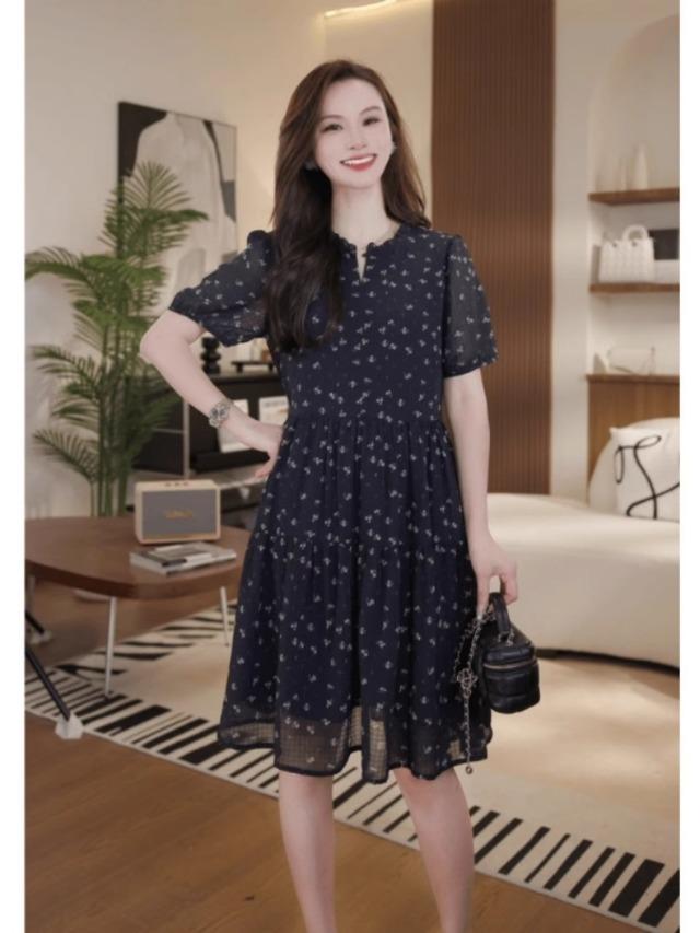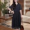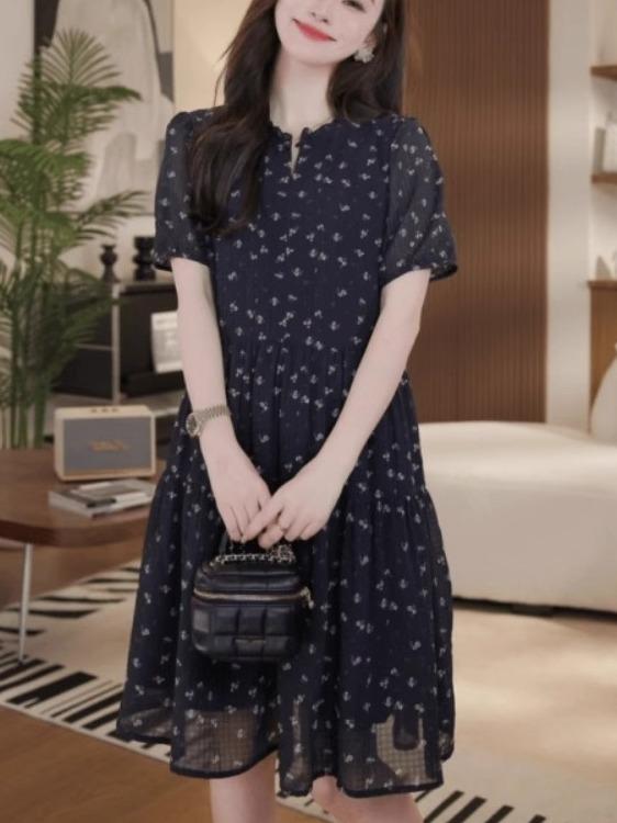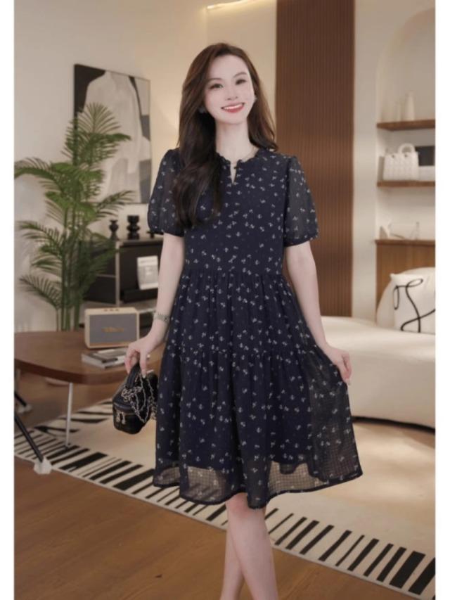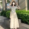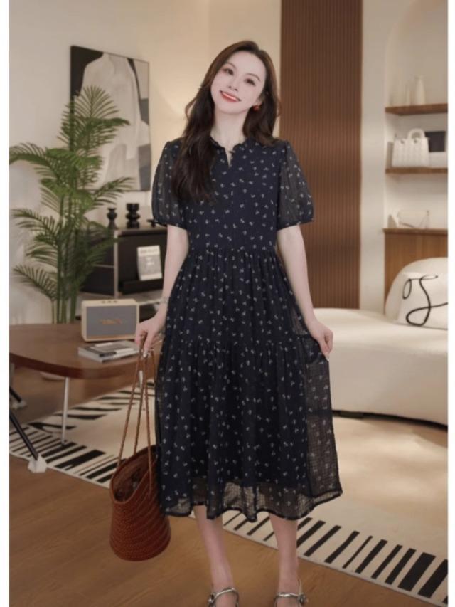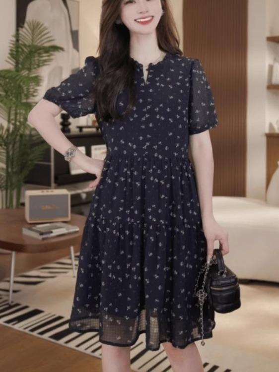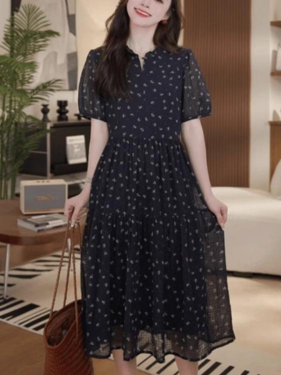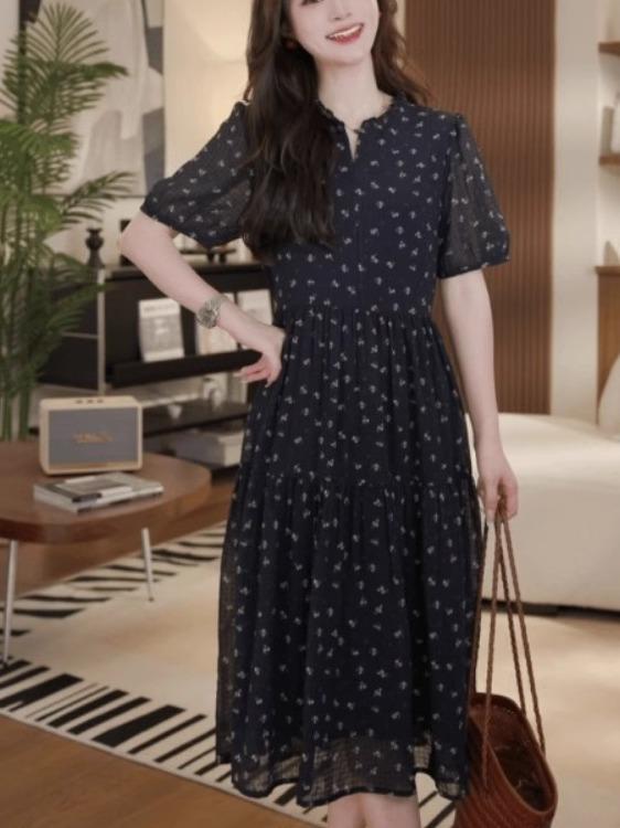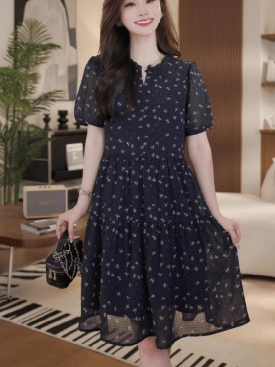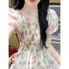 Vestido Jersey Floral Francés de Manga Abullonada con Cuello en V para Mujer 2025 Verano Nuevo Estilo Lazo en la Cintura Falda Midi