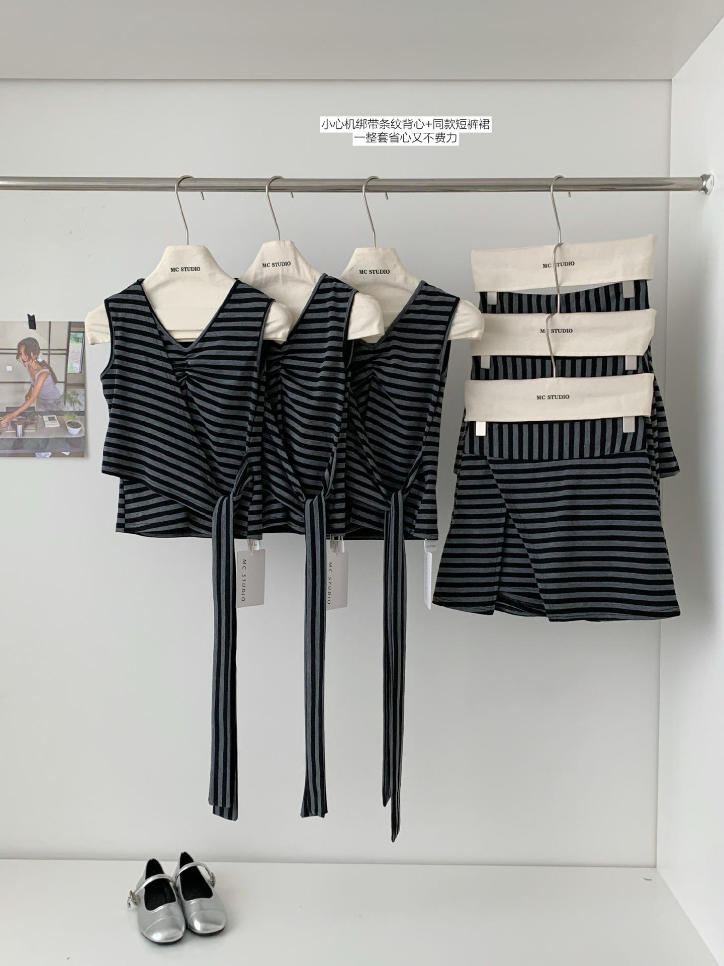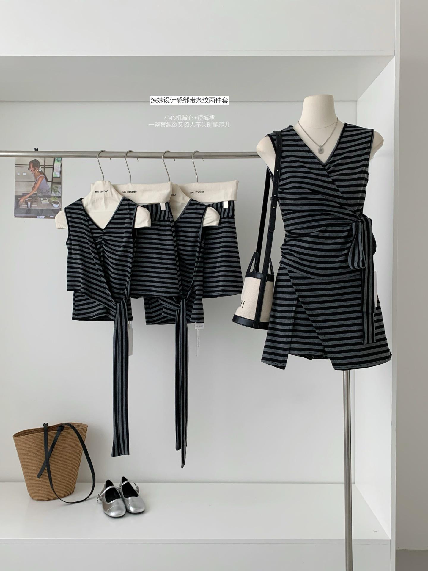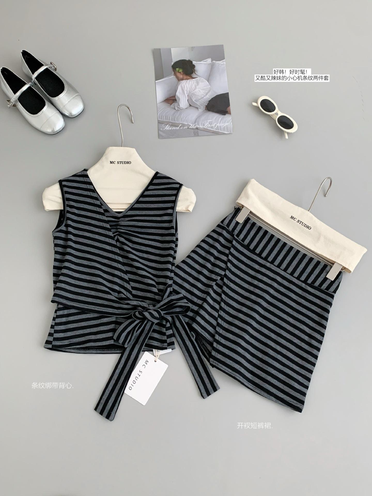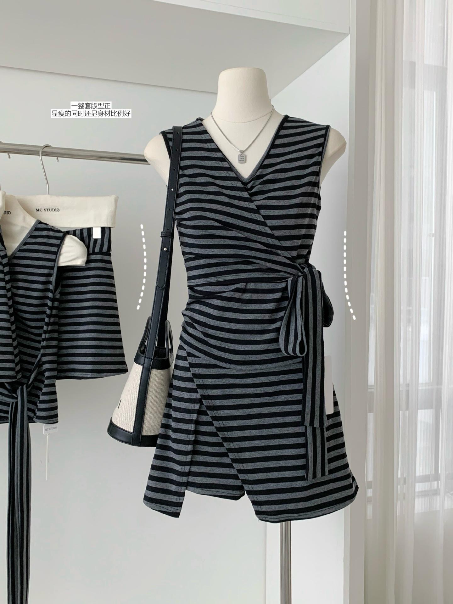 Conjunto de dos piezas de moda coreana para adelgazar con top sin mangas a rayas con cuello en V y lazo y falda de cintura alta para mujer