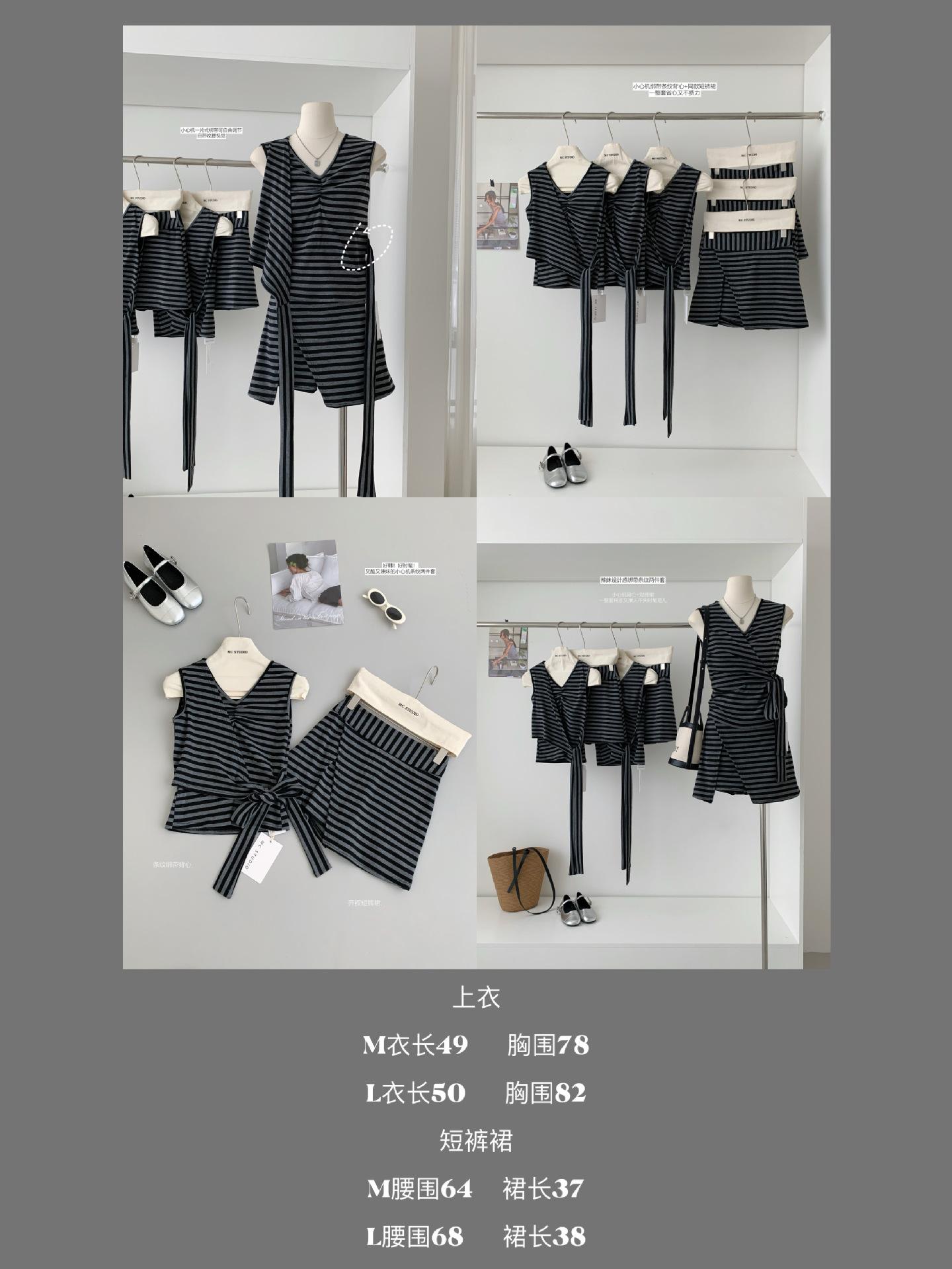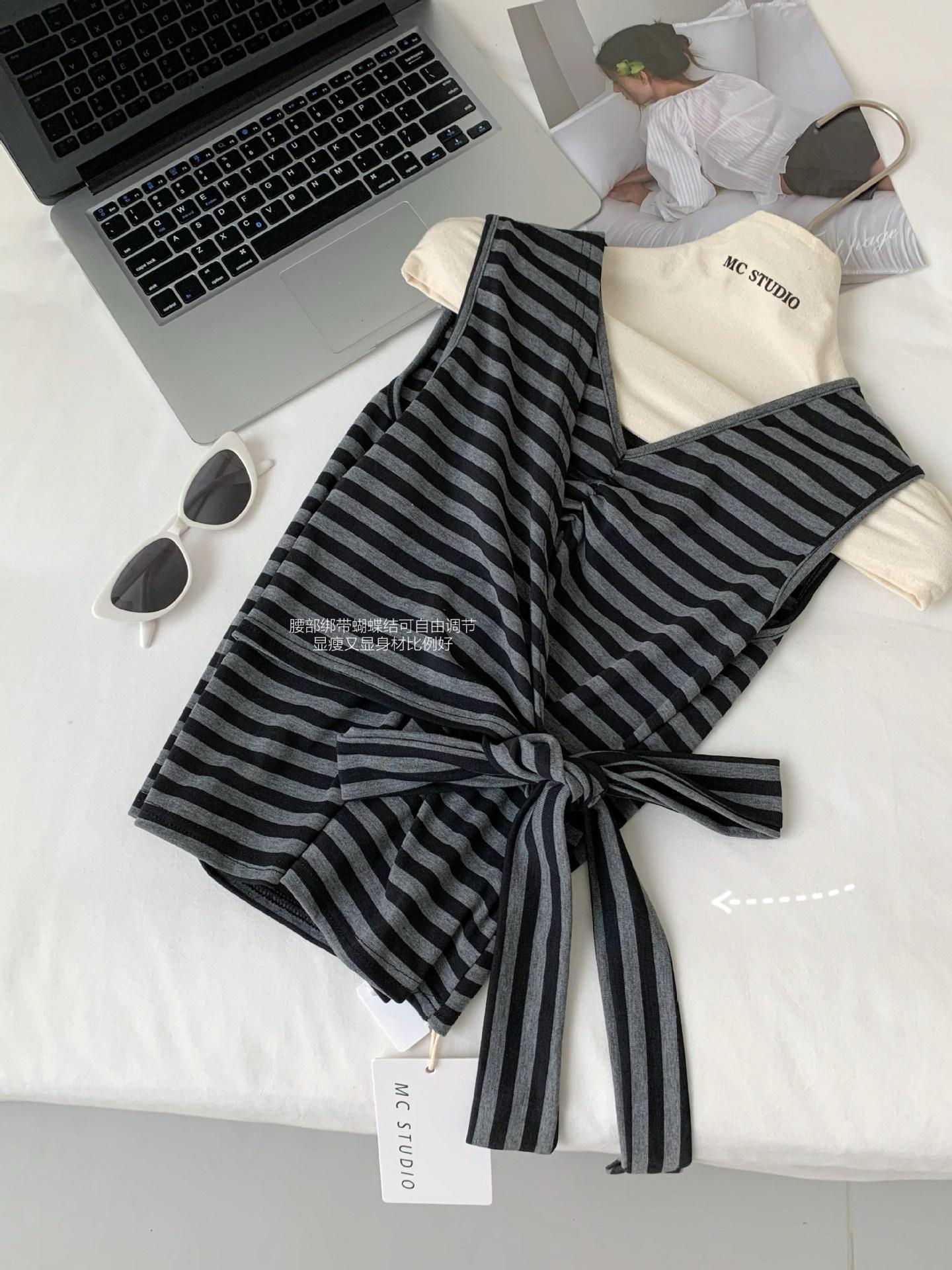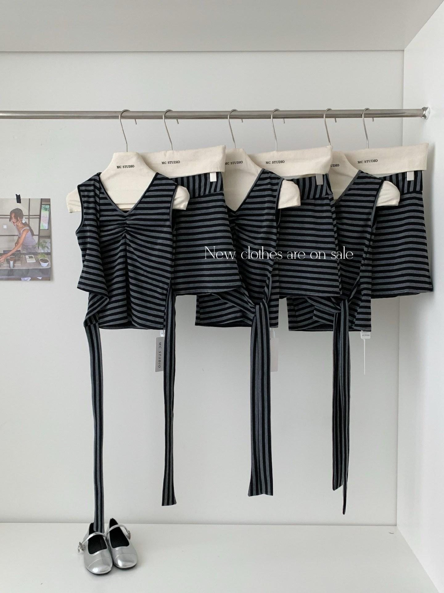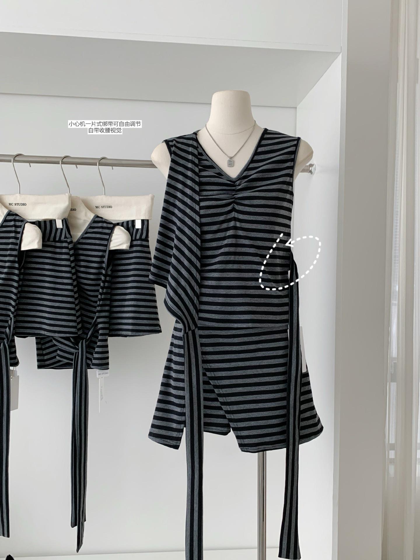 Conjunto de dos piezas de moda coreana para adelgazar con top sin mangas a rayas con cuello en V y lazo y falda de cintura alta para mujer