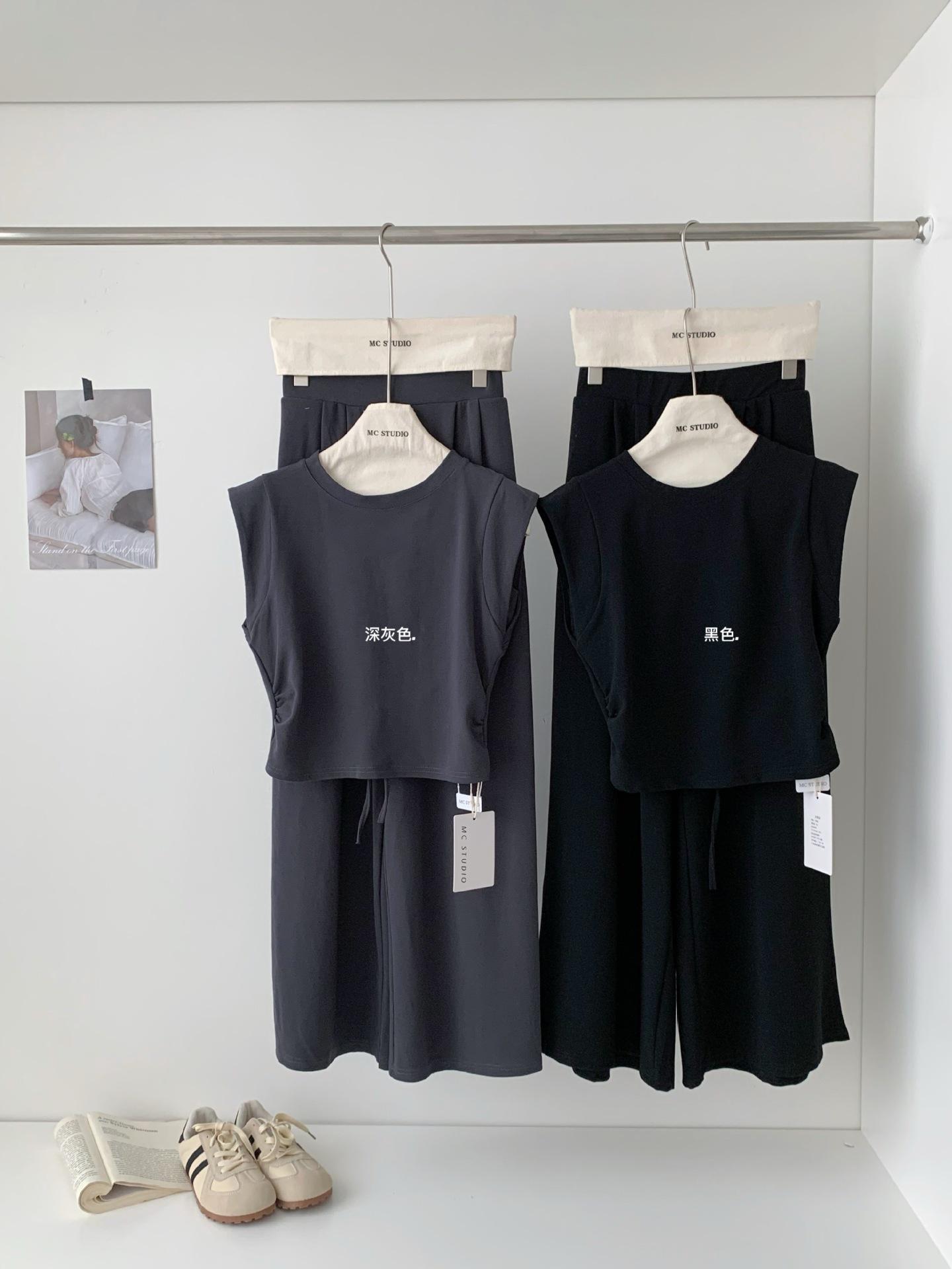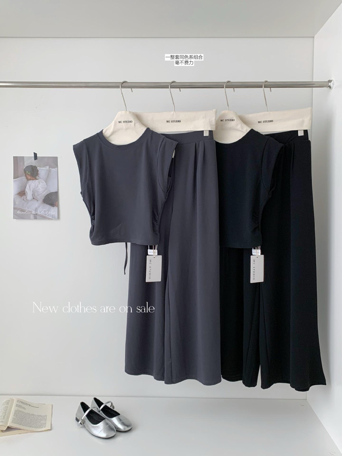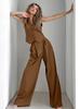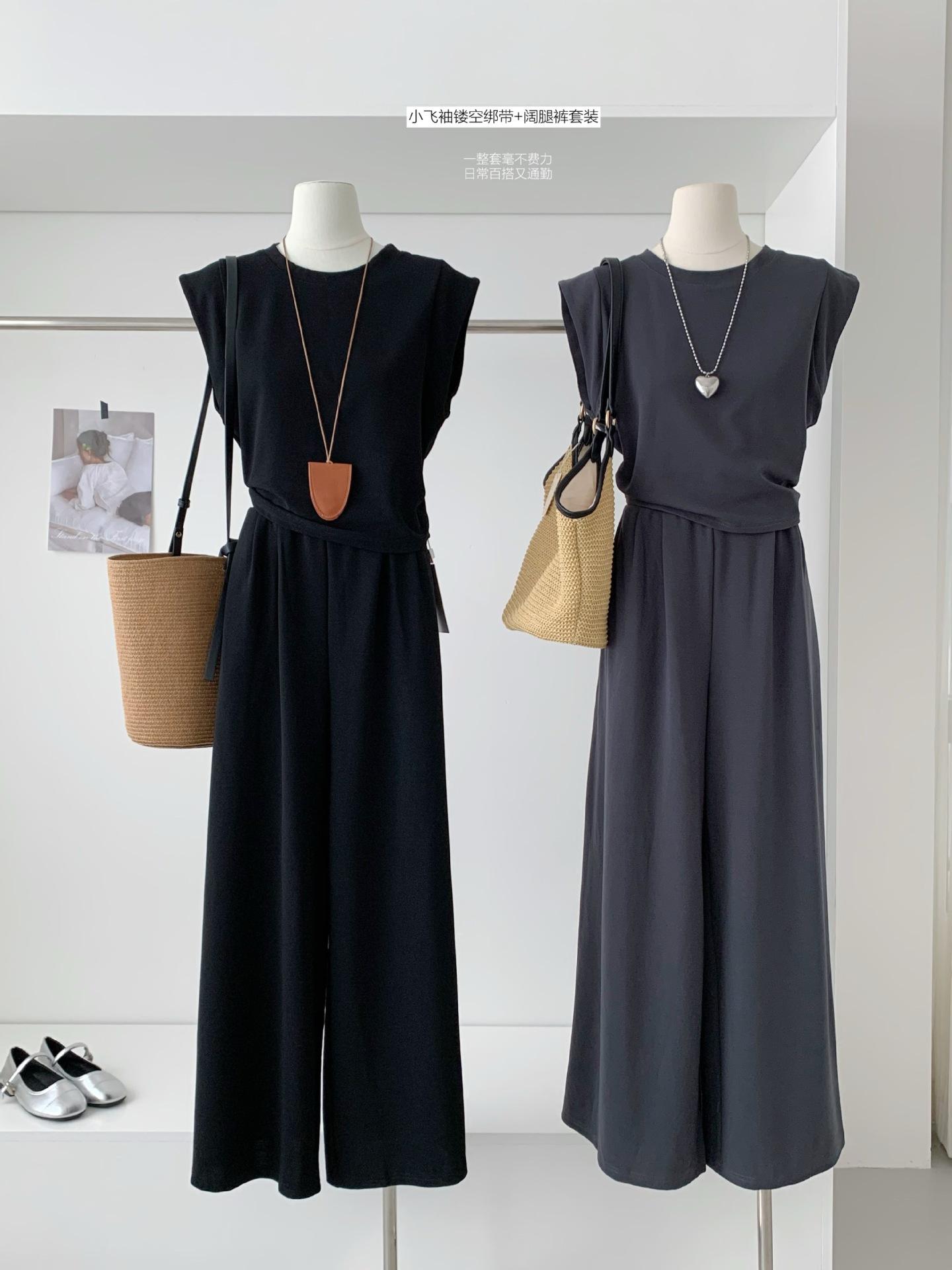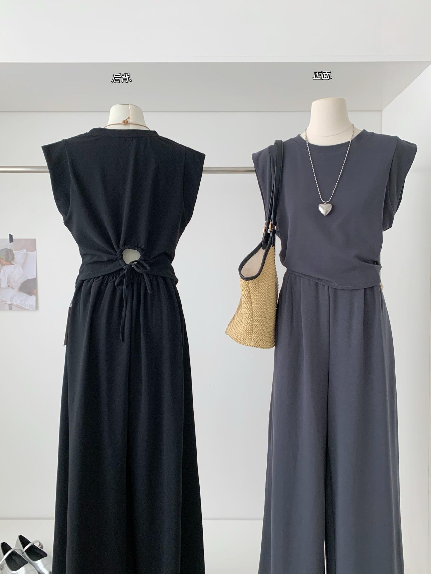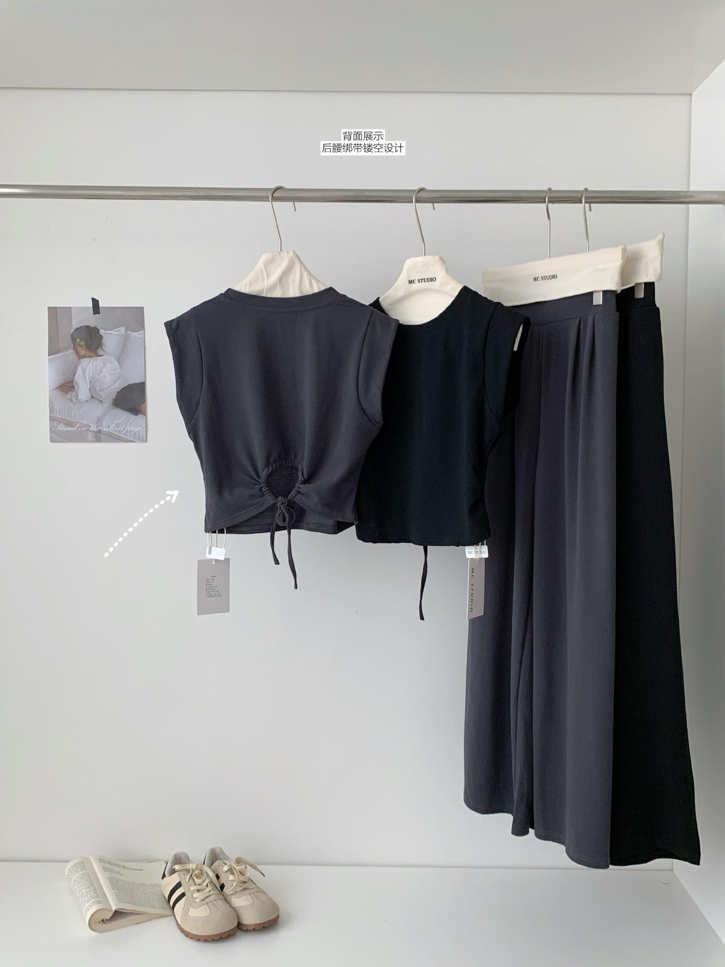 Diseño Coreano Cordón Recorte Espalda Descubierta Camiseta de Tirantes + Traje de Pantalón Recto Casual de Pierna Ancha