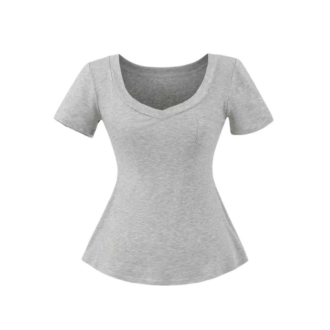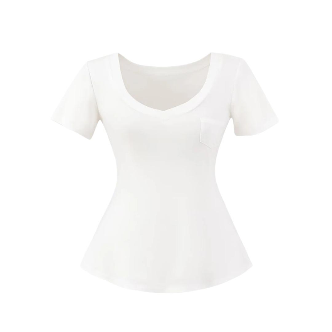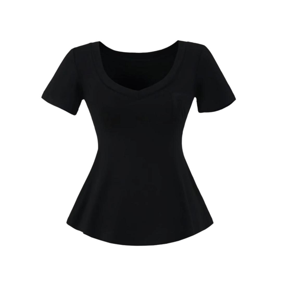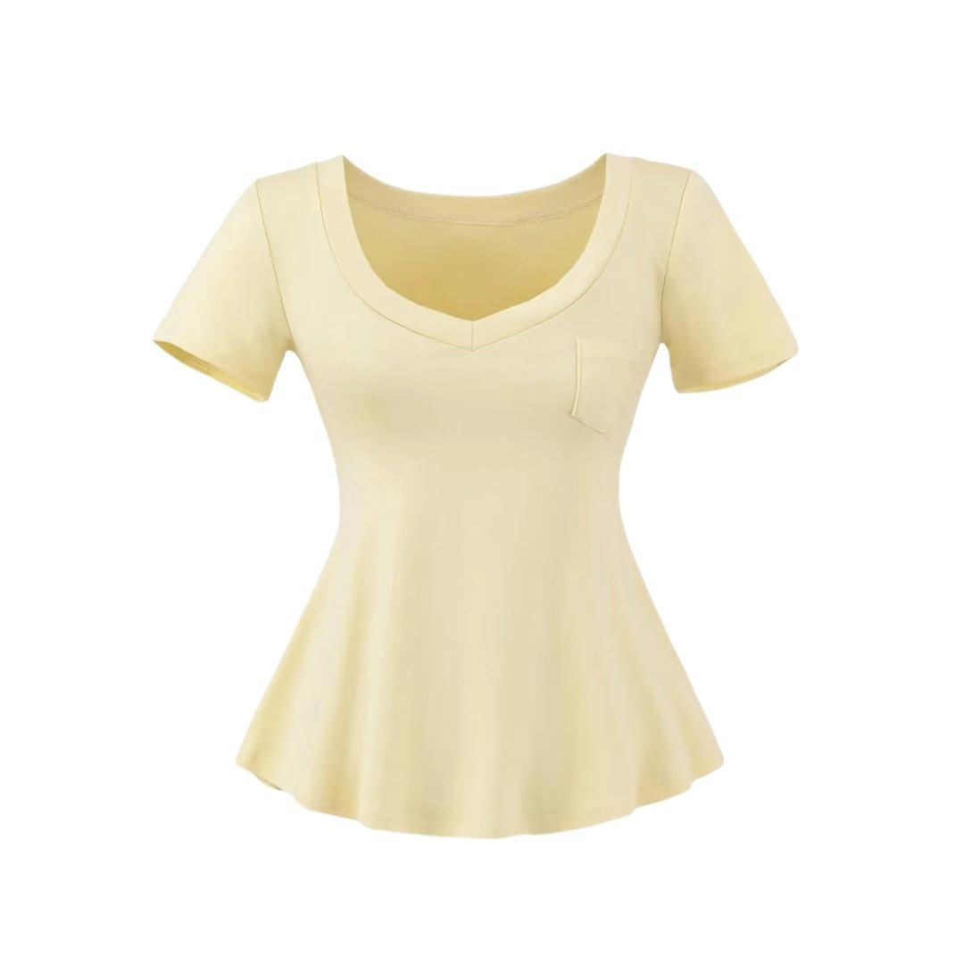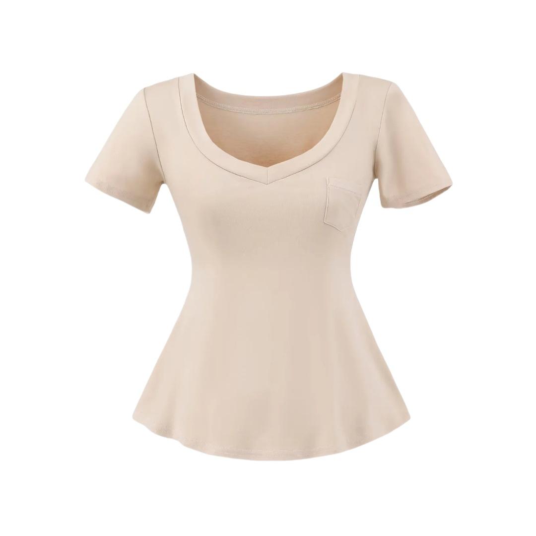 Nueva playera de manga corta con cuello de corazón de durazno de color sólido para mujer con un bolsillo pequeño, cintura ceñida, corte ajustado y top con bajo con volantes