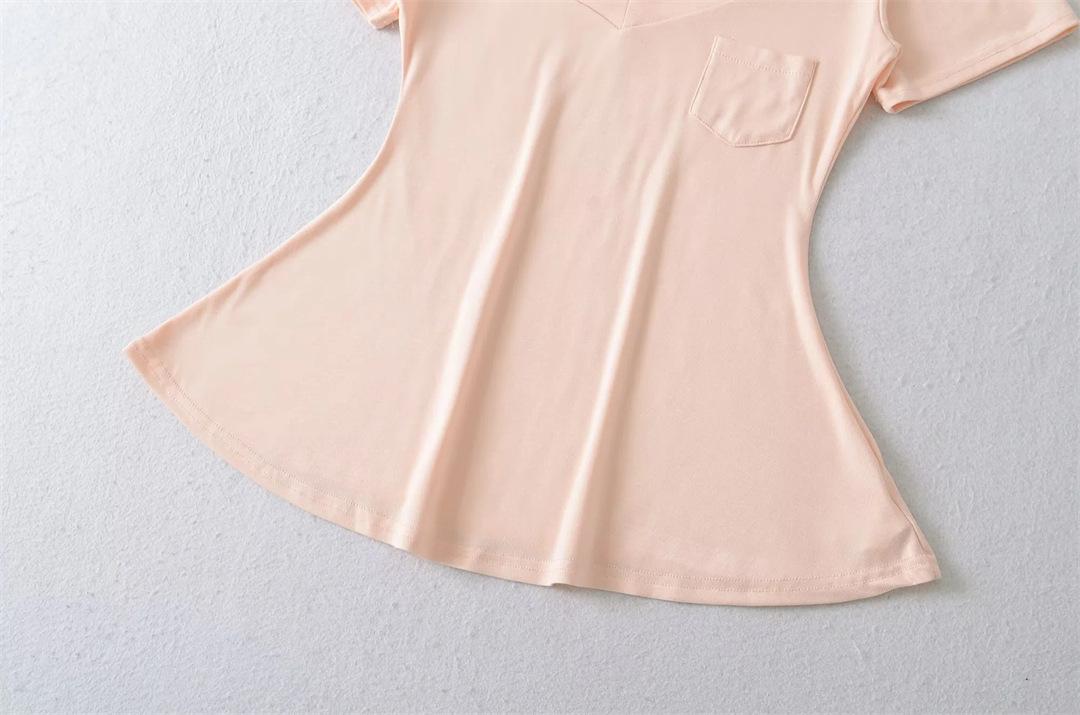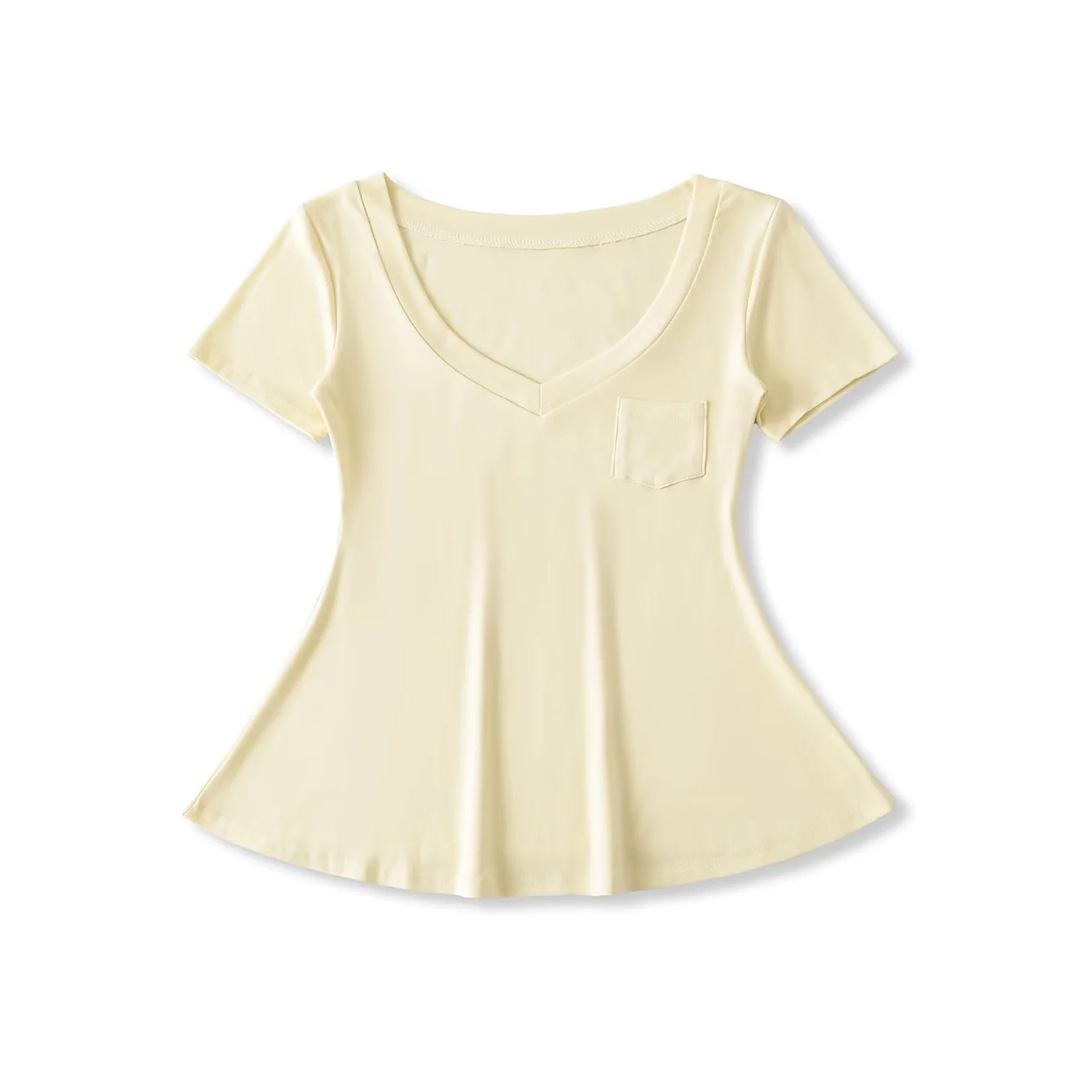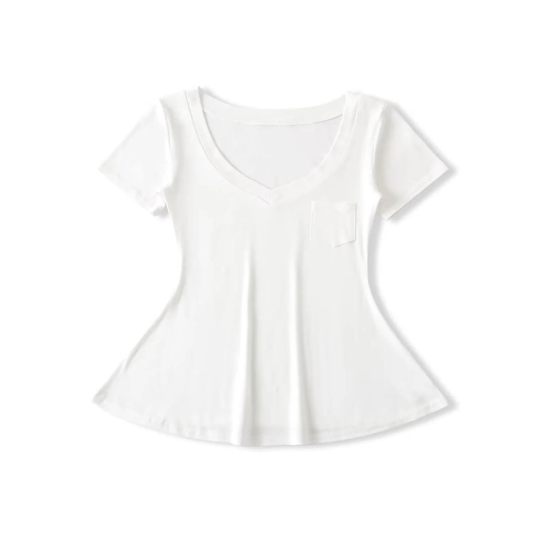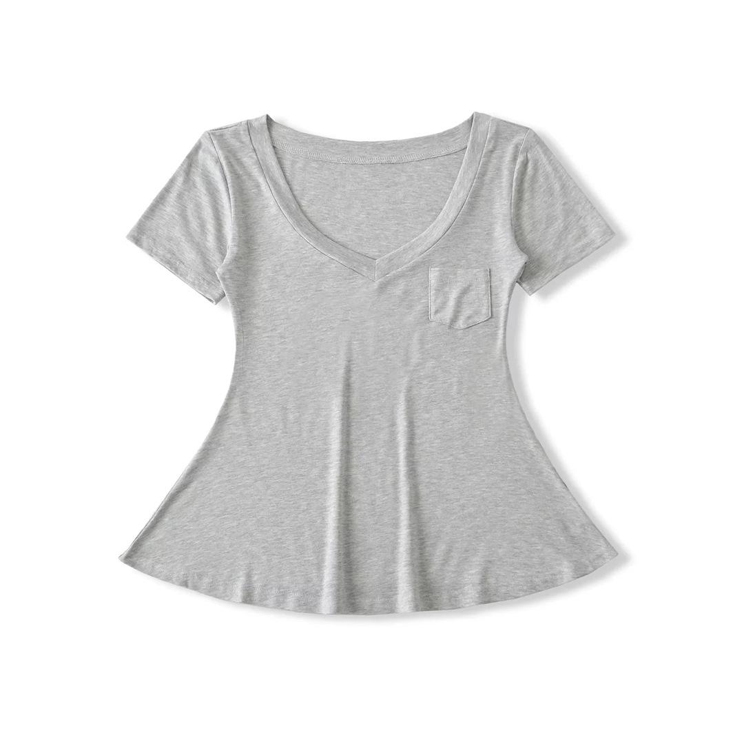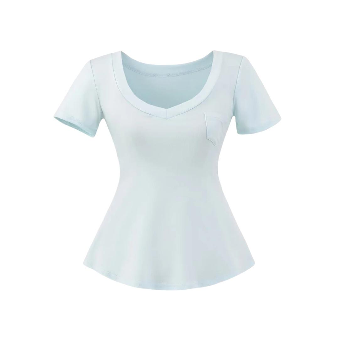 Nueva playera de manga corta con cuello de corazón de durazno de color sólido para mujer con un bolsillo pequeño, cintura ceñida, corte ajustado y top con bajo con volantes