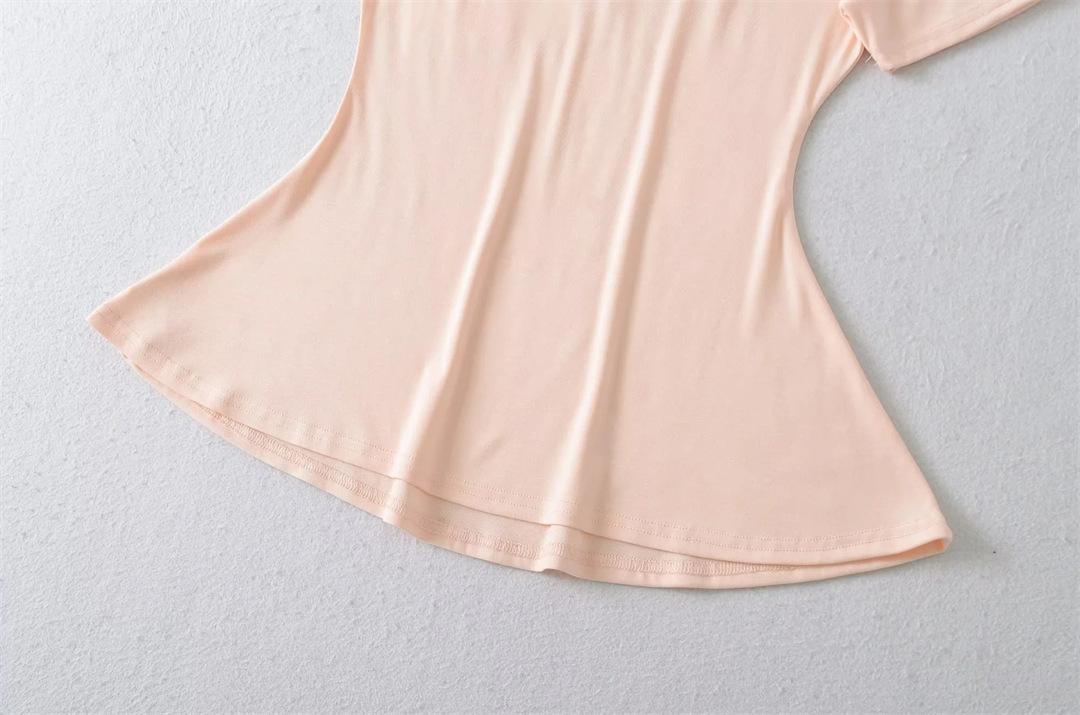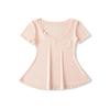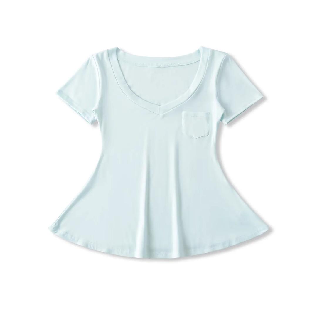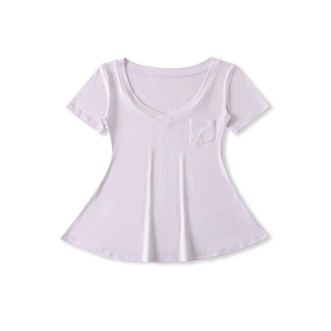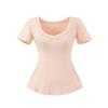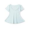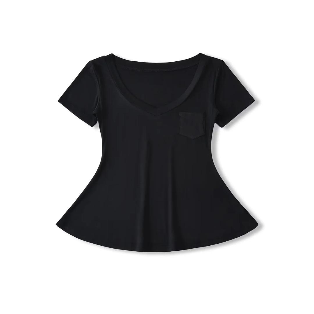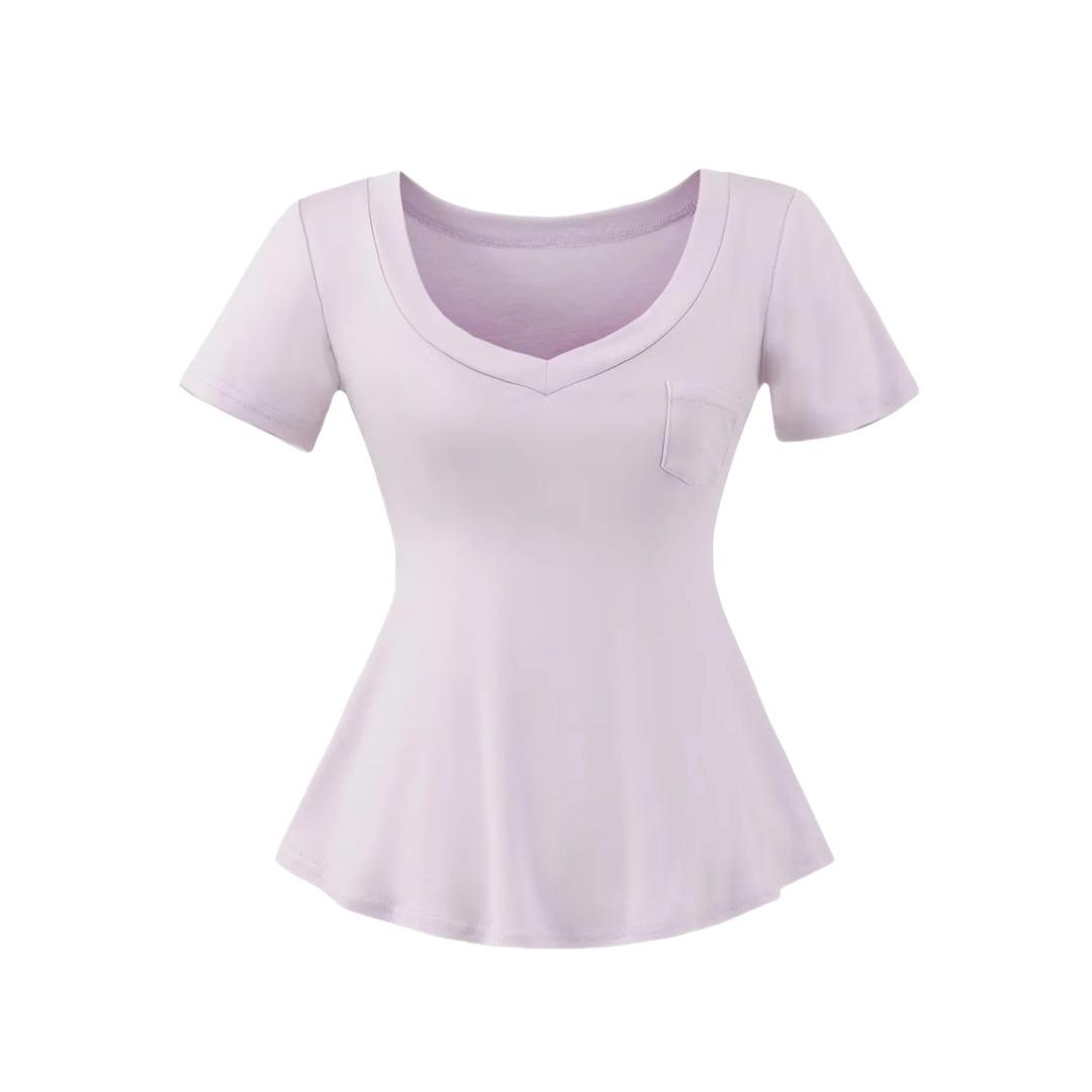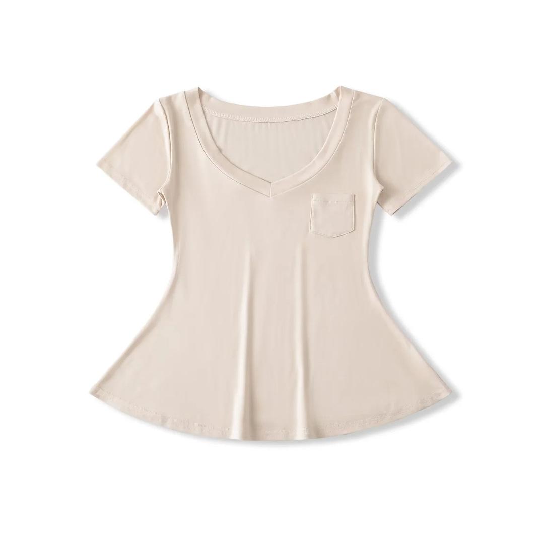 Nueva playera de manga corta con cuello de corazón de durazno de color sólido para mujer con un bolsillo pequeño, cintura ceñida, corte ajustado y top con bajo con volantes