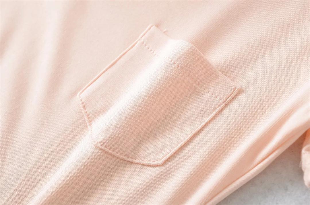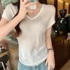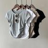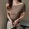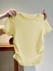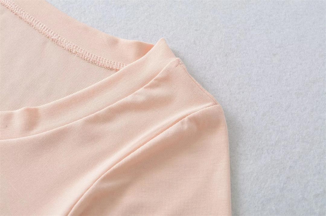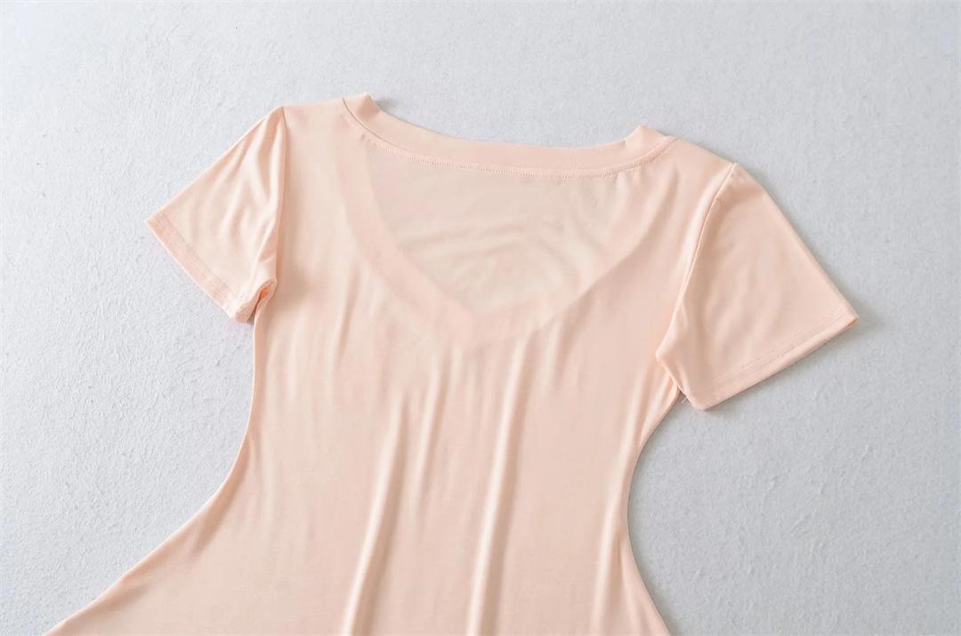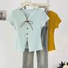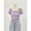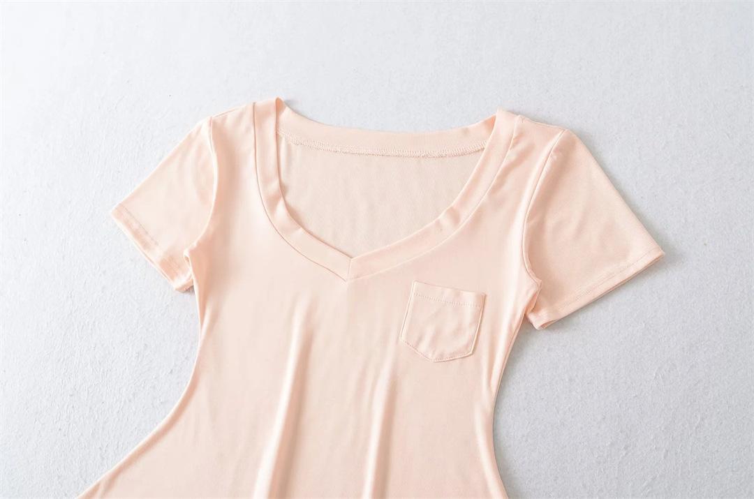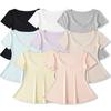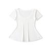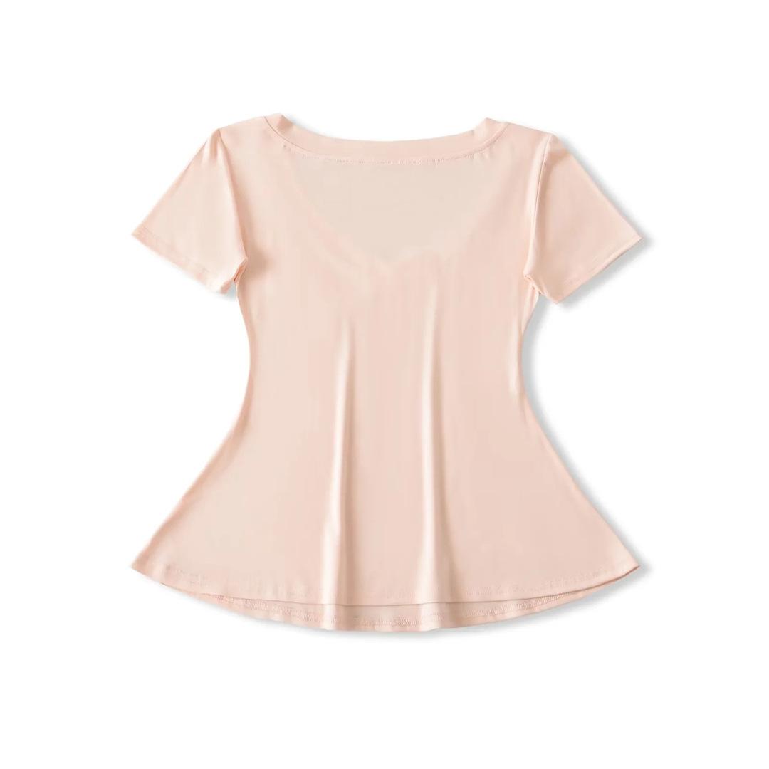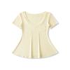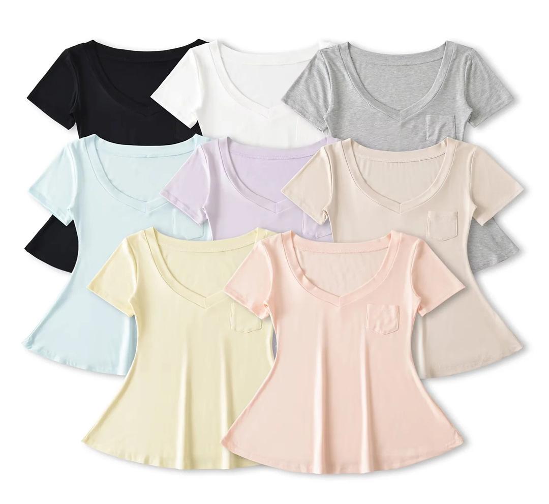Nueva playera de manga corta con cuello de corazón de durazno de color sólido para mujer con un bolsillo pequeño, cintura ceñida, corte ajustado y top con bajo con volantes