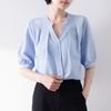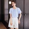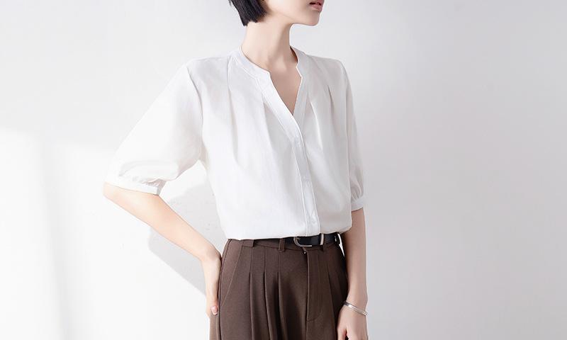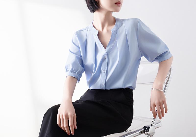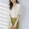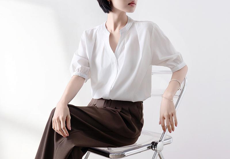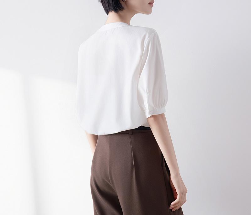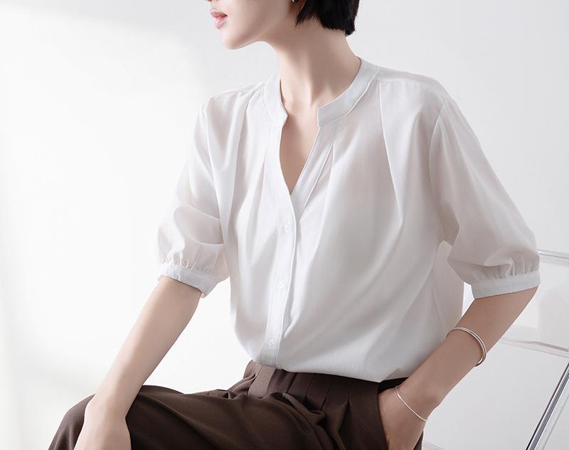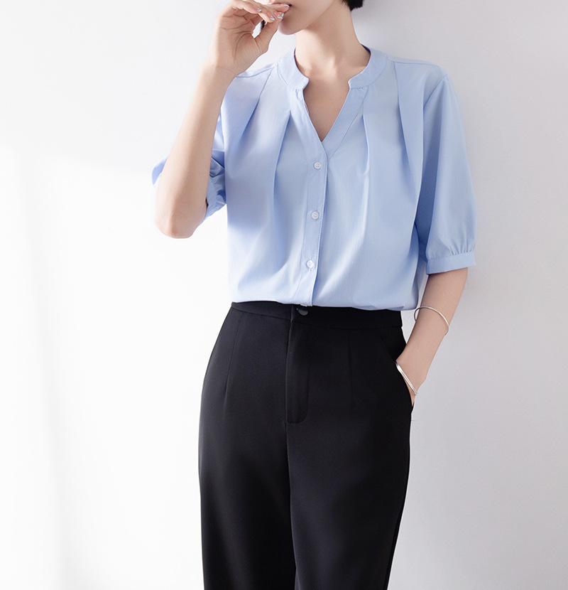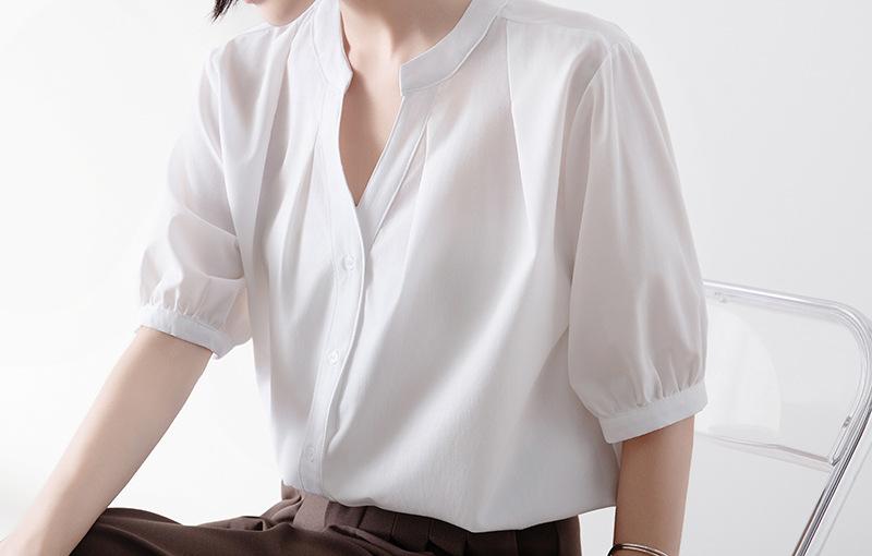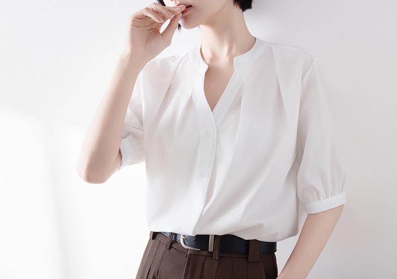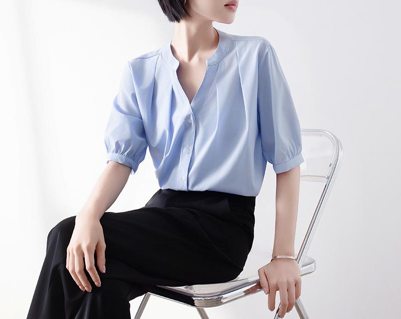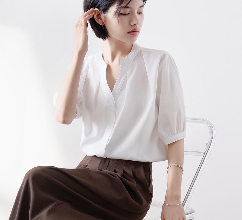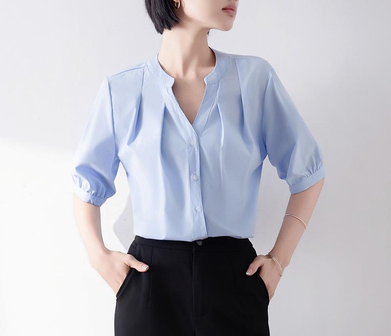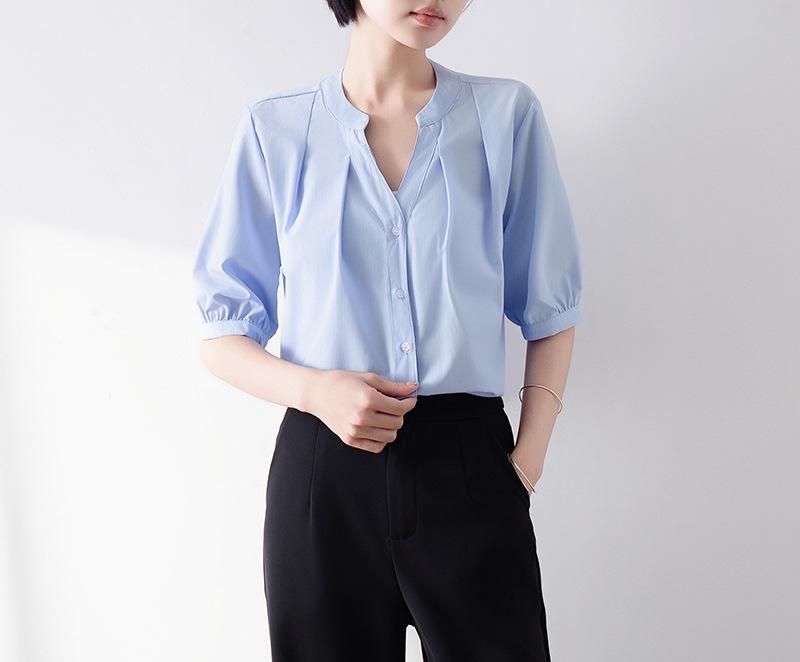 Elegante Ropa de Trabajo Francesa con Cuello en V Camisa Plisada de Cuello Redondo para Mujer 2025 Verano Nuevo Look Holgado Adelgazante Top de Manga Corta