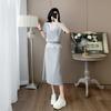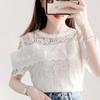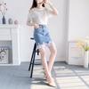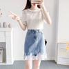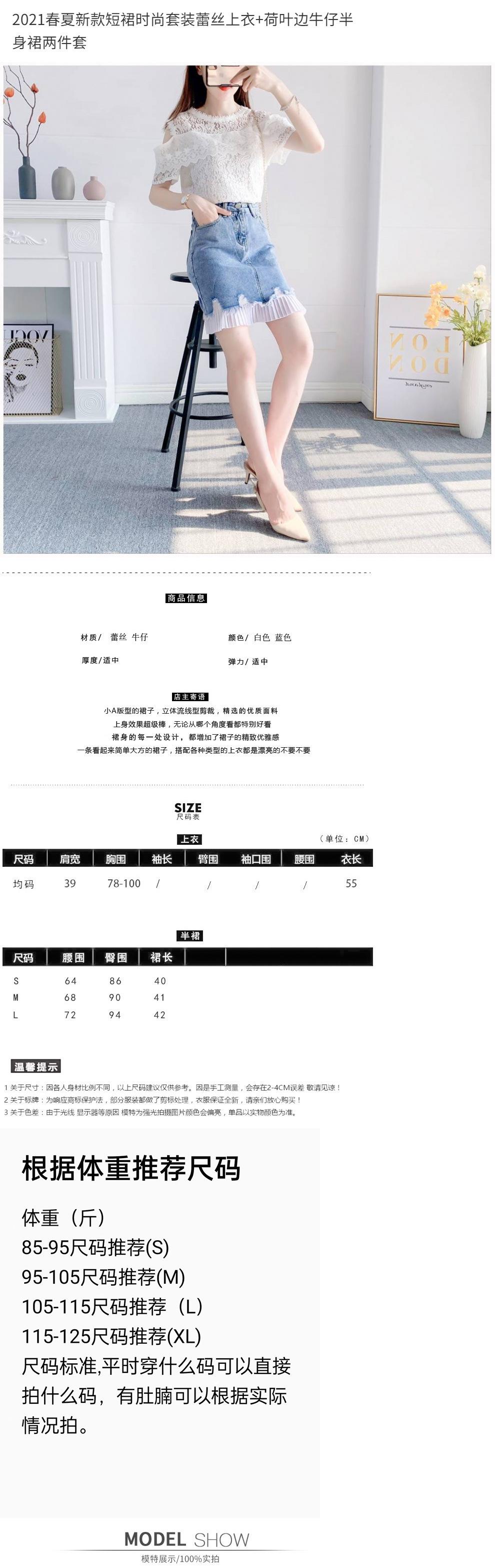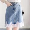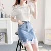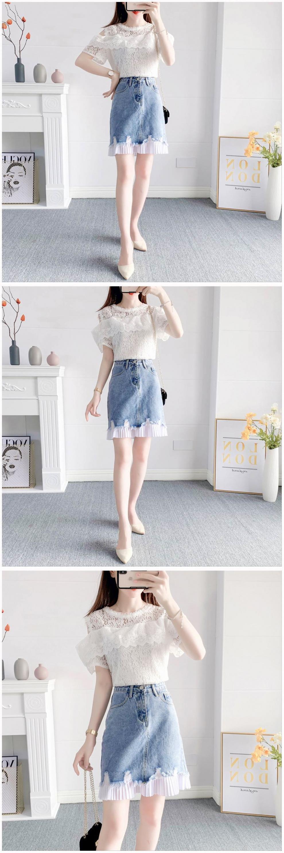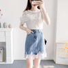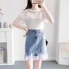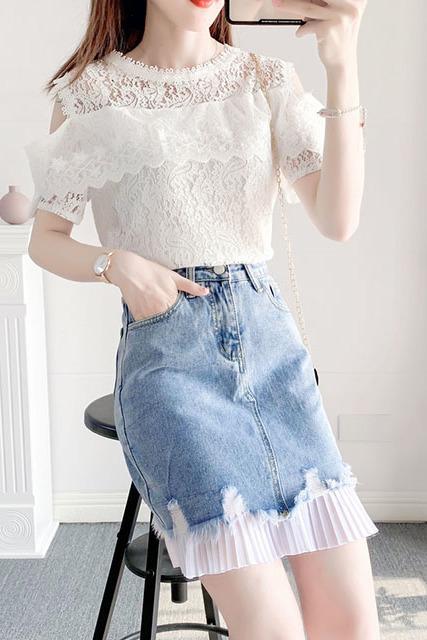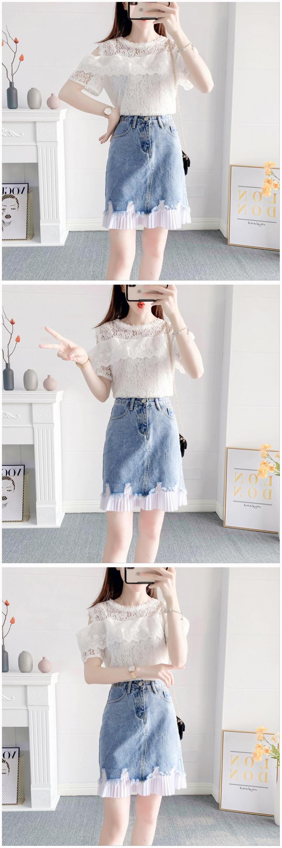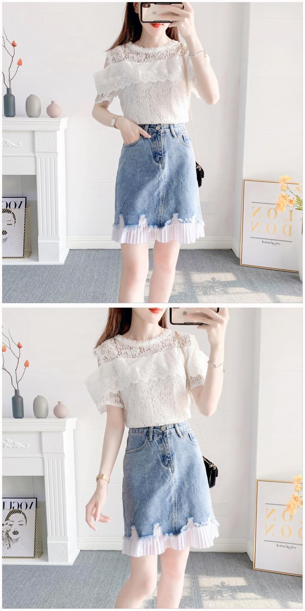Traje Verano Nuevo Manga Corta Moda Pequeño Fresco Encaje Camisa Top Falda Empalmada de Mezclilla Conjunto de Dos Piezas