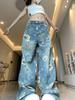 Talla grande Jeans de pierna ancha florales vintage para mujer Otoño Sentido del diseño Cintura alta Sueltos Adelgazantes Rectos Modernos