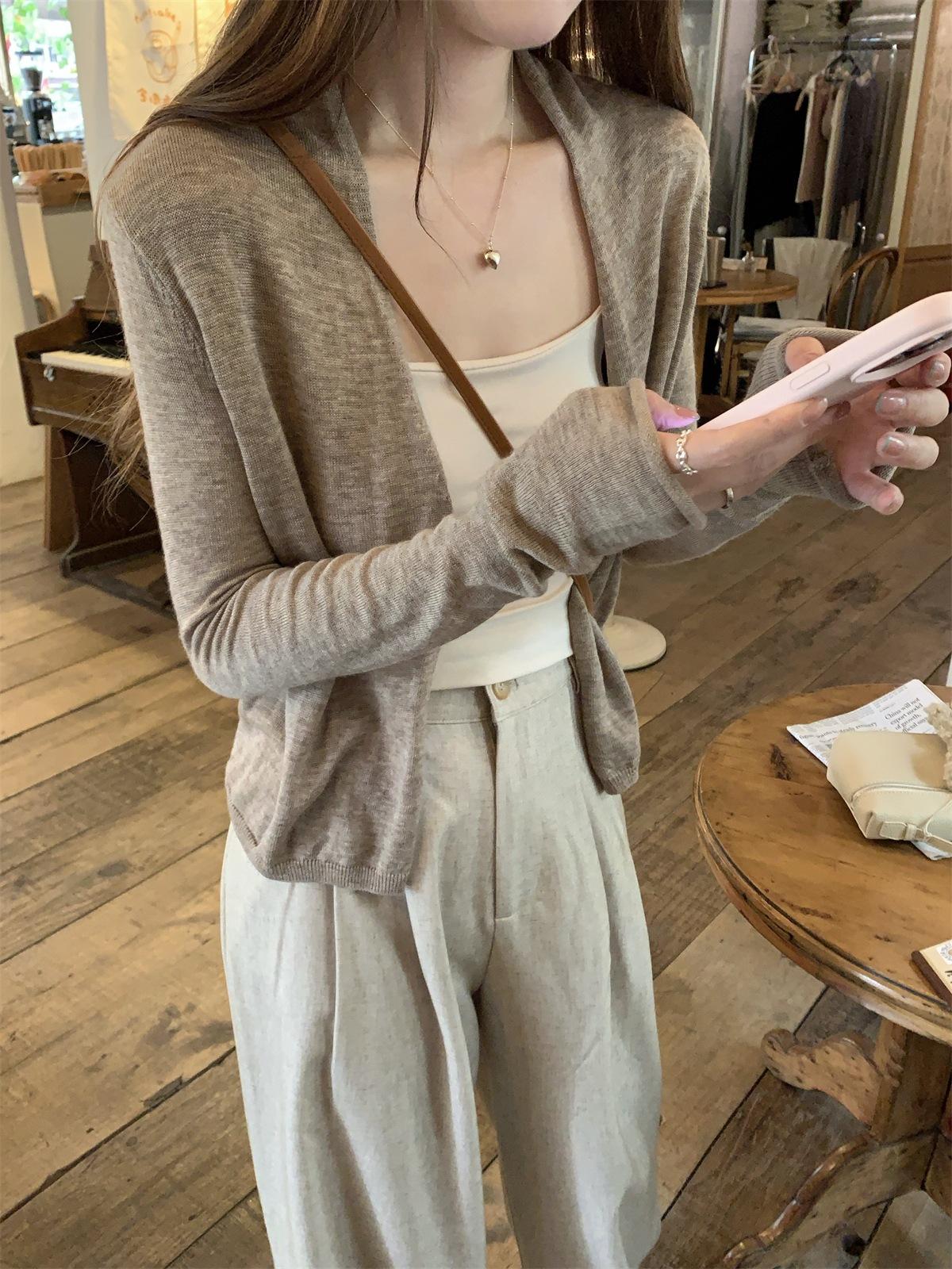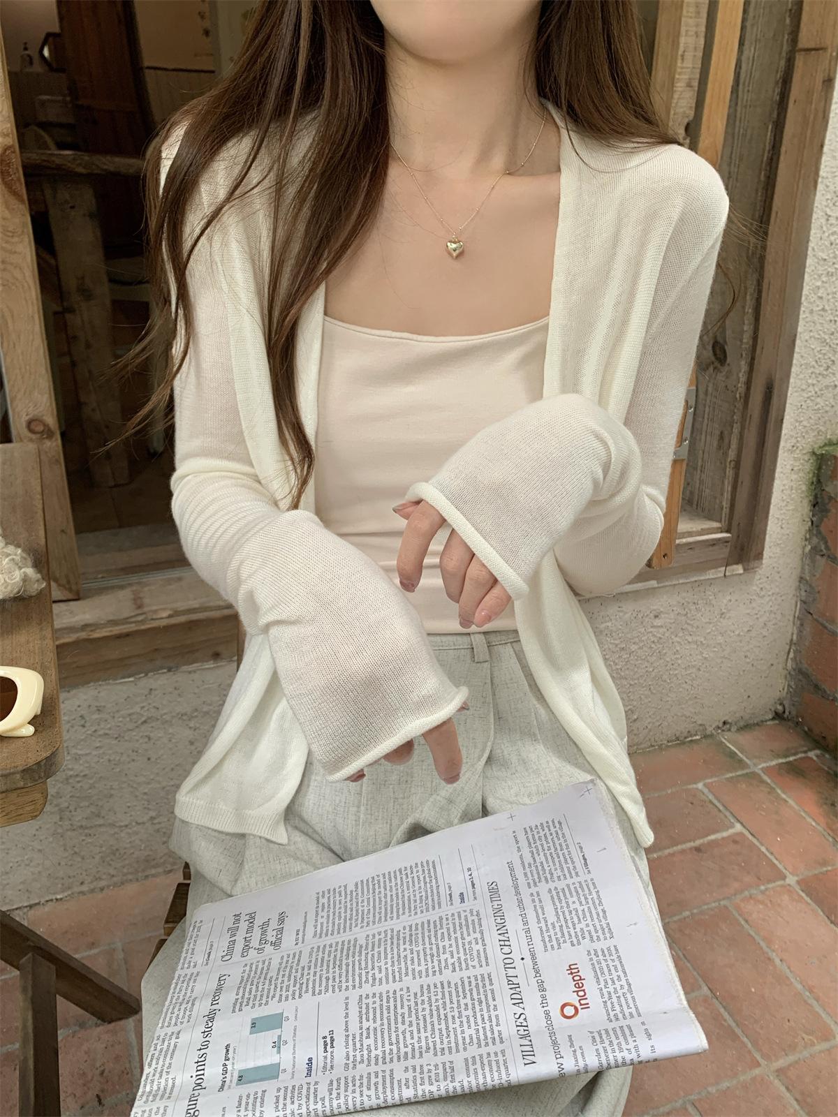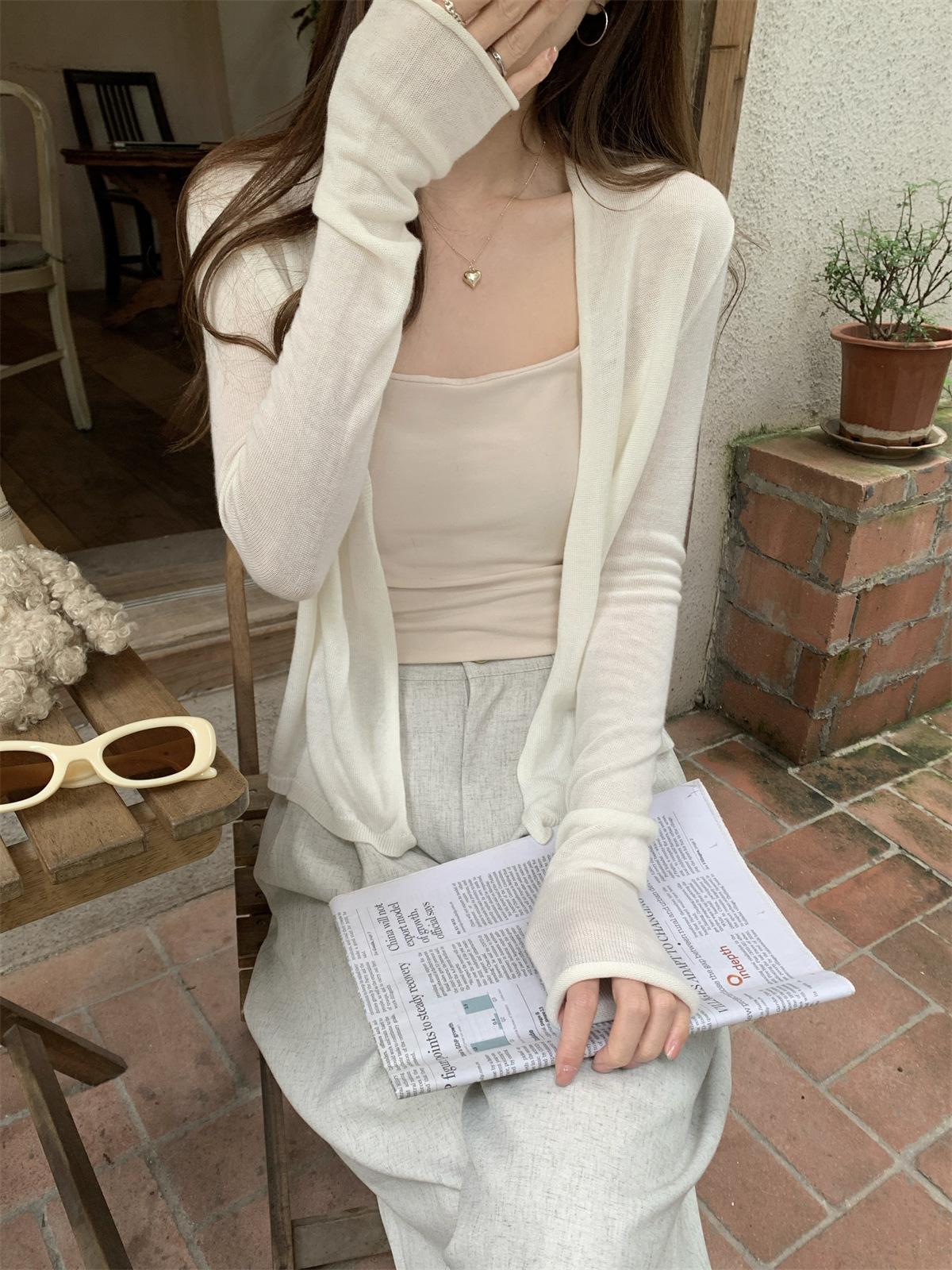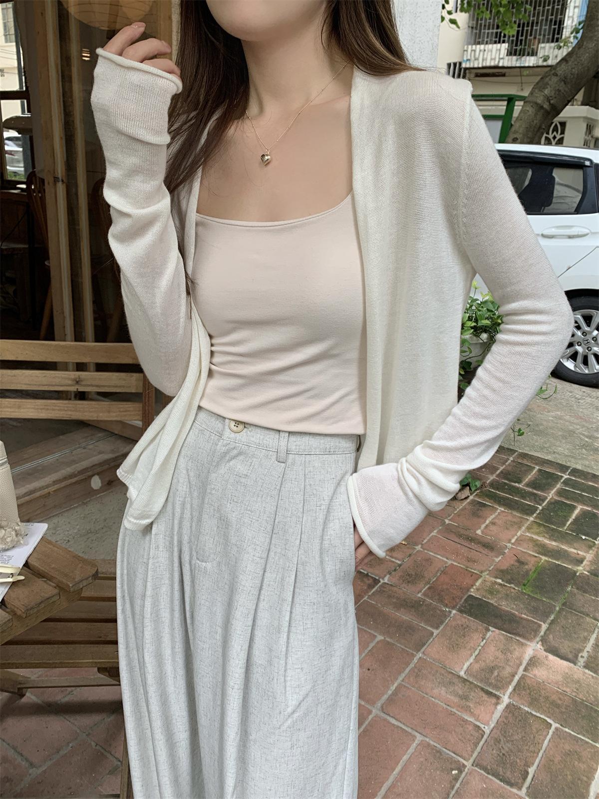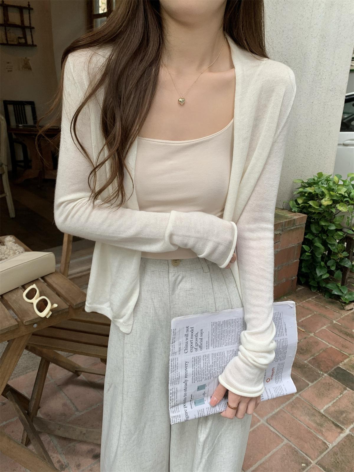 Foto real de Cárdigan de punto ligero de color puro estilo coreano de verano 2025 con top tipo chal para mujer 84354