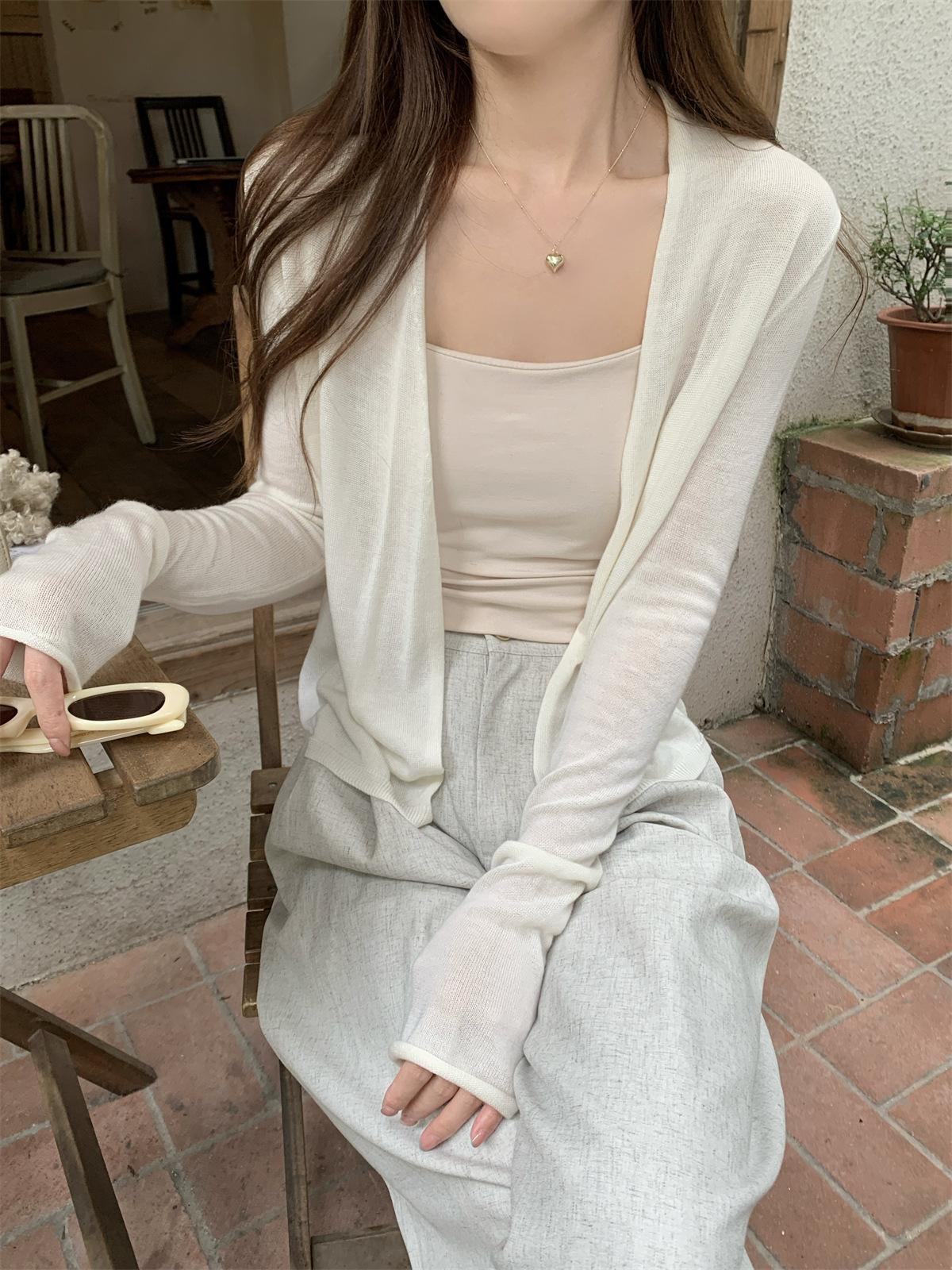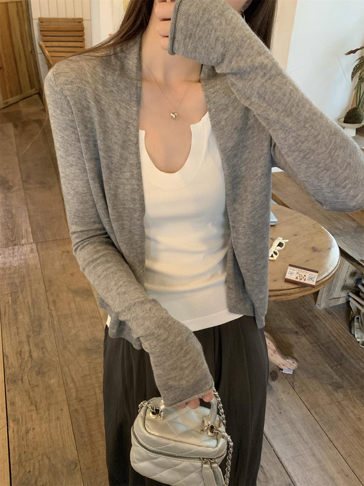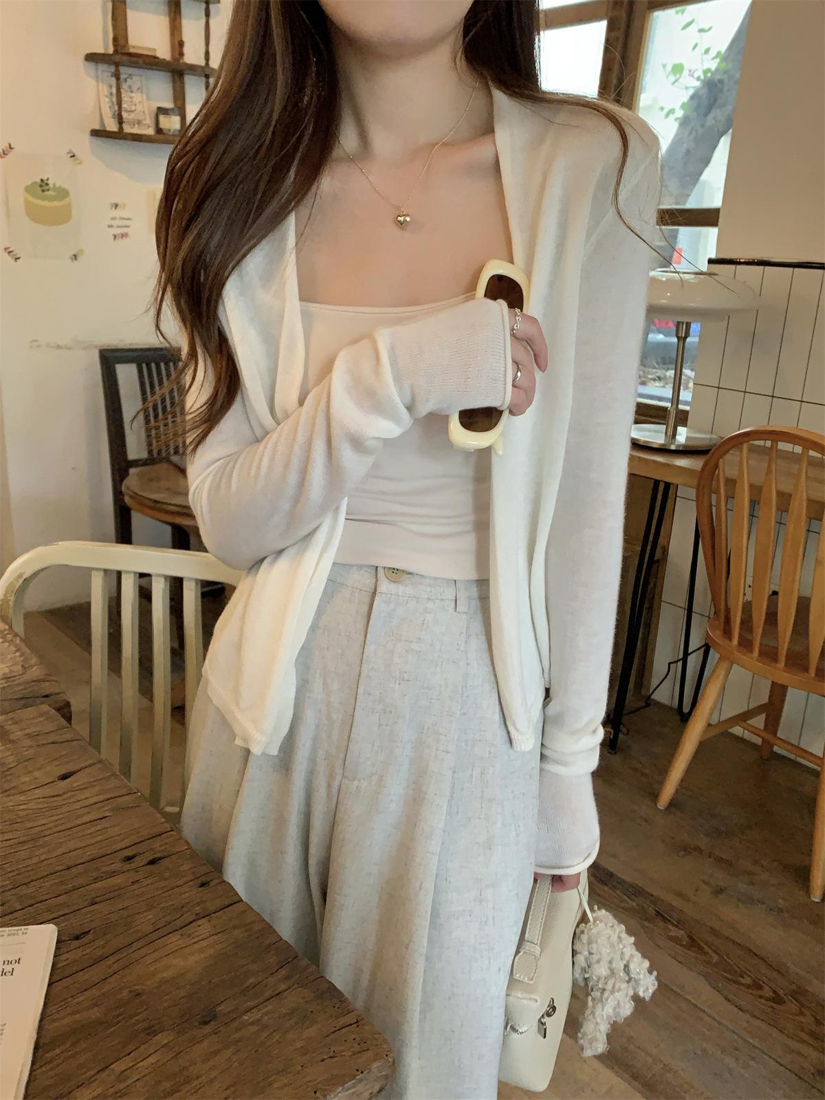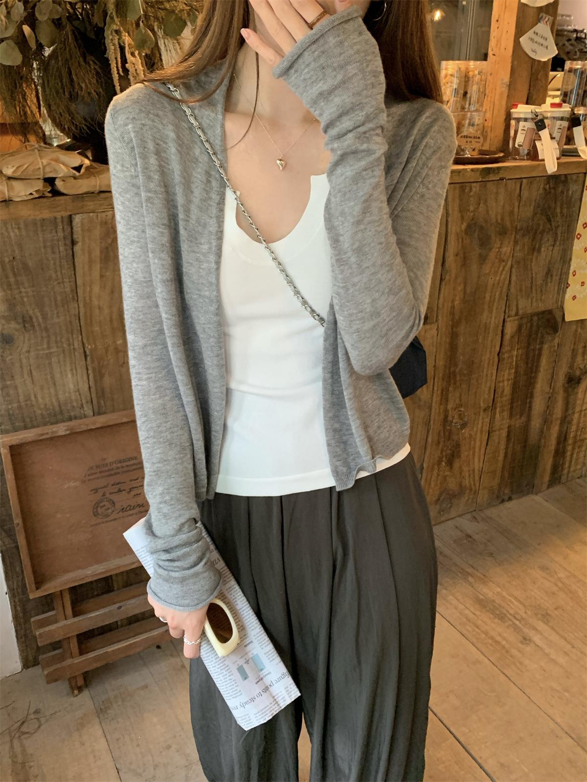Foto real de Cárdigan de punto ligero de color puro estilo coreano de verano 2025 con top tipo chal para mujer 84354
