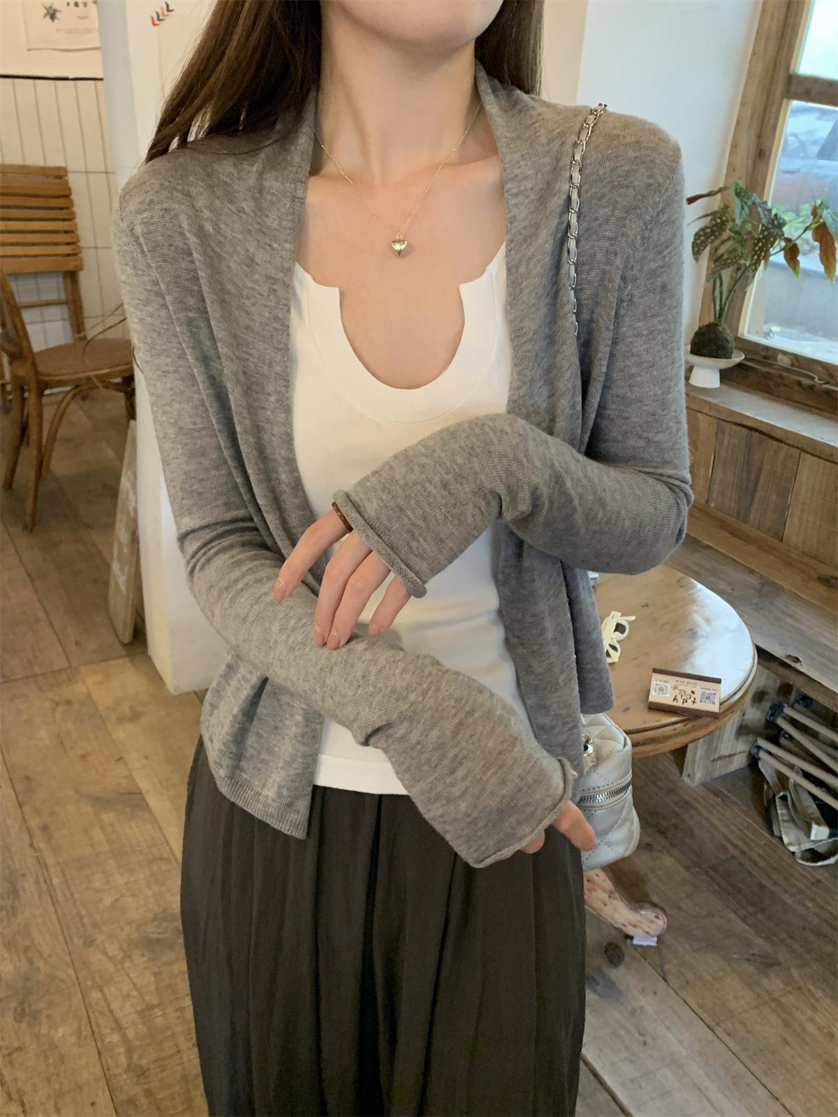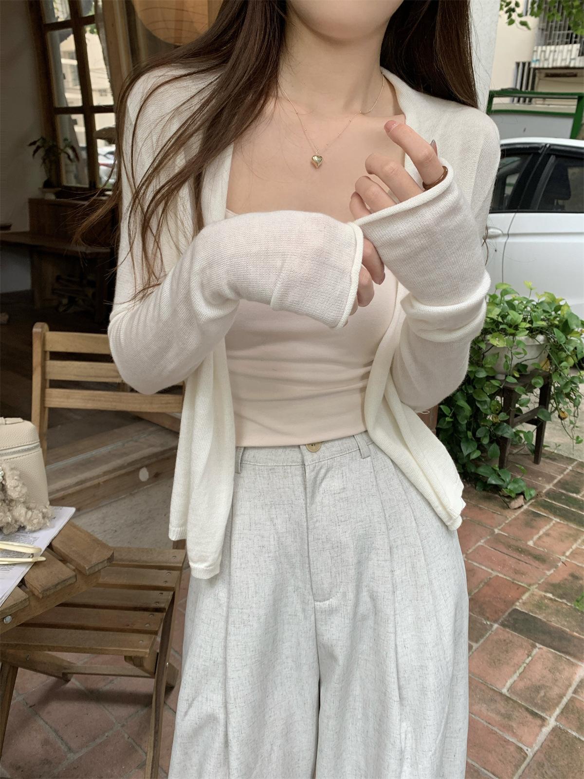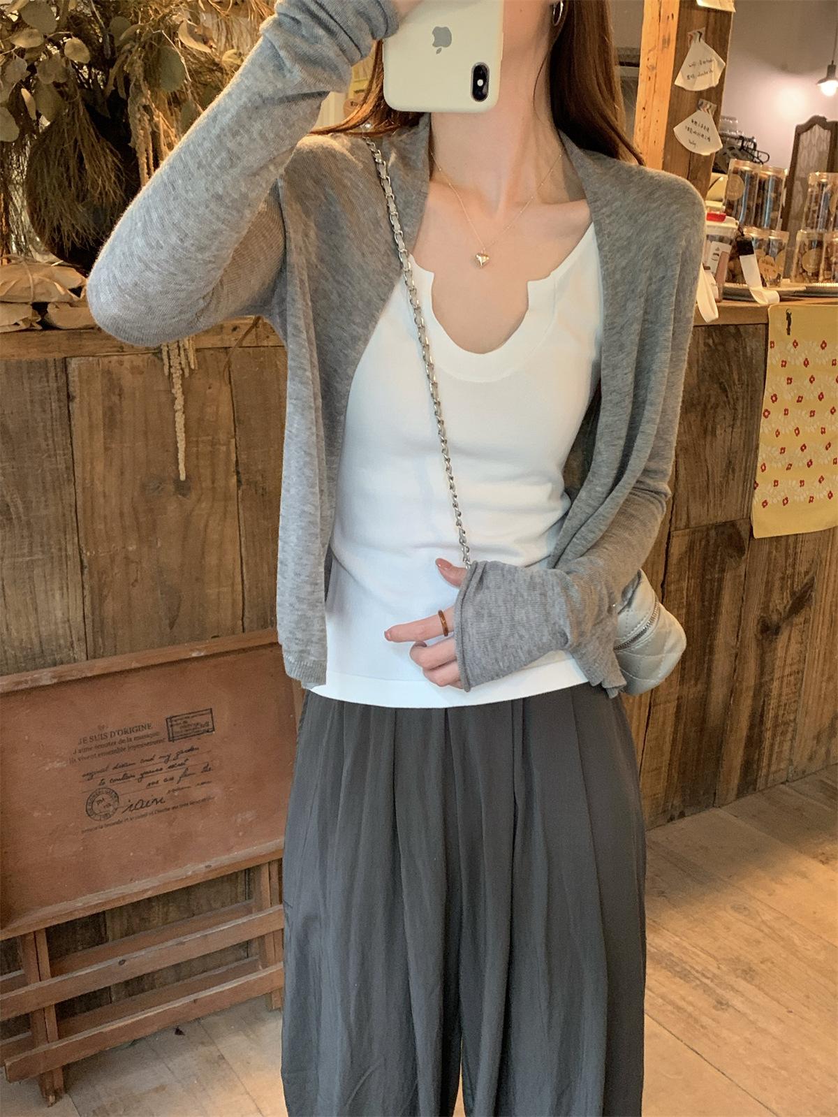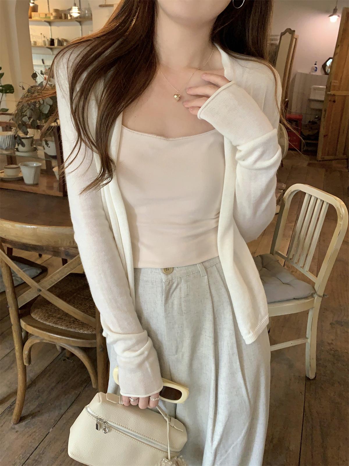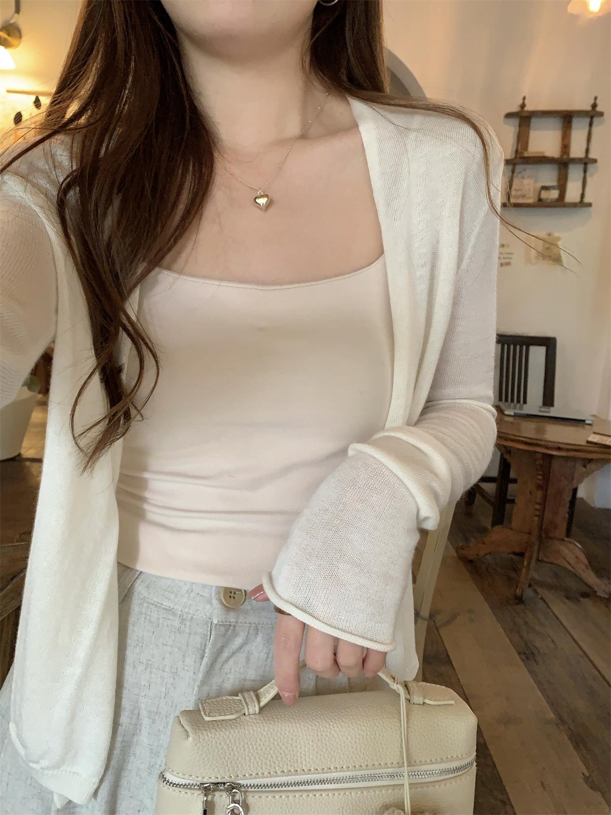 Foto real de Cárdigan de punto ligero de color puro estilo coreano de verano 2025 con top tipo chal para mujer 84354