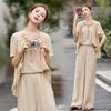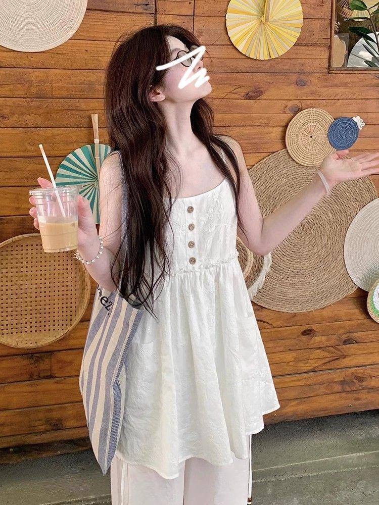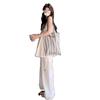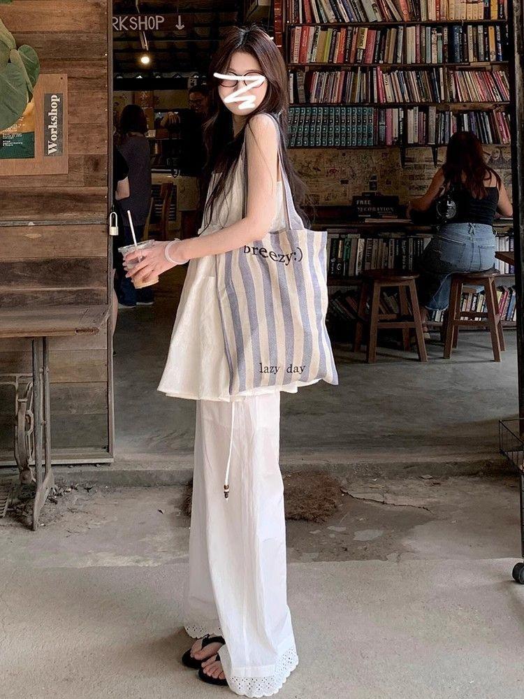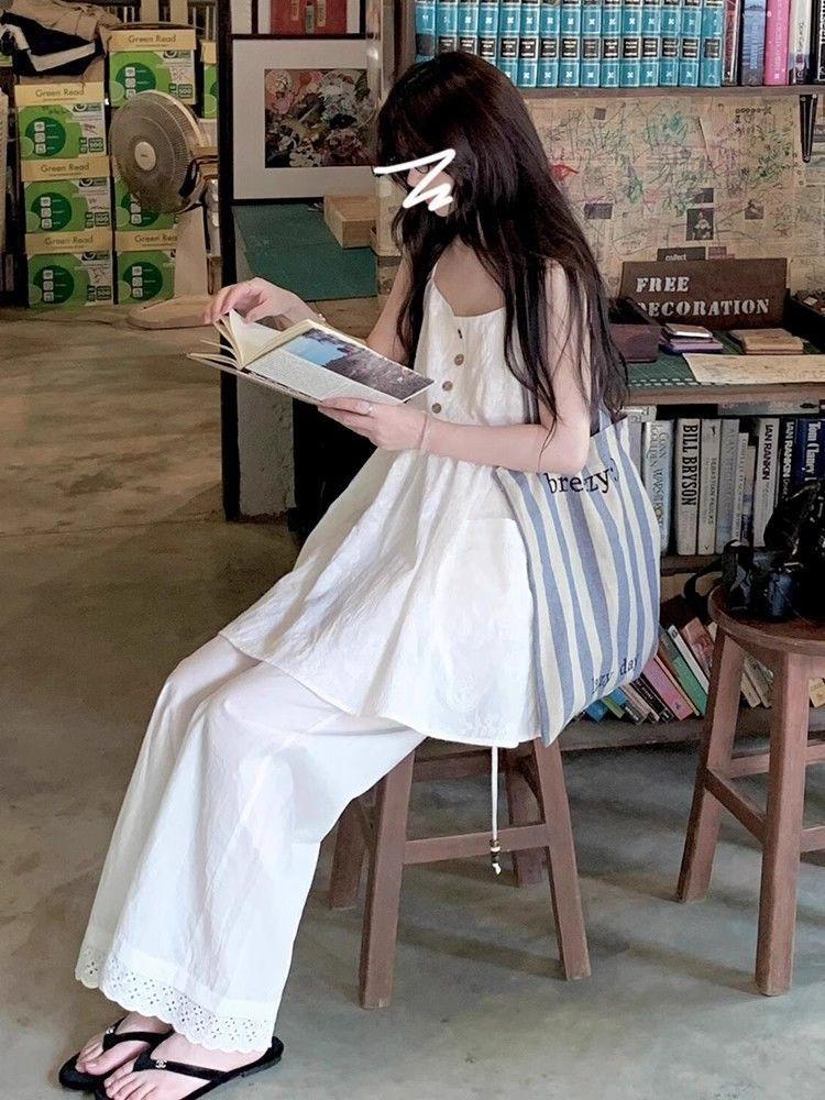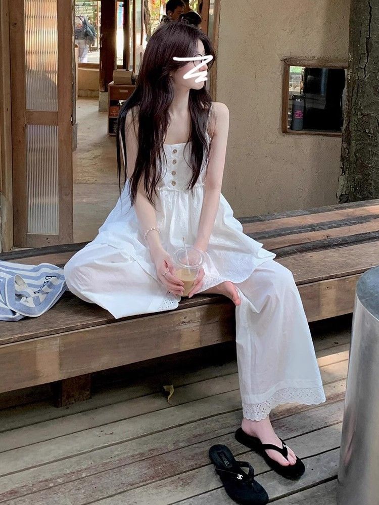 2025 Verano Estilo Vacaciones Marítimas Francesas Top Camisola Blanco para Mujer Nuevo Conjunto de Pantalón Casual Holgado Adelgazante
