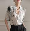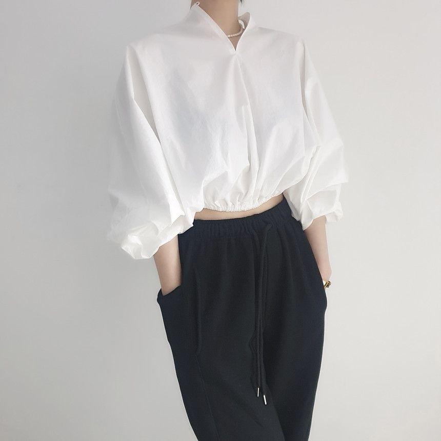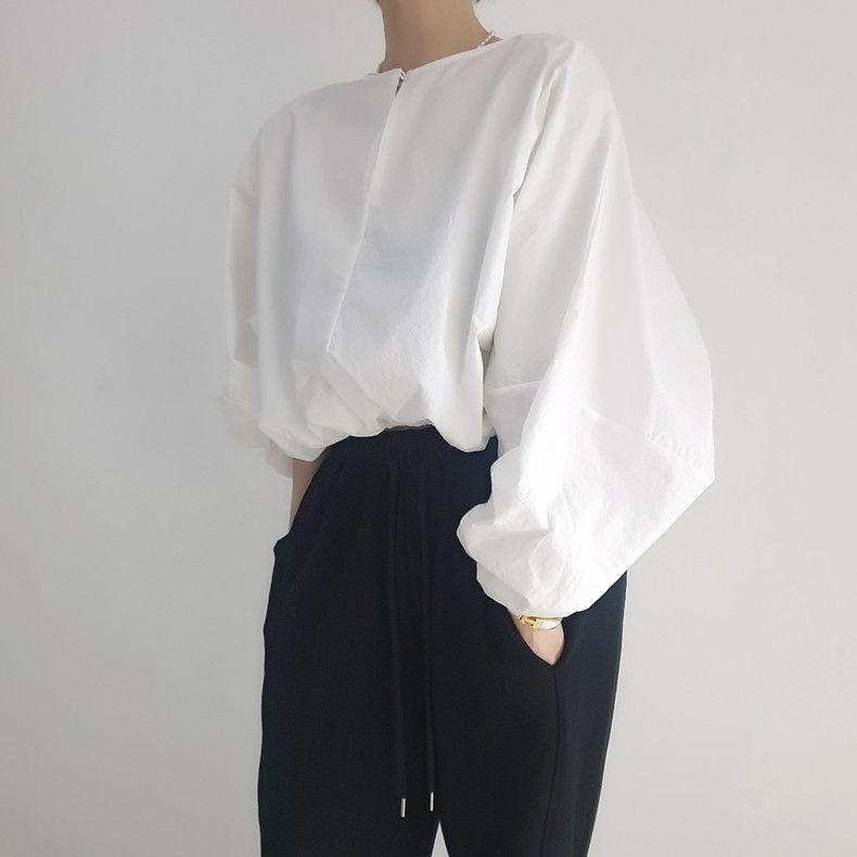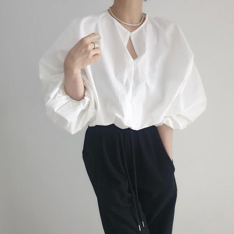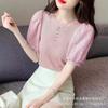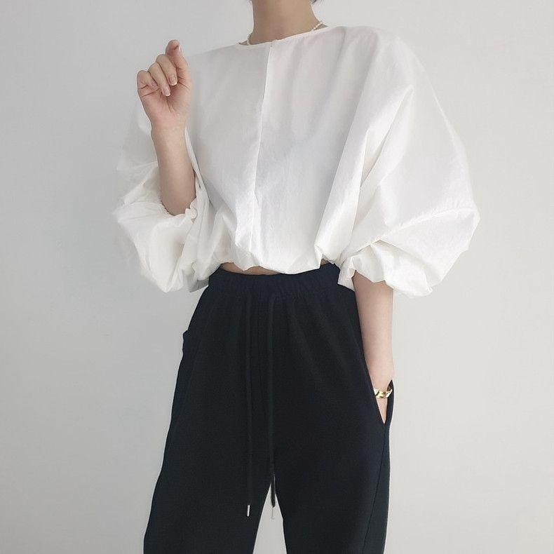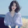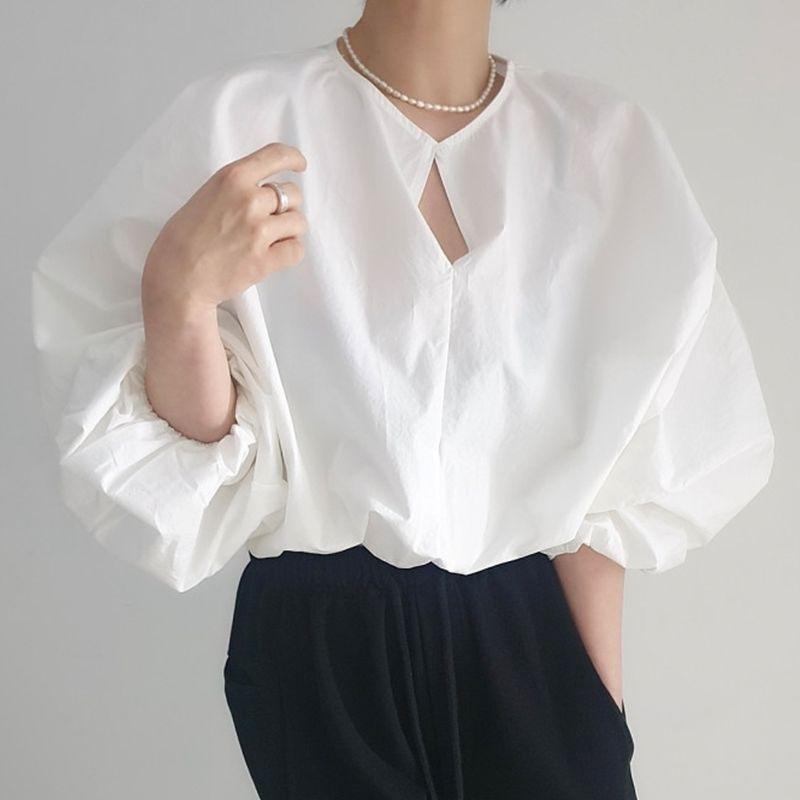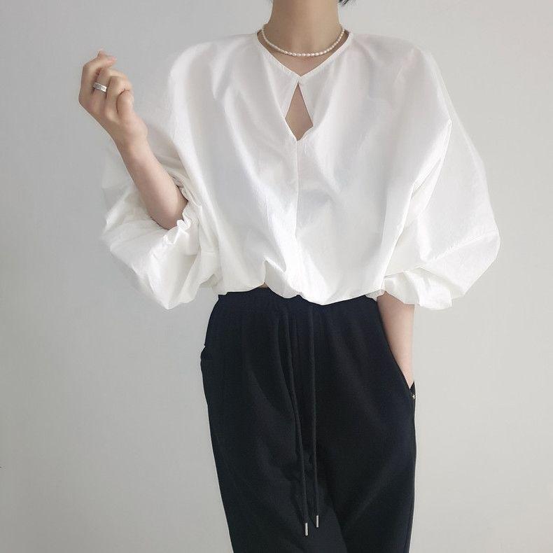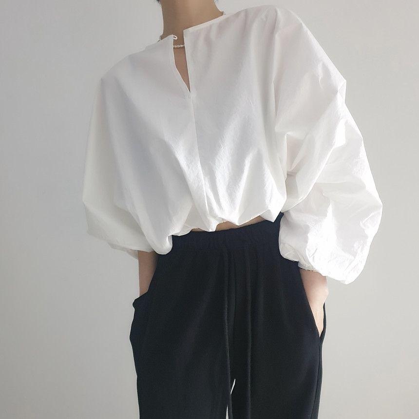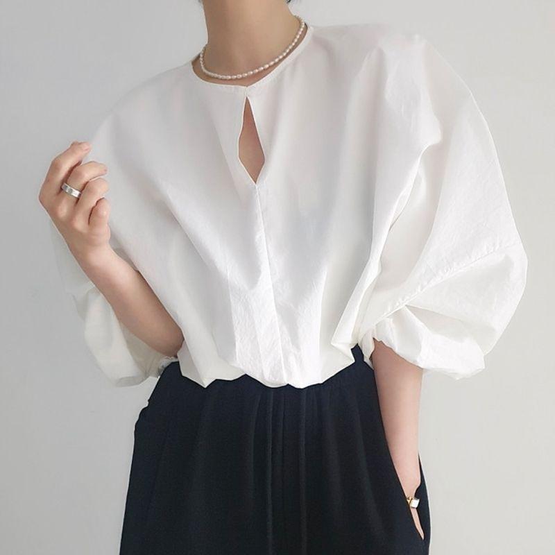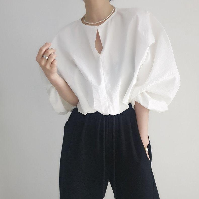 Chic Coreano Verano Nuevo Elegante Cuello Redondo Diseño Cut Out de Un Botón Manga Farol Suelta Camisa Top Protección Solar