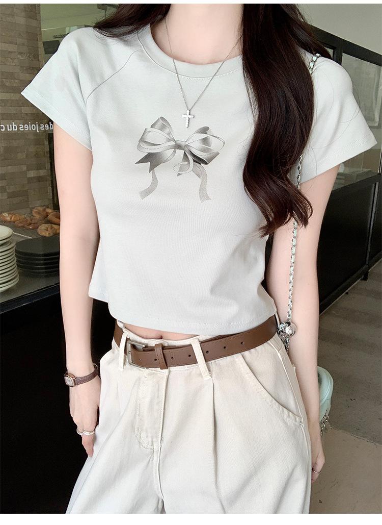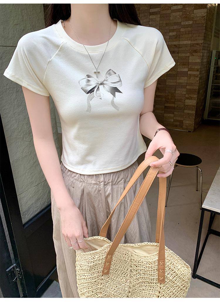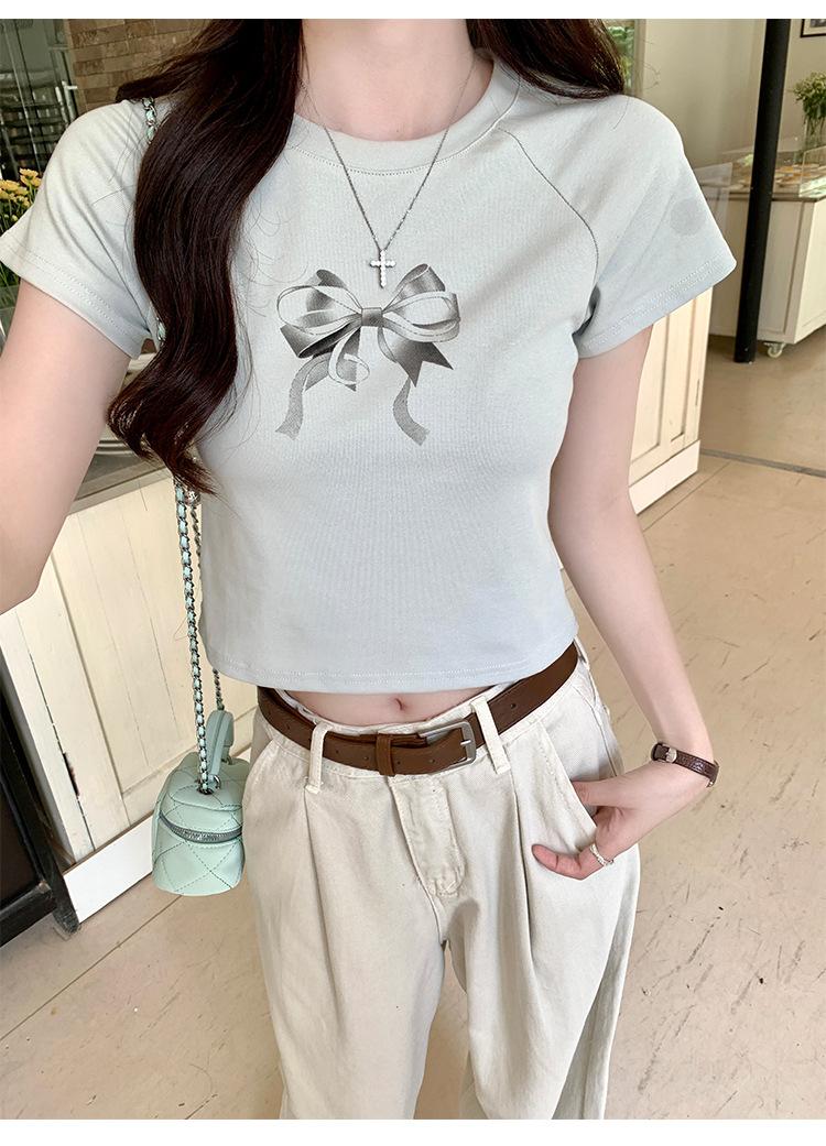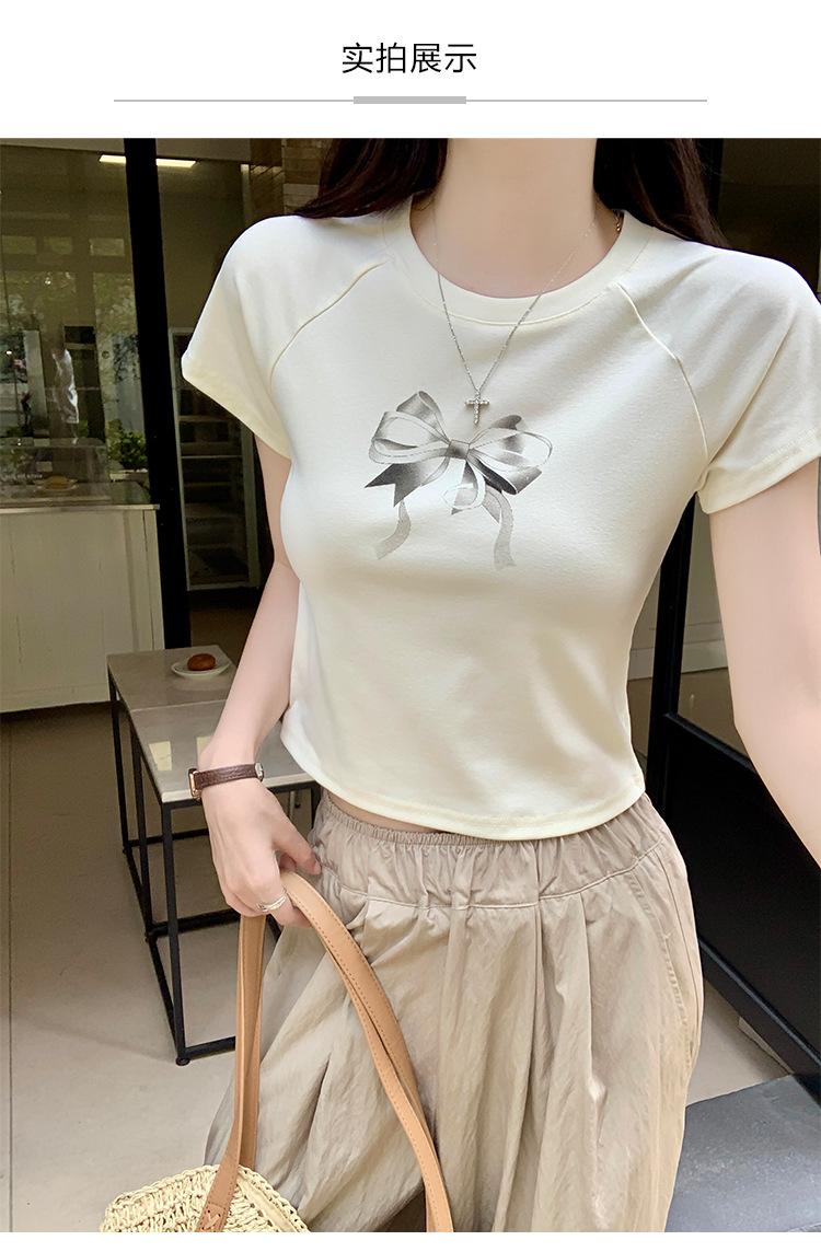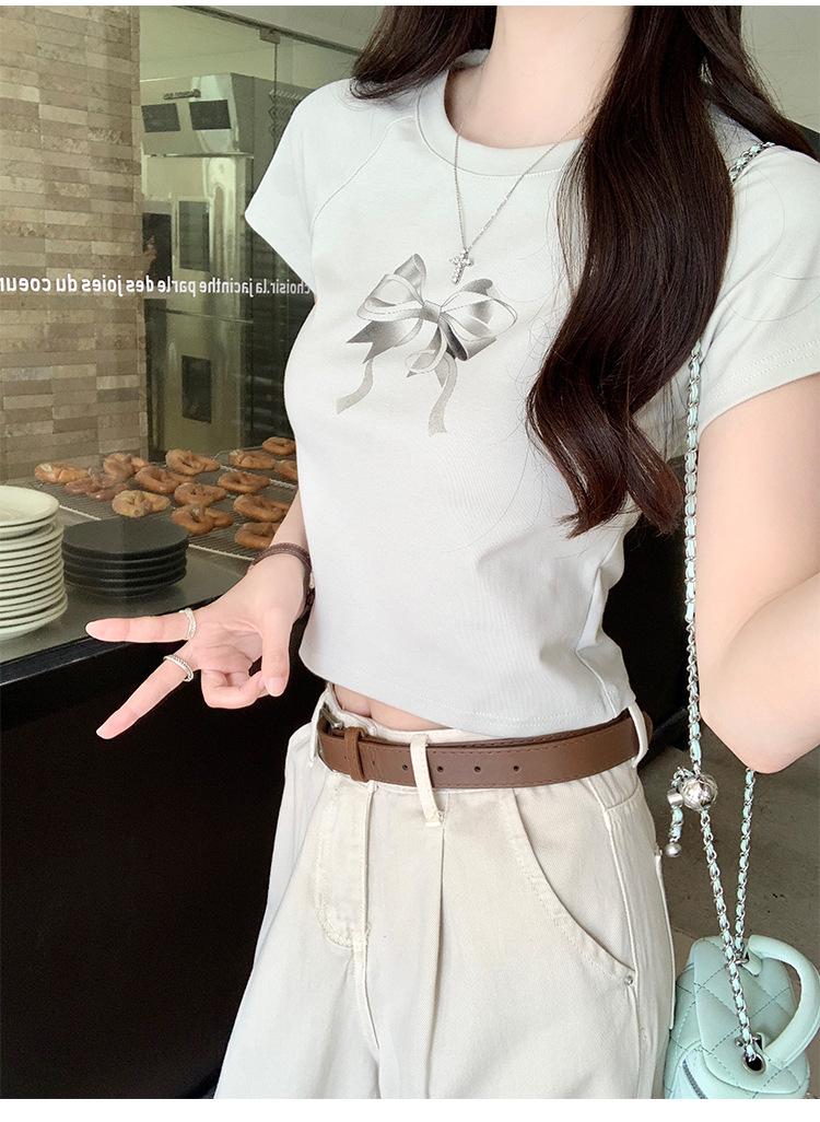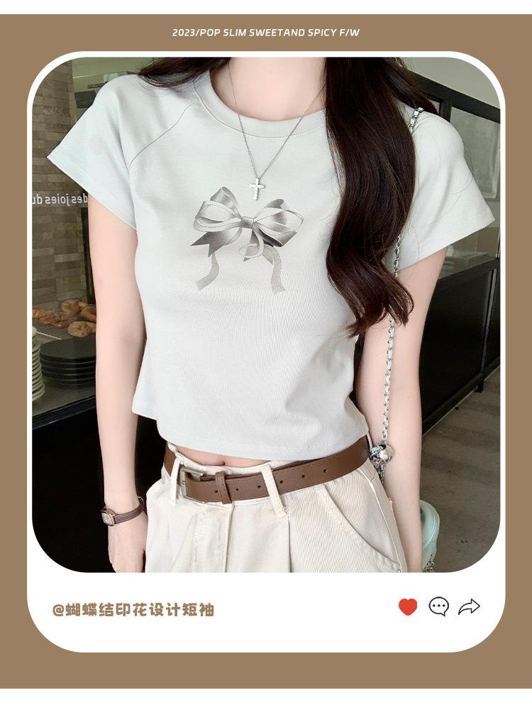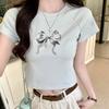 Camiseta de Manga Corta Estampada con Lazo para Mujer Verano 2025 Nuevo Sentido del Diseño Nicho Cuello Redondo Ajustada Top Corto Moderno