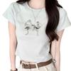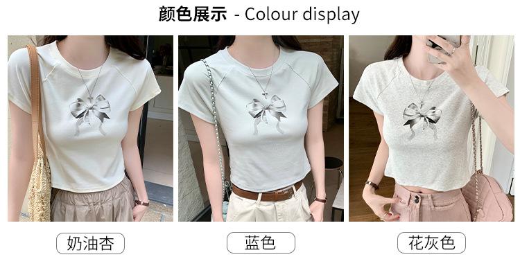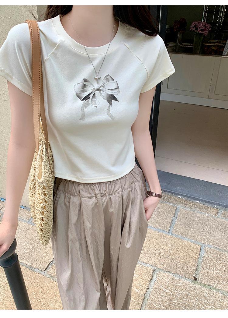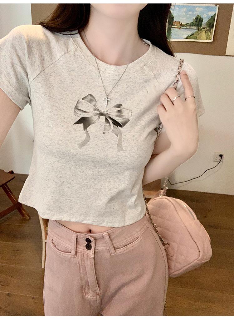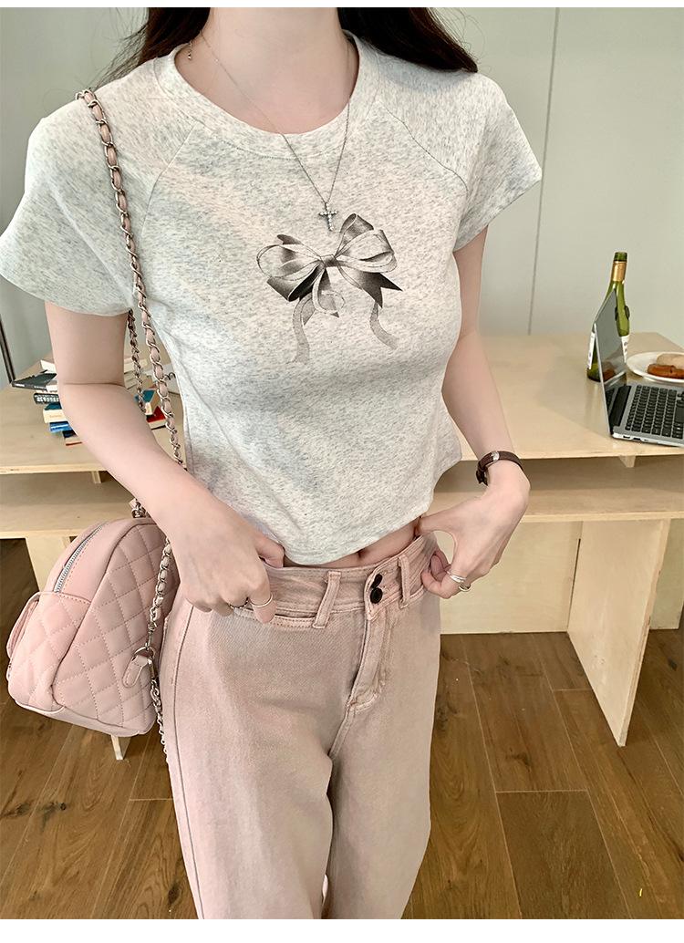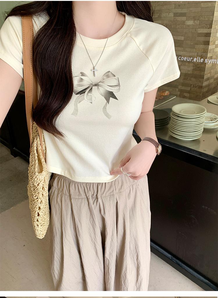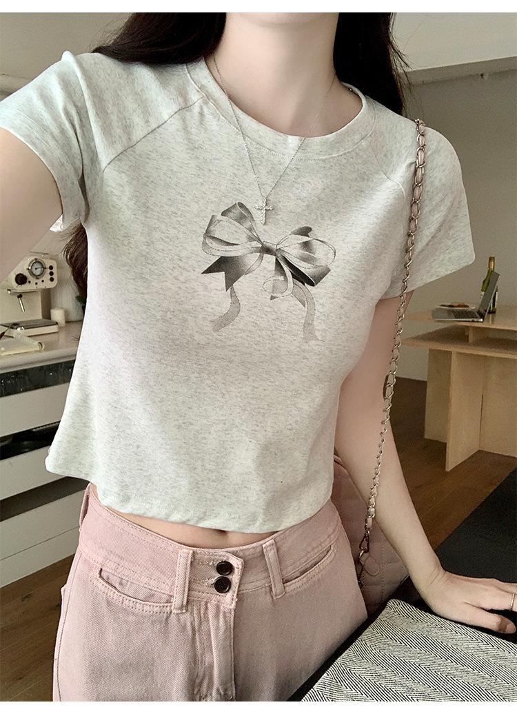Camiseta de Manga Corta Estampada con Lazo para Mujer Verano 2025 Nuevo Sentido del Diseño Nicho Cuello Redondo Ajustada Top Corto Moderno