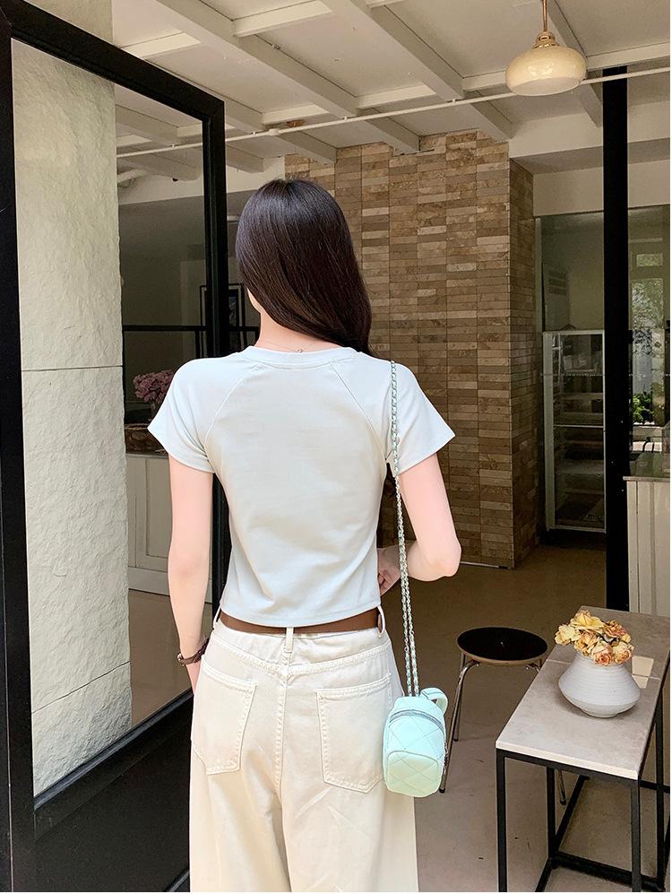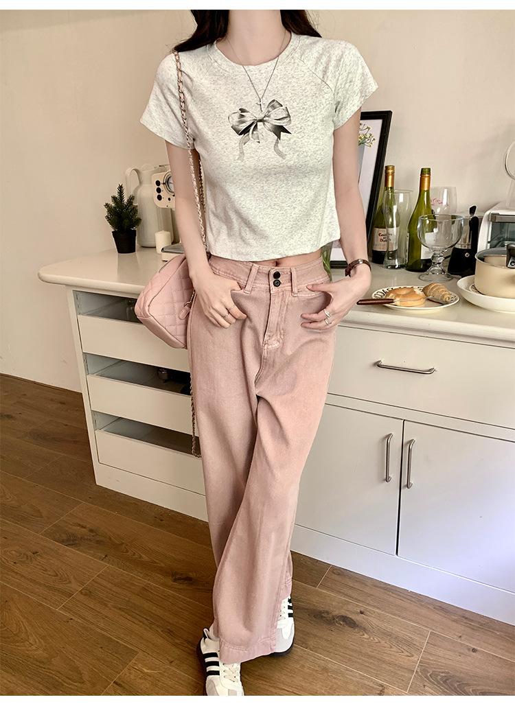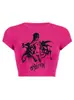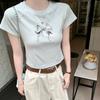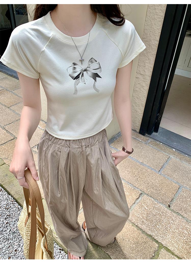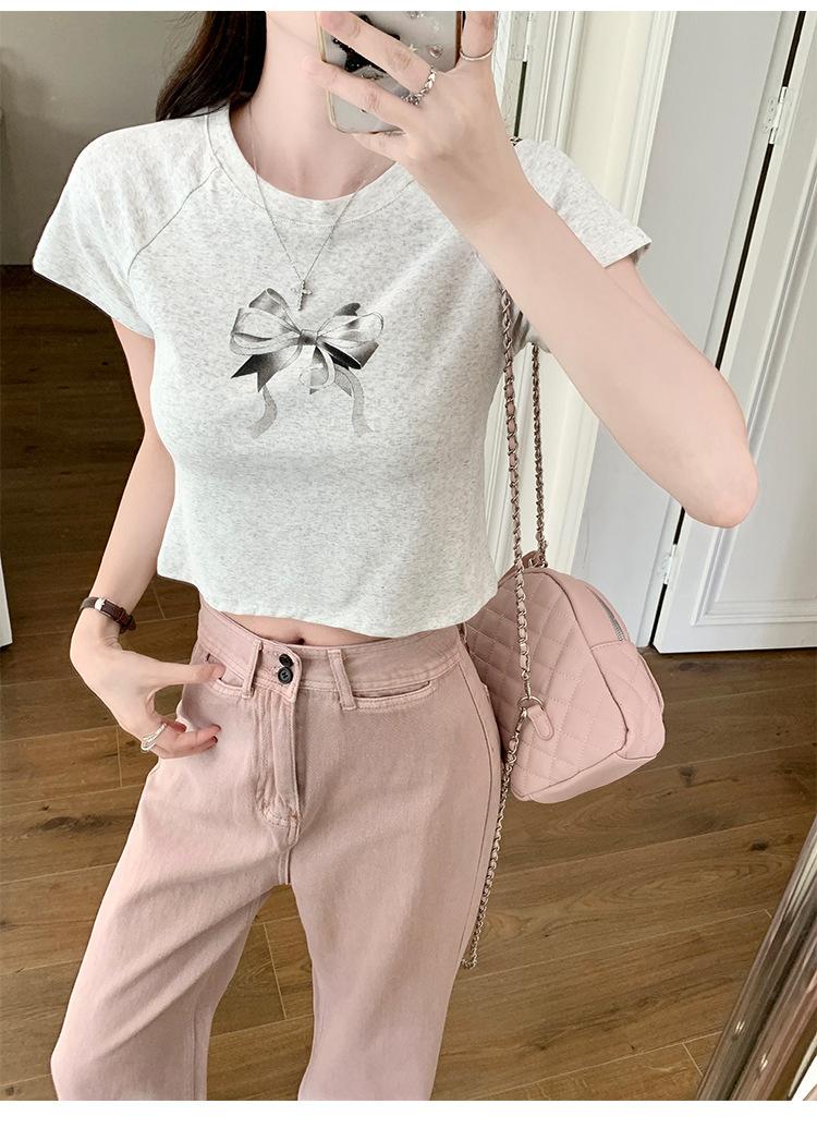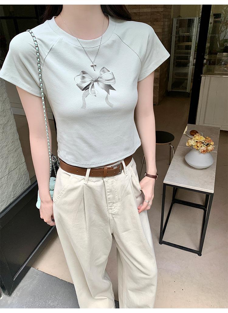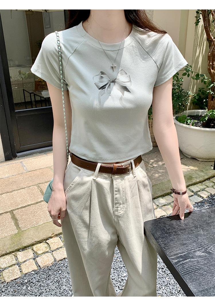 Camiseta de Manga Corta Estampada con Lazo para Mujer Verano 2025 Nuevo Sentido del Diseño Nicho Cuello Redondo Ajustada Top Corto Moderno