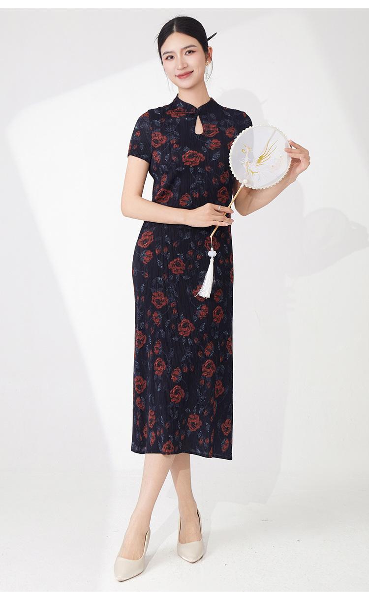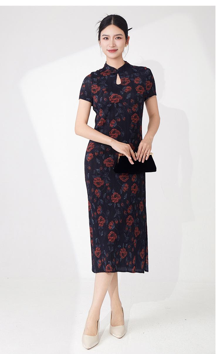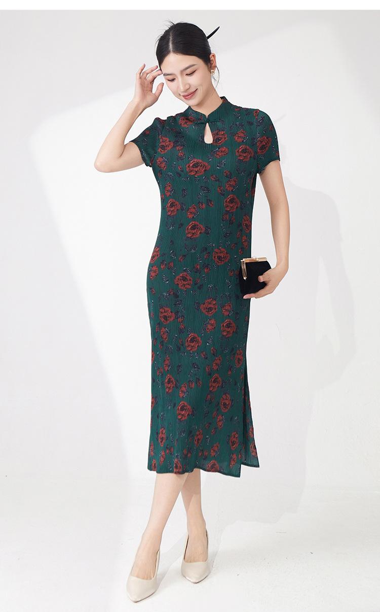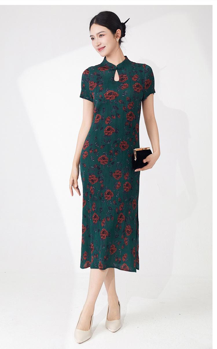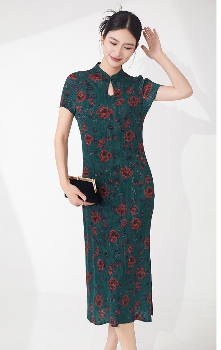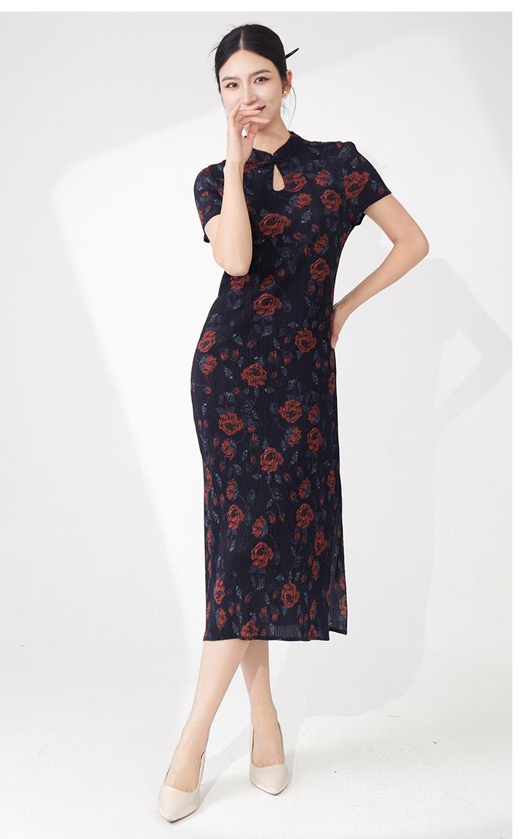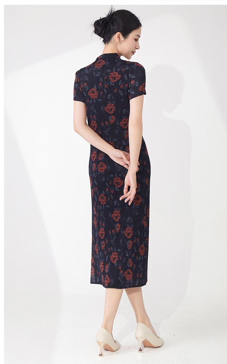 Vestido de mujer de estilo nacional chino nuevo, estilo de alta gama, abertura lateral, cuello vertical con hebilla, largo medio, falda plisada retro para verano