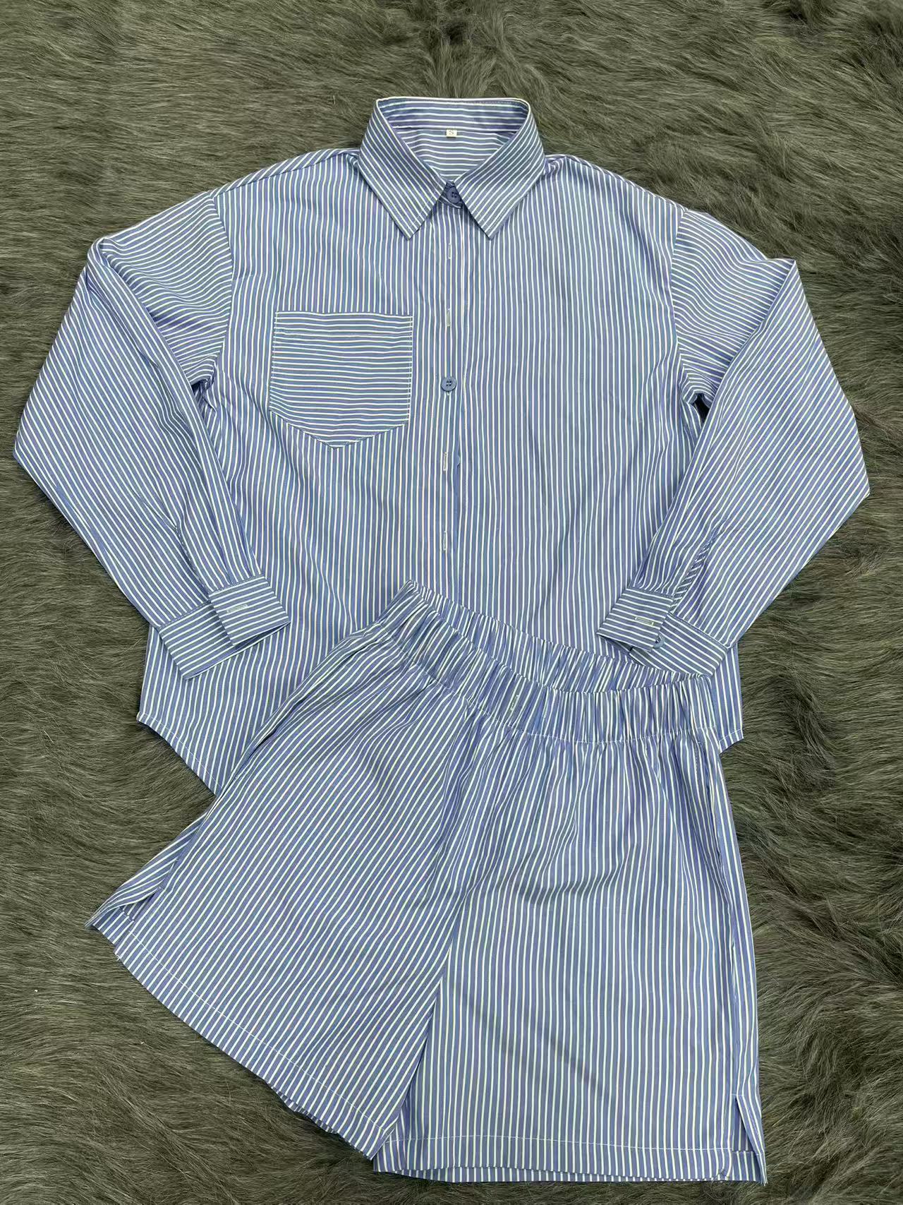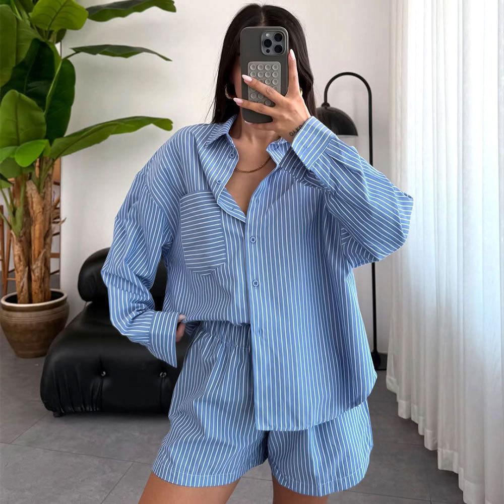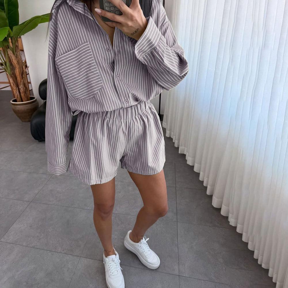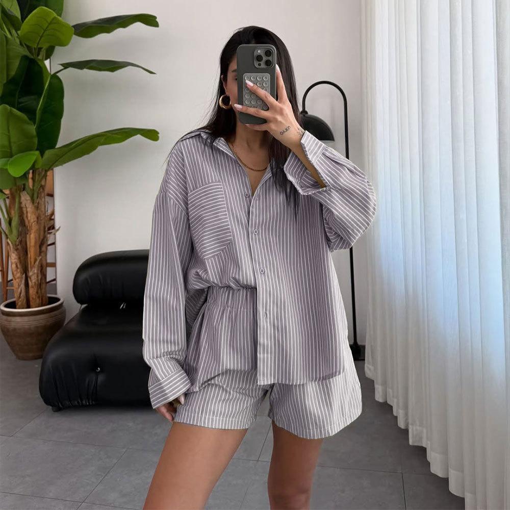 211495 Verano Nuevo Cárdigan Rayado Transfronterizo Europeo y Americano Camisa de Manga Larga para Mujer Traje Shorts de Moda Conjunto de Dos Piezas