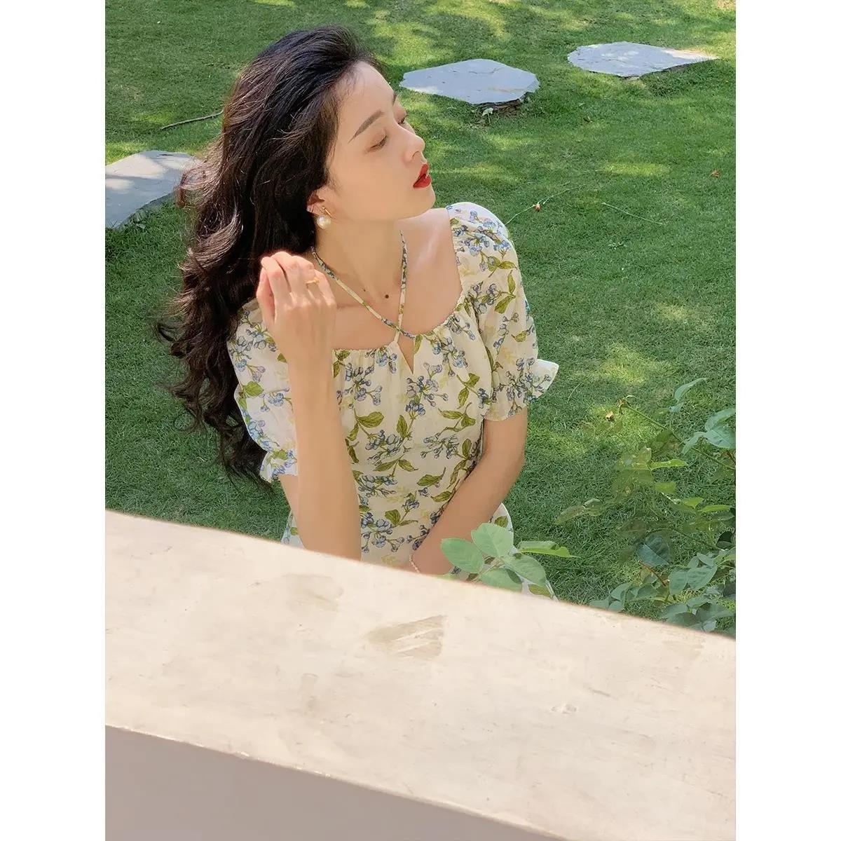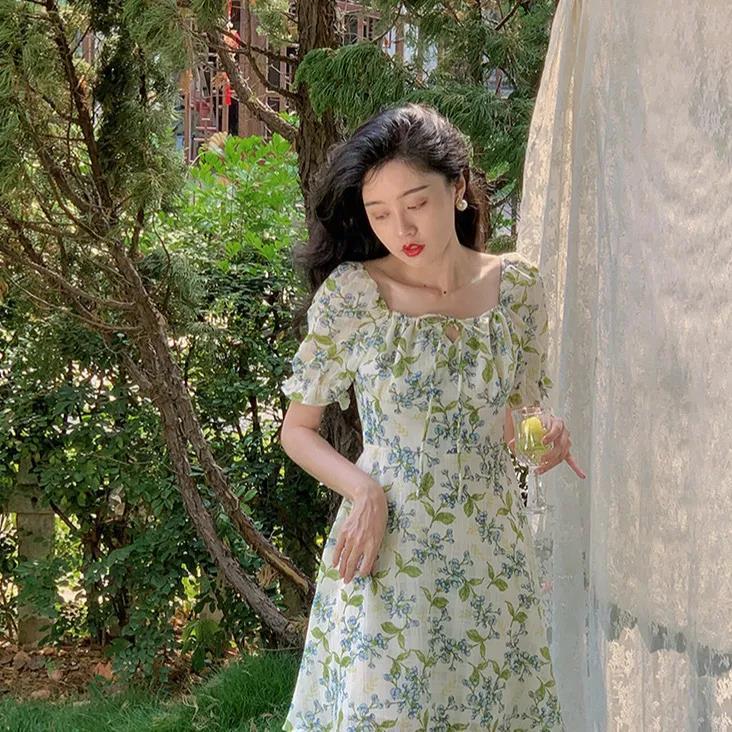 Vestido Floral Tipo Lazo Francés para Mujer, Nuevo Verano Largo Medio de Cintura Alta Adelgazante con Abertura, Cuello Cuadrado Moderno al Por Mayor