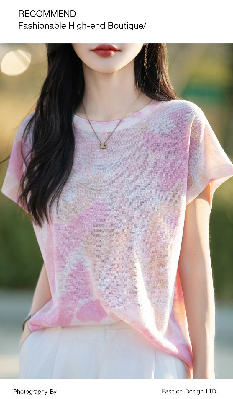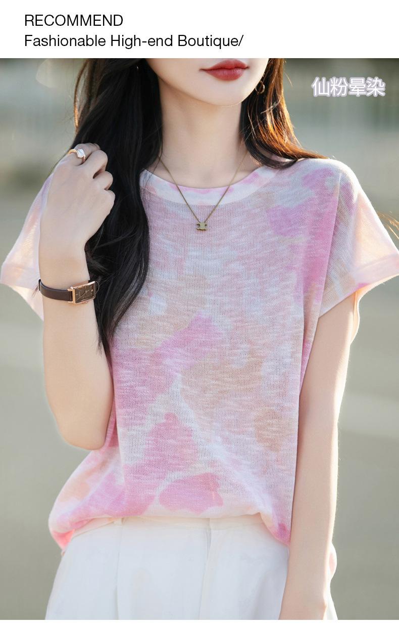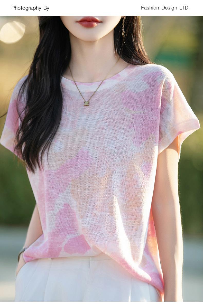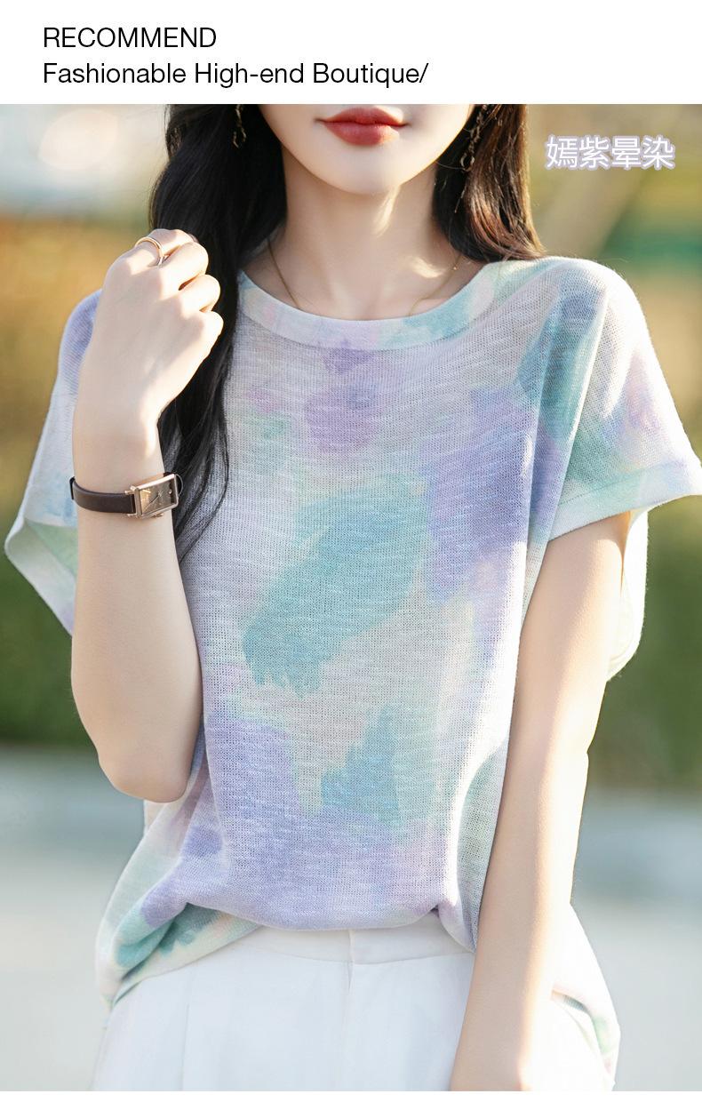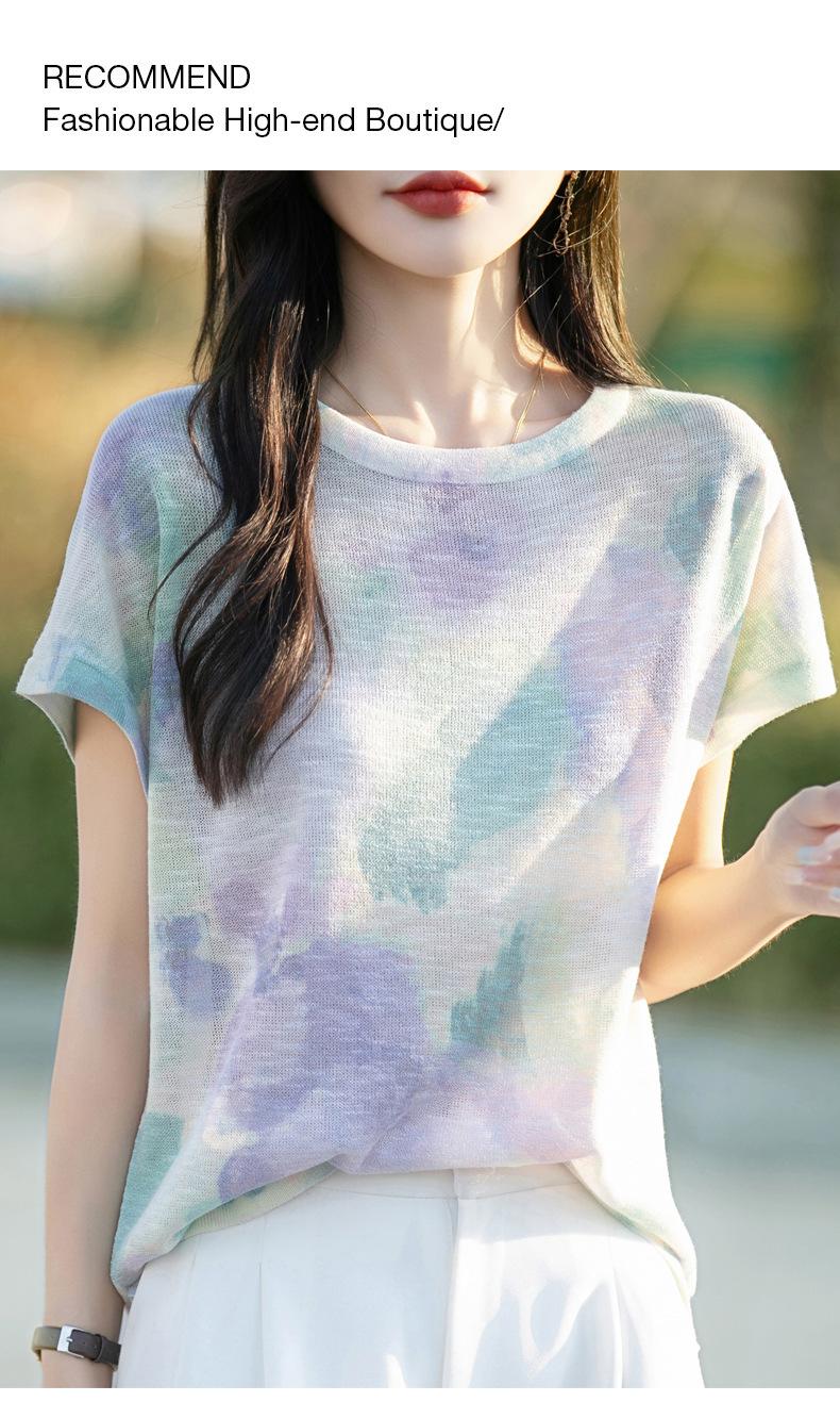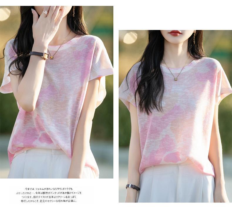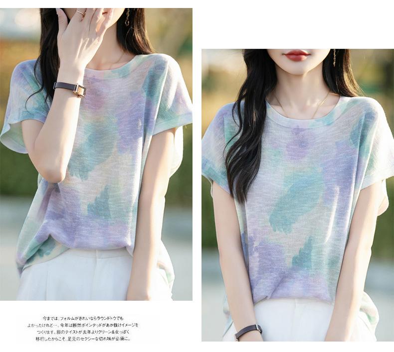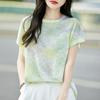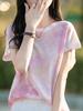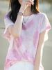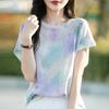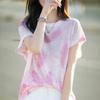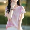 Venta al por mayor Slub 2025 Verano Mujer Nuevo Cuello Redondo Tie-Dye Camiseta Corta Suelta Versátil Elegante Comercio Exterior