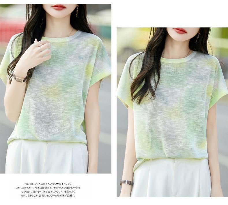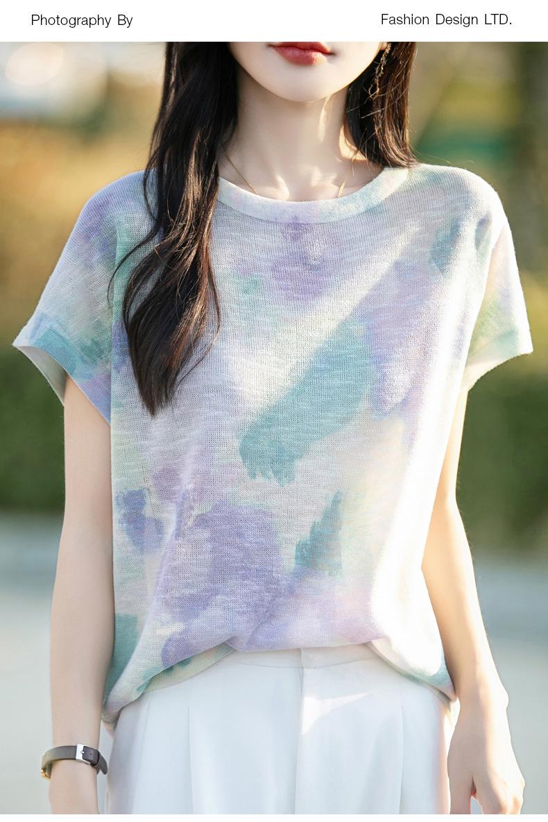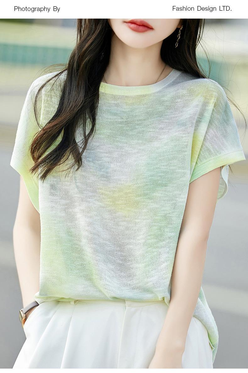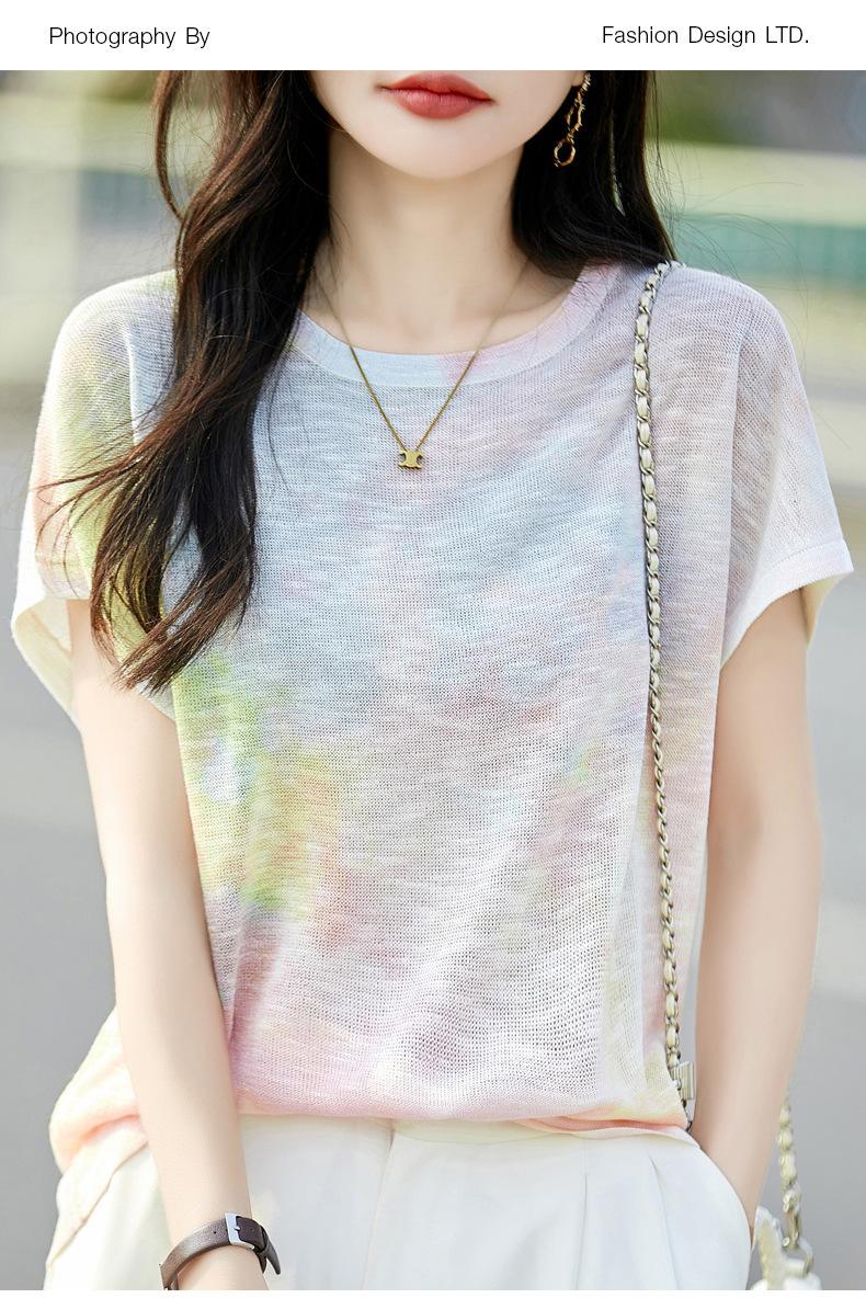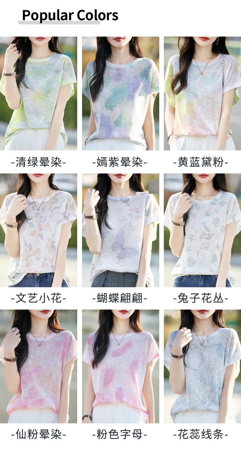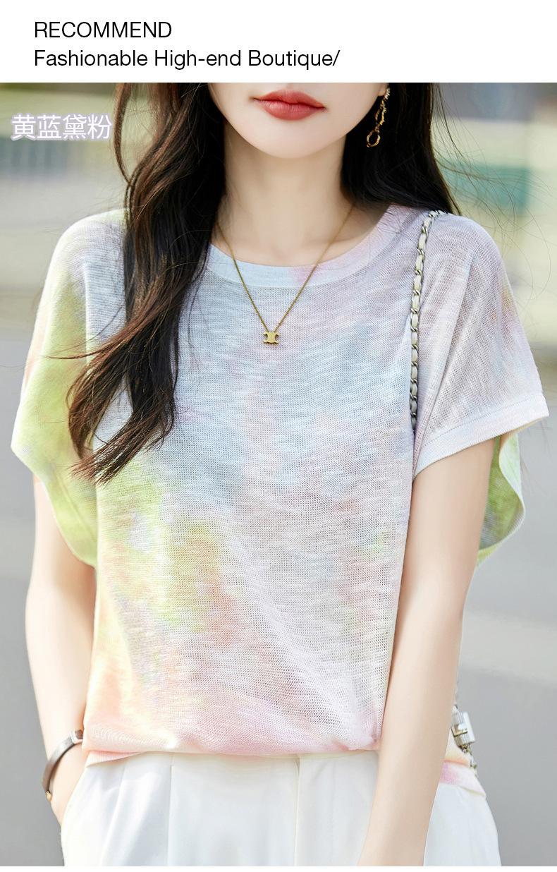 Venta al por mayor Slub 2025 Verano Mujer Nuevo Cuello Redondo Tie-Dye Camiseta Corta Suelta Versátil Elegante Comercio Exterior