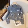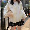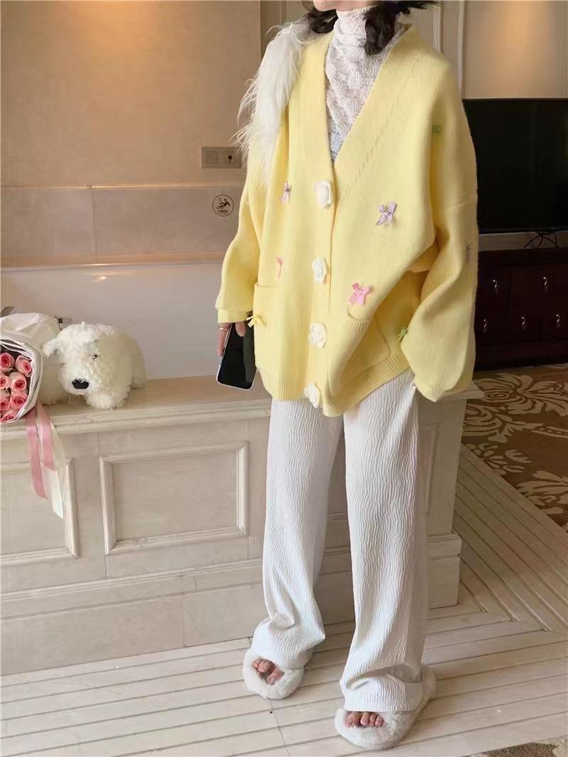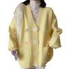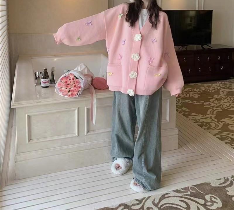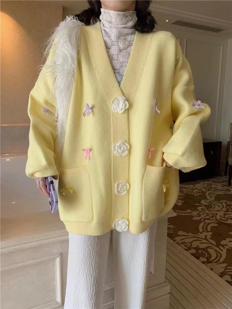 Otoño e Invierno Nuevo Estilo Coreano Estilo Dulce Lazo Cárdigan de Punto Suéter Holgado Universitario Talla Grande Top de Flores para Mujer