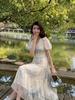 Elegante vestido floral estilo francés para mujer, verano, cintura alta, adelgazante, cuello en V, manga abullonada, dulce, salado, hada, pastel, vestido largo