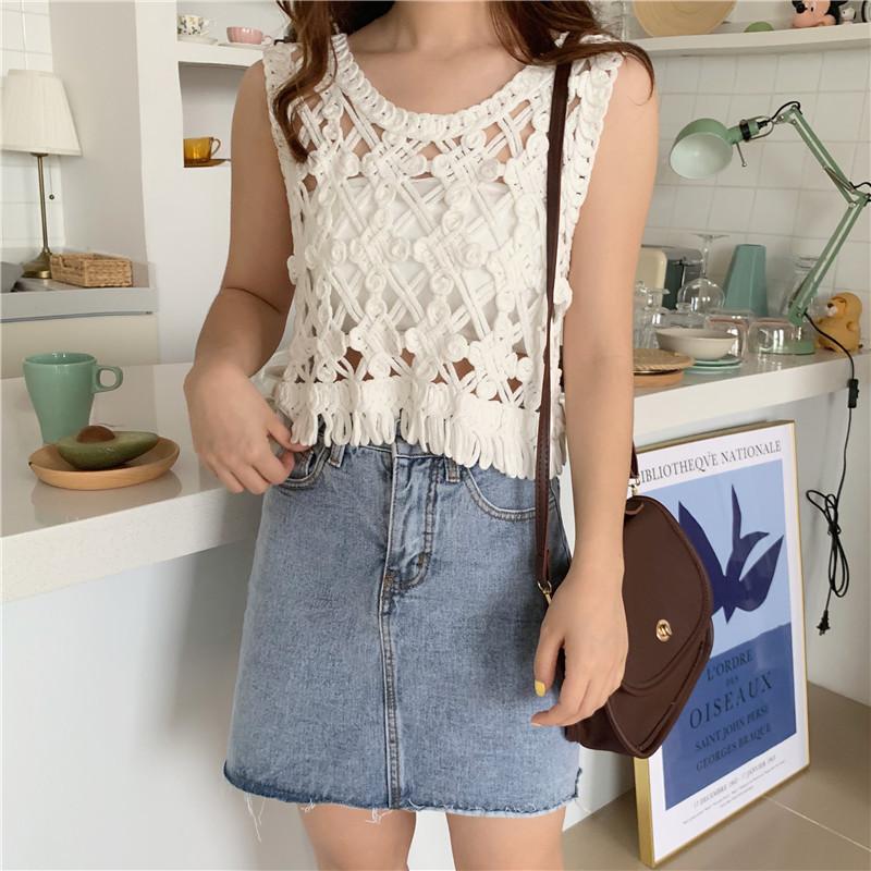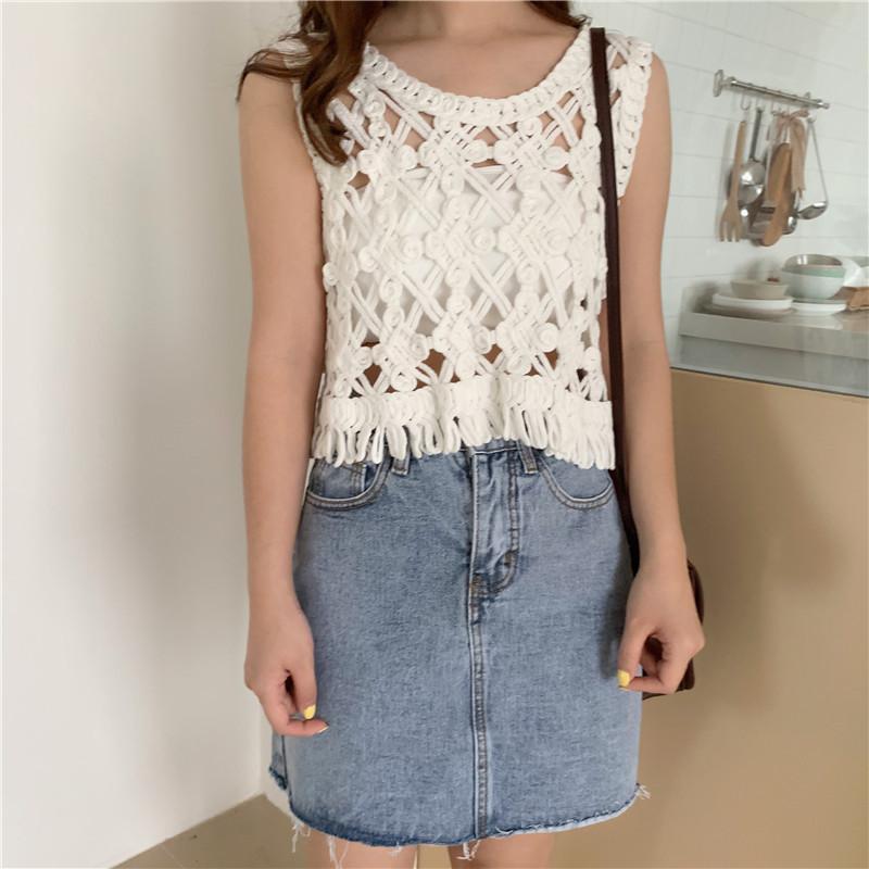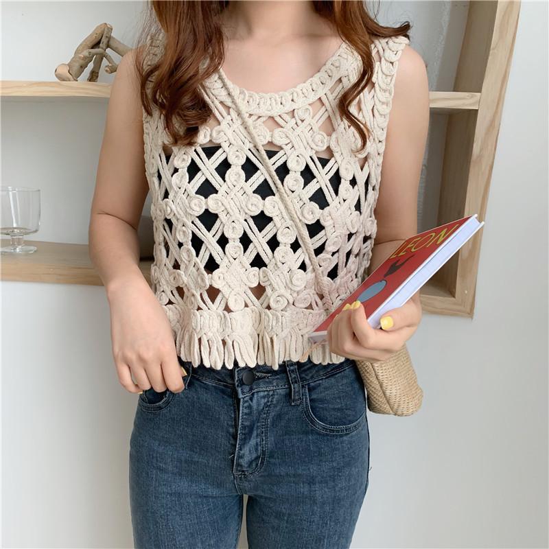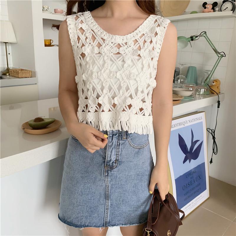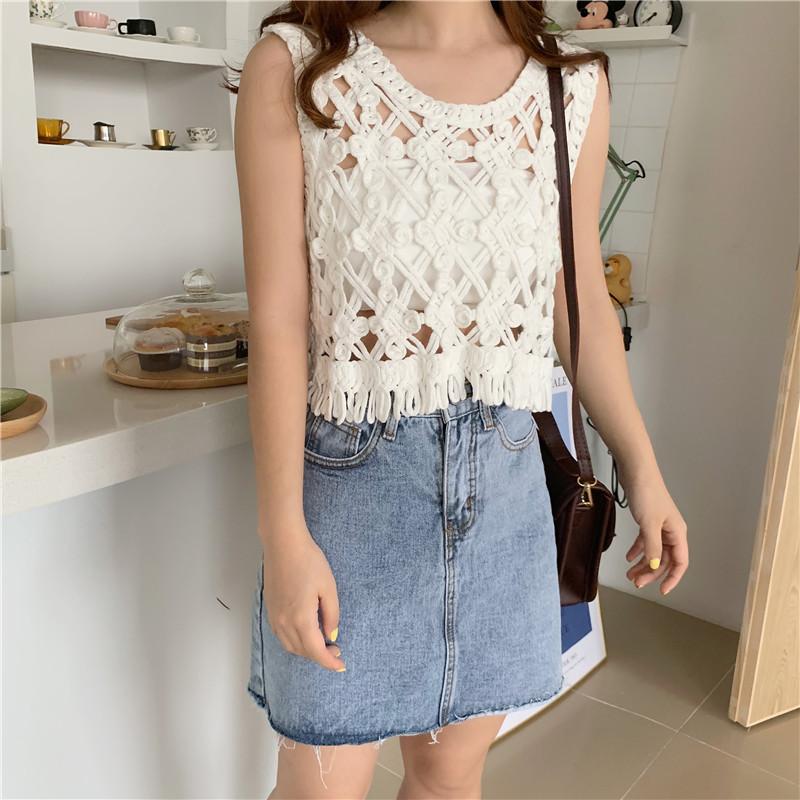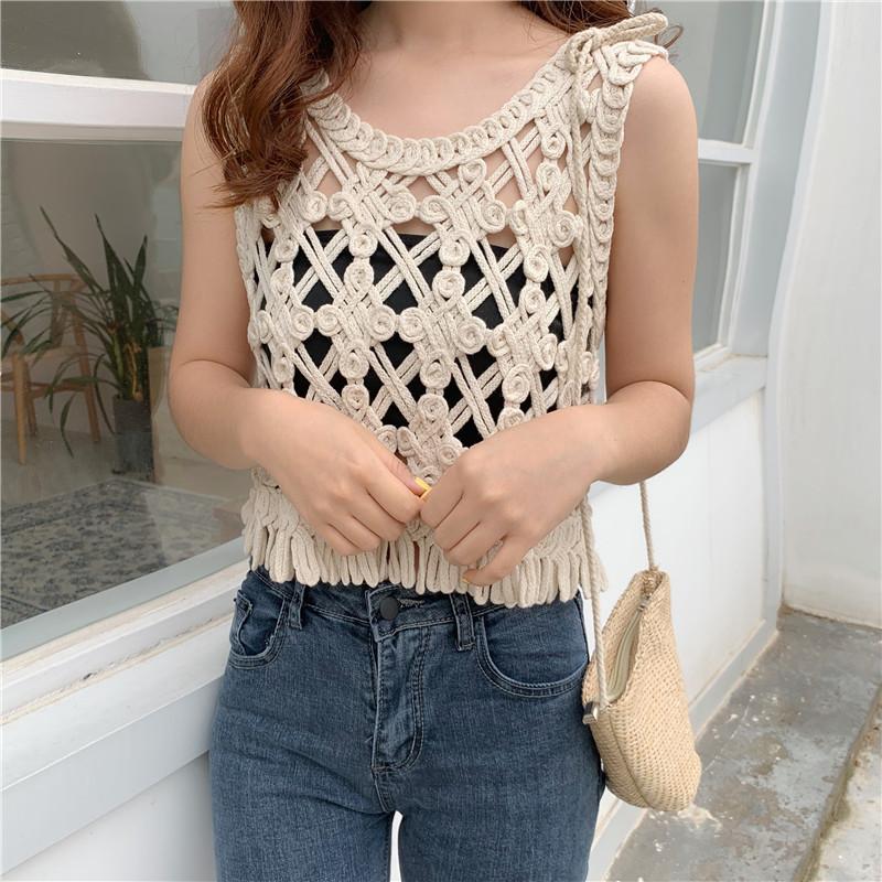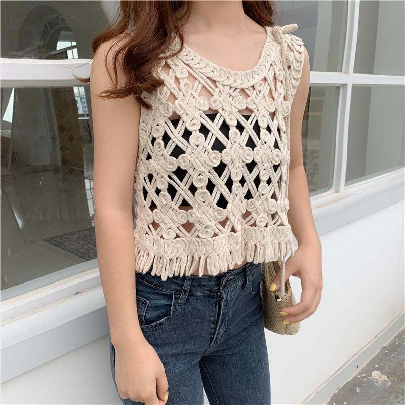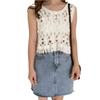 Blusa Top Sexy Corta de Crochet Pequeña con Borlas Huecas para Mujer, Chaleco Sin Mangas Combinable