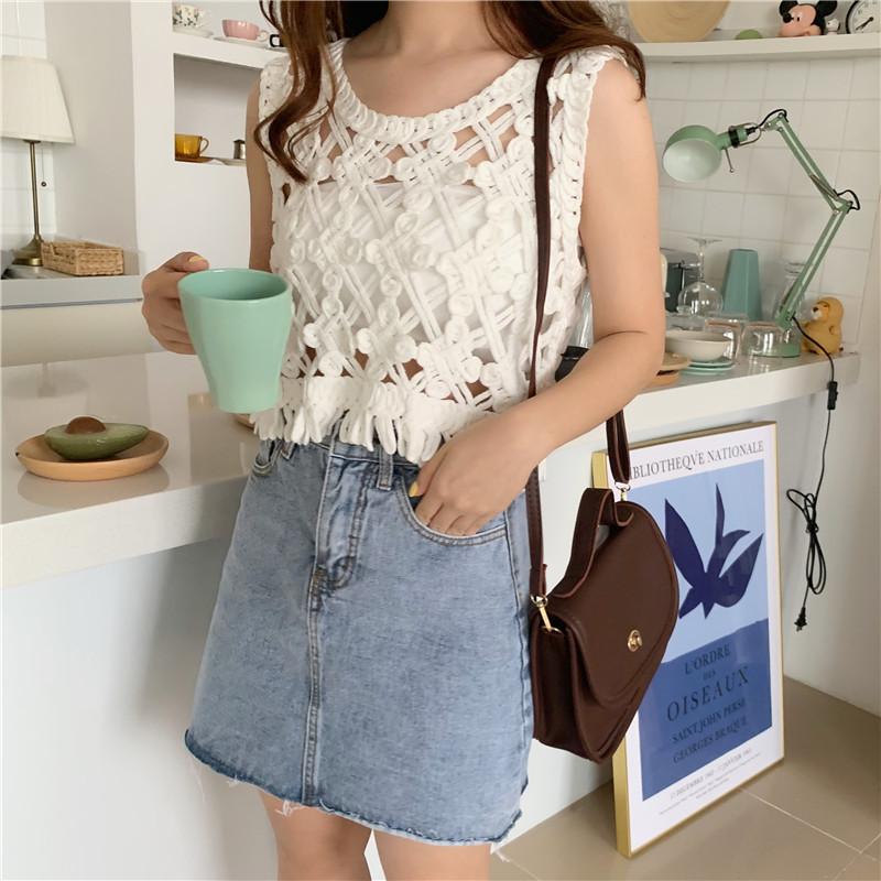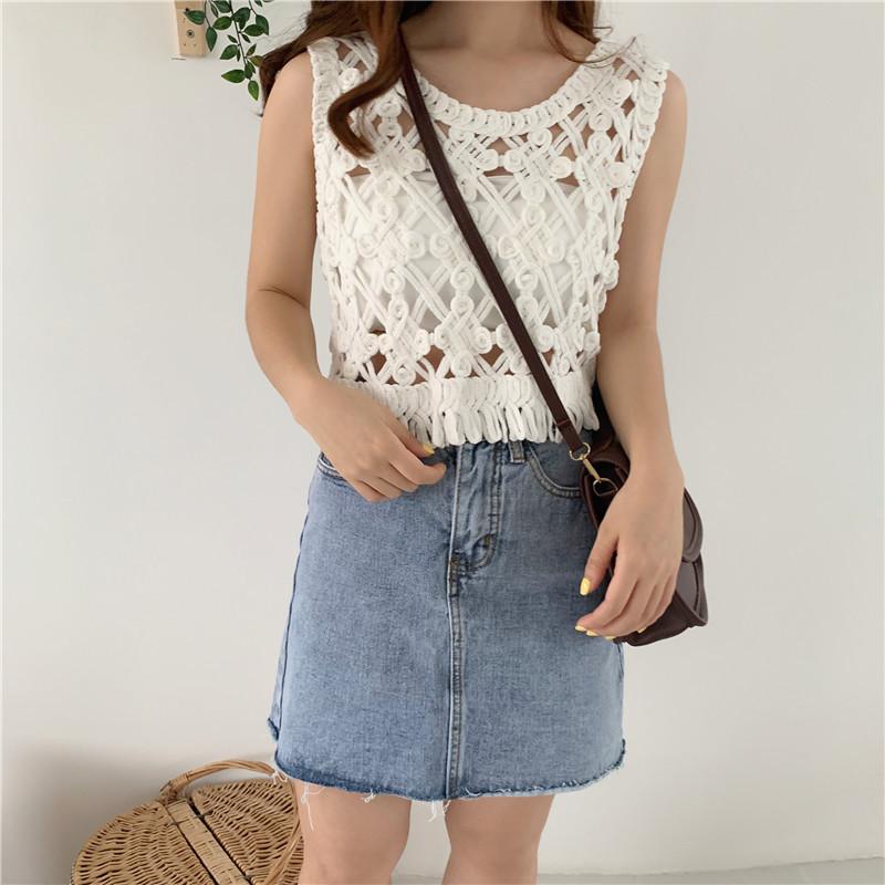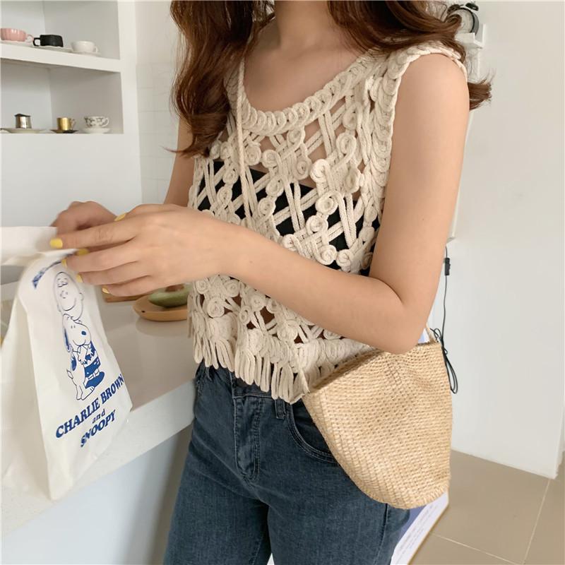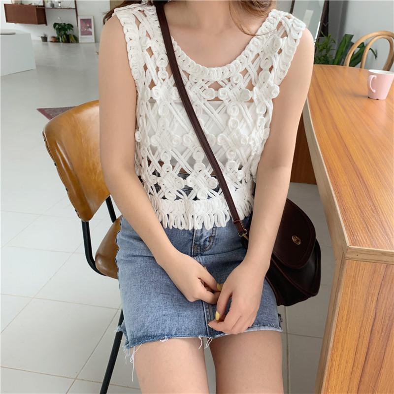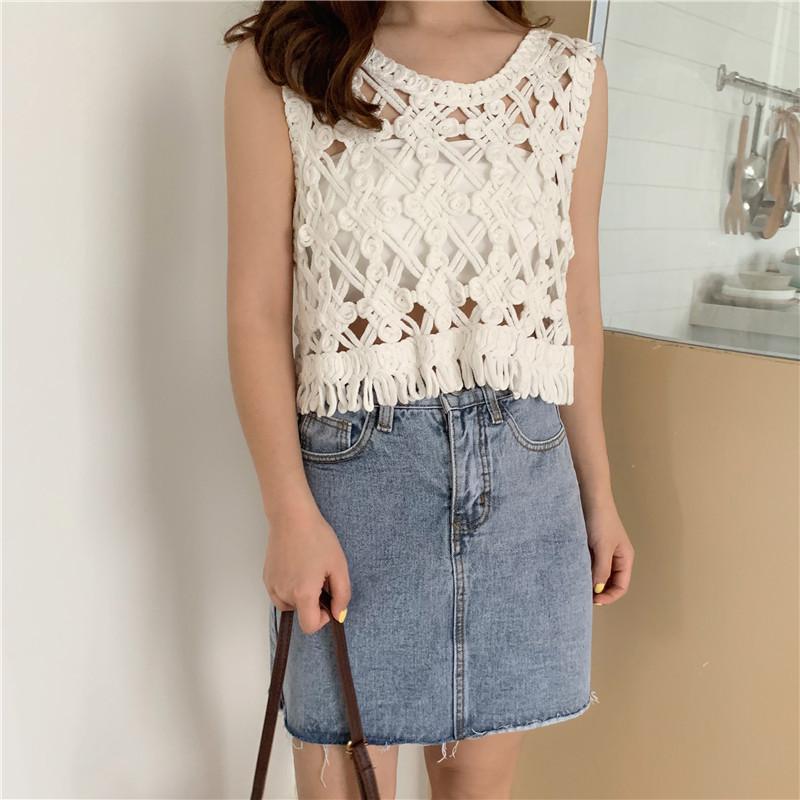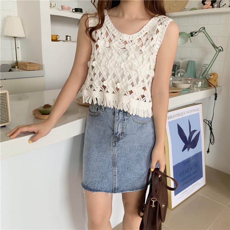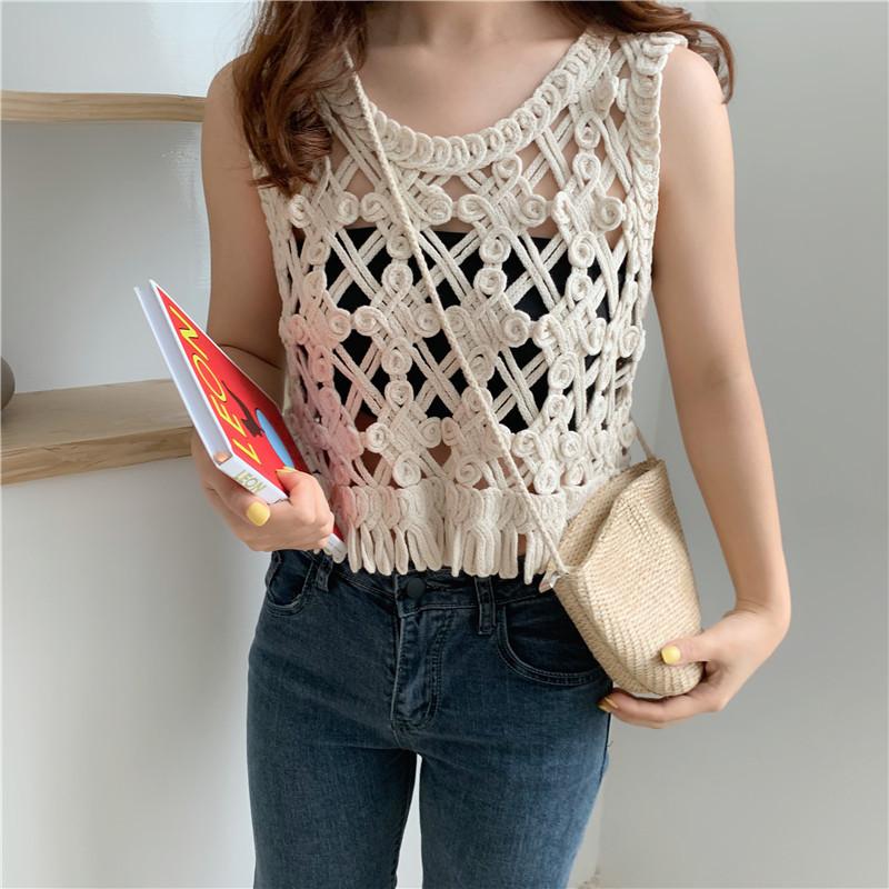 Blusa Top Sexy Corta de Crochet Pequeña con Borlas Huecas para Mujer, Chaleco Sin Mangas Combinable