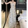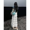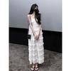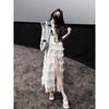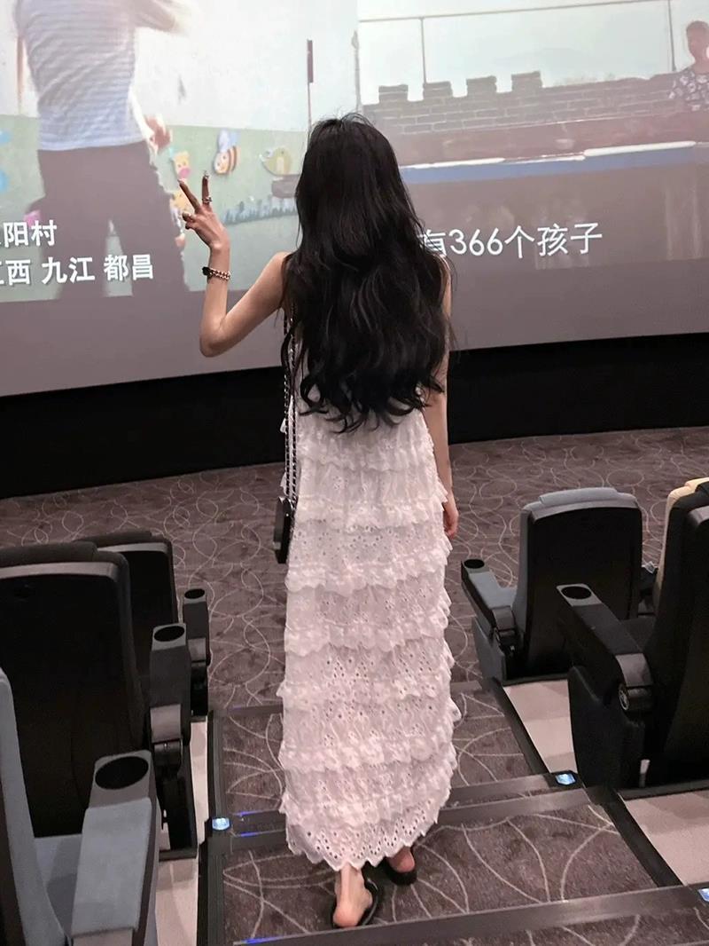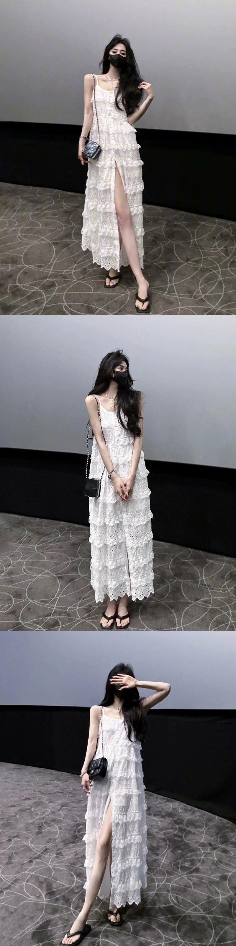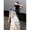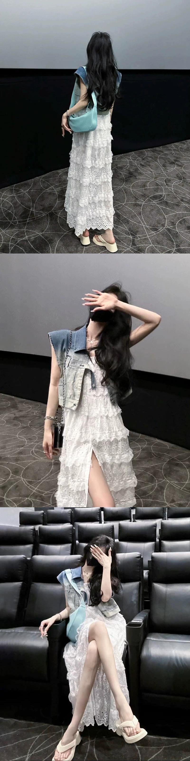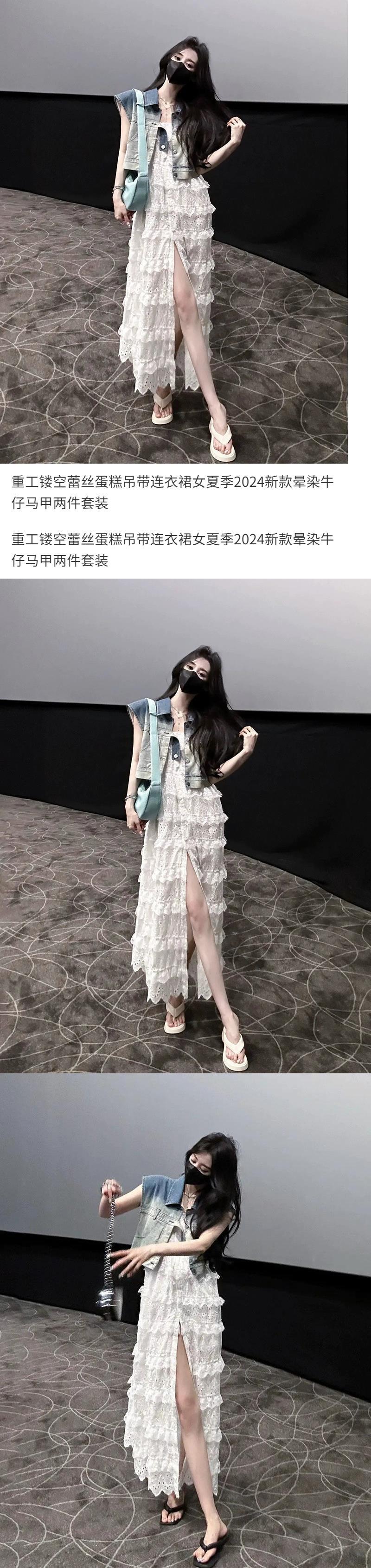 Vestido Suspendido de Encaje Calado de Alta Resistencia para Pastel Traje de Dos Piezas de Chaleco de Mezclilla Deslavada Nuevo de Verano 2024 para Mujer