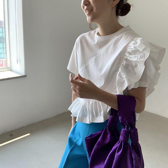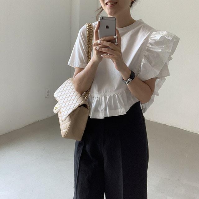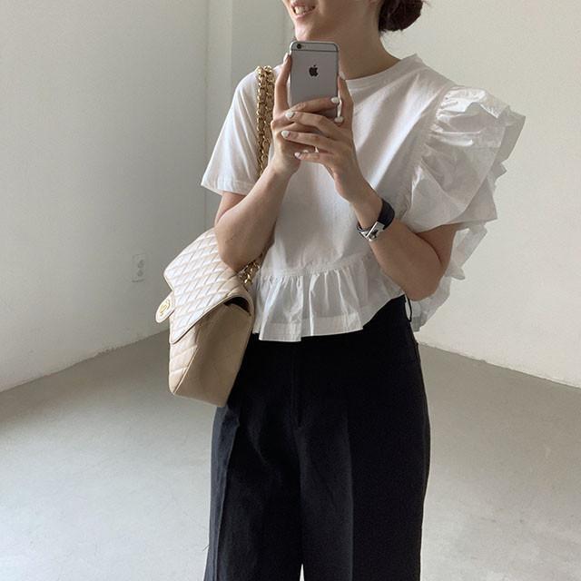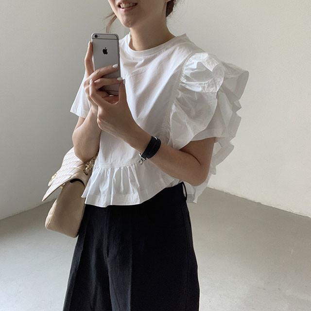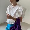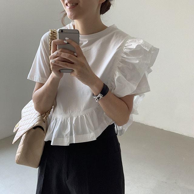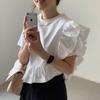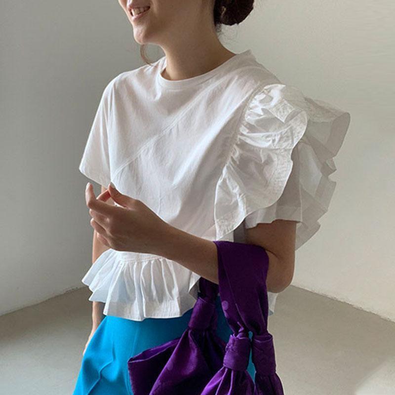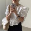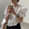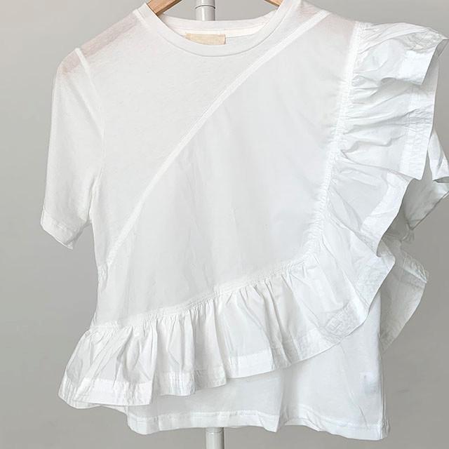 Chic Coreano Verano Nicho Elegante Cuello Redondo Diseño Asimétrico Empalme con Volantes Suelto Casual Camisa de Manga Corta