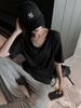 Camiseta de Manga Corta con Cuello en V Negra de Fábrica Estilo Holgado Perezoso Hombro Derecho para Mujer Top Básico Versátil Casual de Gama Alta