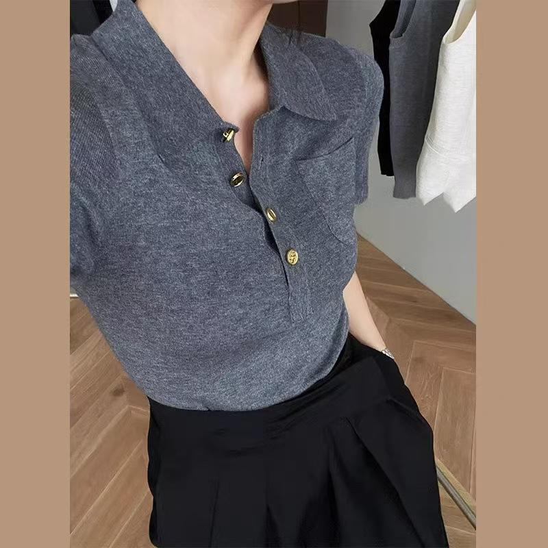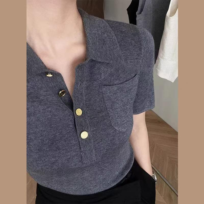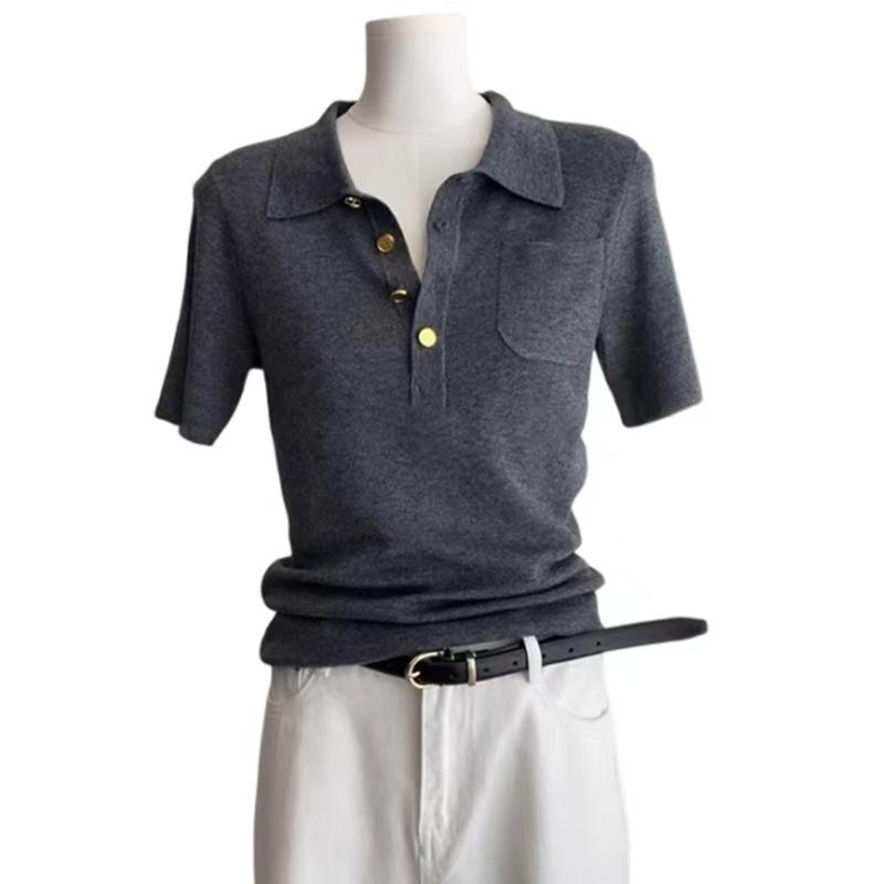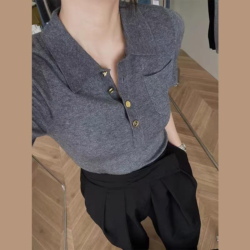 Camisetas de manga corta con temperamento de alta gama en gris francés, hombro recto, cuello polo, tops para mujer, verano 2025, nuevos suéteres