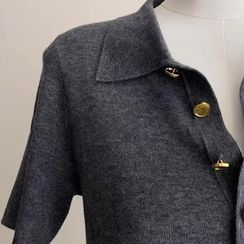 Gris Francés Elegante de Alta Gama Camiseta Top de Manga Corta con Hombros Polo Cuello para Mujer Verano 2025 Nueva Camisa de Punto