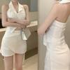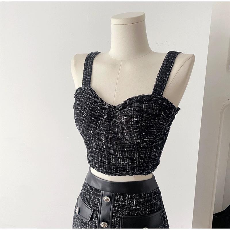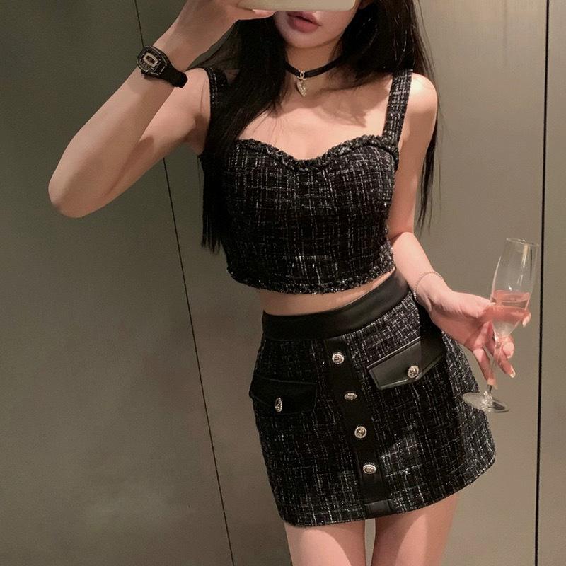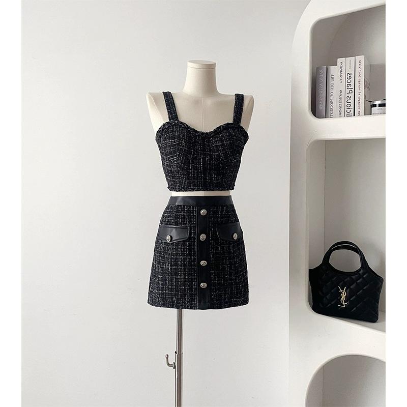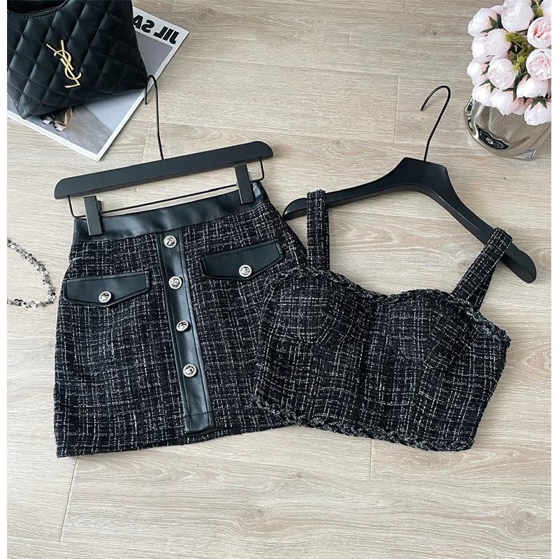 Conjunto de dos piezas casuales de moda para mujer, tweed, estilo Chanel pequeño, top bandeau + falda de cadera, falda corta